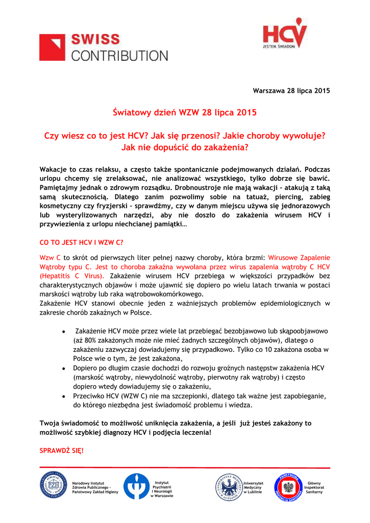 Warszawa 28 lipca 2015 Światowy dzień WZW 28 lipca 2015 Czy wiesz co to jest HCV? Jak się przenosi? Jakie choroby wywołuje? Jak nie dopuścić do zakażenia? Wakacje to czas relaksu, a często także spontanicznie podejmowanych działań. Podczas urlopu chcemy się zrelaksować, nie analizować wszystkiego, tylko dobrze się bawić. Pamiętajmy jednak o zdrowym rozsądku. Drobnoustroje nie mają wakacji – atakują z taką samą skutecznością. Dlatego zanim pozwolimy sobie na tatuaż, piercing, zabieg kosmetyczny czy fryzjerski – sprawdźmy, czy w danym miejscu używa się jednorazowych lub wysterylizowanych narzędzi, aby nie doszło do zakażenia wirusem HCV i przywiezienia z urlopu niechcianej pamiątki… CO TO JEST HCV I WZW C? Wzw C to skrót od pierwszych liter pełnej nazwy choroby, która brzmi: Wirusowe Zapalenie Wątroby typu C. Jest to choroba zakaźna wywołana przez wirus zapalenia wątroby C HCV (Hepatitis C Virus). Zakażenie wirusem HCV przebiega w większości przypadków bez charakterystycznych objawów i może ujawnić się dopiero po wielu latach trwania w postaci marskości wątroby lub raka wątrobowokomórkowego. Zakażenie HCV stanowi obecnie jeden z ważniejszych problemów epidemiologicznych w zakresie chorób zakaźnych w Polsce. Zakażenie HCV może przez wiele lat przebiegać bezobjawowo lub skąpoobjawowo (aż 80% zakażonych może nie mieć żadnych szczególnych objawów), dlatego o zakażeniu zazwyczaj dowiadujemy się przypadkowo. Tylko co 10 zakażona osoba w Polsce wie o tym, że jest zakażona, Dopiero po długim czasie dochodzi do rozwoju groźnych następstw zakażenia HCV (marskość wątroby, niewydolność wątroby, pierwotny rak wątroby) i często dopiero wtedy dowiadujemy się o zakażeniu, Przeciwko HCV (WZW C) nie ma szczepionki, dlatego tak ważne jest zapobieganie, do którego niezbędna jest świadomość problemu i wiedza. Twoja świadomość to możliwość uniknięcia zakażenia, a jeśli już jesteś zakażony to możliwość szybkiej diagnozy HCV i podjęcia leczenia! SPRAWDŹ SIĘ! Narodowy Instytut Zdrowia Publicznego – Państwowy Zakład Higieny Instytut Psychiatrii I Neurologii w Warszawie Uniwersytet Medyczny w Lublinie Główny Inspektorat Sanitarny Objawy występują rzadko, ale jeżeli od dłuższego czasu nie czujesz się dobrze i odczuwasz: zmęczenie, bóle stawowe bóle brzucha objawy dyspeptyczne świąd skóry bóle mięśniowe lub jeśli wystąpiły u Ciebie żółtaczka (lub tylko zażółcenie białkówek oczu), nudności, wymioty i ściemnienie moczu, być może doszło u Ciebie do zakażenia wirusem HCV. JAK MOŻE DOJŚĆ DO ZAKAŻENIA? Najczęściej do zakażenia HCV dochodzi tam, gdzie wykonywane są zabiegi z naruszeniem ciągłości tkanek i może dojść do kontaktu uszkodzonej skóry lub błon śluzowych z krwią osób zakażonych: • w placówkach ochrony zdrowia (zastrzyki, kroplówki, zabiegi i operacje chirurgiczne, dializy, endoskopie) • w gabinetach stomatologicznych (zabiegi stomatologiczne, wszczepianie implantów) • w gabinetach kosmetycznych (przekłuwanie uszu, botox, manicure, pedicure) • w gabinetach akupunktury • w zakładach fryzjerskich (podgalanie maszynką, brzytwą, zranienie nożyczkami) • w studiach tatuażu i piercingu • przy dożylnym lub donosowym przyjmowaniu narkotyków podczas wspólnego korzystania z akcesoriów • przy wspólnym korzystaniu z maszynki do golenia, cążek do manicure a nawet szczoteczki do zębów • przy kontakcie z krwią w związku z wykonywaną pracą bądź przypadkowo, np. podczas wypadku, bójki; również uprawiając sporty kontaktowe – judo, boks) • na drodze wertykalnej, kiedy dochodzi do zakażenia dziecka przez matkę w czasie ciąży i porodu • podczas kontaktów seksualnych bez zabezpieczenia, szczególnie wśród mężczyzn uprawiający seks z mężczyznami PAMIĘTAJ! Wirus HCV przenosi się przez krew. Każdy zabieg i sytuacja, podczas których dochodzi do naruszenia ciągłości skóry lub błon śluzowych, stanowi ryzyko zakażenia, jeśli jednocześnie dojdzie do kontaktu z krwią osoby zakażonej. Nie tylko podczas zabiegów medycznych możemy mieć kontakt z krwią! Wykonując zabiegi kosmetyczne, robiąc tatuaż, zacinając się podczas strzyżenia, a zwłaszcza podczas wstrzykiwania narkotyku lub innej substancji, jeśli sprzęt nie jest jednorazowego Narodowy Instytut Zdrowia Publicznego – Państwowy Zakład Higieny Instytut Psychiatrii I Neurologii w Warszawie Uniwersytet Medyczny w Lublinie Główny Inspektorat Sanitarny użytku lub nie został wysterylizowany po poprzednim użyciu może dojść do kontaktu z cudzą krwią! Jest to ryzyko zakażenia HCV. Zgłoś się do lekarza, który przeprowadzi z Tobą wywiad i doradzi, czy powinieneś/powinnaś sprawdzić czy jesteś zakażony wirusem HCV i poddać się testom diagnostycznym. PAMIĘTAJ! Zakażenie wirusem HCV można obecnie skutecznie leczyć. Trzeba jednak wykryć je, najlepiej zanim dojdzie do uszkodzenia wątroby. Zapraszamy na stronę: www.hcv.pzh.gov.pl DODATKOWE INFORMACJE: W Polsce Ogólnopolska Kampania Społeczna pt. „HCV jestem świadom” realizowana jest w ramach Projektu „Zapobieganie zakażeniom HCV”, którego nadrzędnym celem jest edukacja, gdyż najskuteczniejszym sposobem przeciwdziałania szerzeniu się HCV jest podnoszenie świadomości społeczeństwa. Ogólnopolski Projekt „Zapobieganie zakażeniom HCV”, współfinansowany jest przez Szwajcarię w ramach szwajcarskiego programu współpracy z nowymi krajami członkowskimi Unii Europejskiej oraz Ministra Zdrowia, a koordynowany przez Narodowy Instytut Zdrowia Publicznego-PZH (więcej na www.hcv.pzh.gov.pl ). Na świecie wirusowe zapalenie wątroby jest czwartą chorobą uznaną przez WHO (obok malarii, gruźlicy i HIV/AIDS), jako ta, która wymaga najwięcej uwagi i podejmowania działań edukacyjnych, mających na celu jak najszybsze podniesienia świadomości zdrowotn