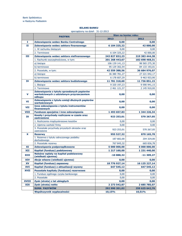 Bank Spółdzielczy w Radzyniu Podlaskim BILANS BANKU sporządzony na dzień 31-12-2013 PASYWA I Zobowiązania wobec Banku Centralnego II Zobowiązania wobec sektora finansowego Stan na koniec roku: 2013 0,00 6 104 325,22 42 000,00 1. W rachunku bieżącym 0,00 0,00 6 104 325,22 42 000,00 Zobowiązania wobec sektora niefinansowego 243 827 832,23 219 383 444,38 1. Rachunki oszczędnościowe, w tym: 201 268 443,67 182 698 468,31 106 139 141,13 98 565 275,30 2. Terminowe III a) bieżące b) terminowe 2. Pozostałe, w tym: a) bieżące b) terminowe IV V VI VII VIII IX X 2012 0,00 Zobowiązania wobec sektora budżetowego 95 129 302,54 84 133 193,01 42 559 388,56 36 684 976,07 36 380 781,27 27 221 042,17 6 178 607,29 9 463 933,90 11 781 318,60 11 736 851,15 1. Bieżące 9 320 197,23 9 590 941,15 2. Terminowe 2 461 121,37 2 145 910,00 0,00 0,00 0,00 0,00 0,00 0,00 1 493 657,83 1 344 226,34 923 253,01 570 267,05 1. Rozliczenia międzyokresowe kosztów 0,00 0,00 2. Ujemna wartość firmy 3. Pozostałe przychody przyszłych okresów oraz zastrzeżone 0,00 0,00 923 253,01 570 267,05 955 527,32 870 165,78 187 682,00 204 329,00 Zobowiązania z tytułu sprzedanych papierów wartościowych z udzielonym przyrzeczeniem odkupu Zobowiązania z tytułu emisji dłużnych papierów wartościowych Inne zobowiązania z tytułu instrumentów finansowych Fundusze specjalne i inne zobowiązania Koszty i przychody rozliczane w czasie oraz zastrzeżone Rezerwy 1. Rezerwa z tytułu odroczonego podatku dochodowego 2. Pozostałe rezerwy 767 845,32 665 836,78 XI Zobowiązania podporządkowane 5 000 000,00 5 000 000,00 XII Kapitał (fundusz) podstawowy Należne wpłaty na kapitał podstawowy (wielkość ujemna) 1 217 160,00 1 231 440,00 -10 888,32 -11 309,27 XIII XIV Akcje własne (wielkość ujemna) XV Kapitał (fundusz) zapasowy XVI Kapitał (fundusz) z aktualizacji wyceny XVII Pozostałe kapitały (fundusze) rezerwowe XVIII XIX 0,00 0,00 18 776 927,14 16 125 227,14 647 545,12 647 545,12 0,00 0,00 1. Fundusz ogólnego ryzyka bankowego 0,00 0,00 2. Pozostałe 0,00 0,00 Zysk (strata) z lat ubiegłych 0,00 0,00 Zysk (strata) netto 2 273 542,87 2 685 785,07 SUMA PASYWÓW 292 990 201,02 259 625 642,76 Współczynnik wypłacalności 10,15% 10,51%