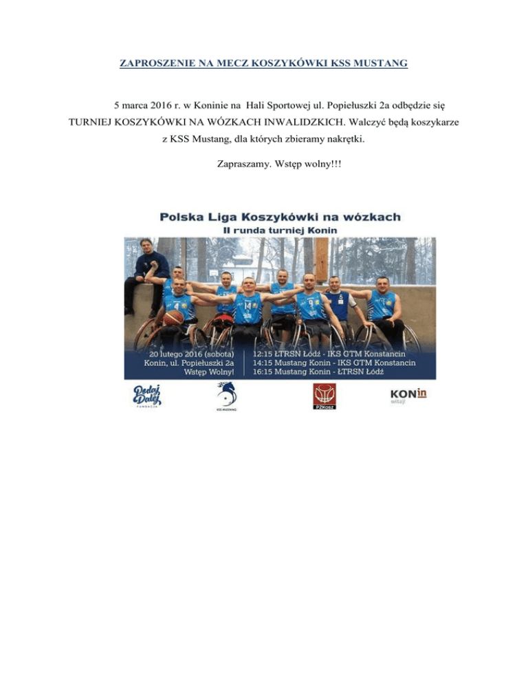ZAPROSZENIE NA MECZ KOSZYKÓWKI KSS MUSTANG 5 marca 2016 r. w Koninie na Hali Sportowej ul. Popiełuszki 2a odbędzie się TURNIEJ KOSZYKÓWKI NA WÓZKACH INWALIDZKICH. Walczyć będą koszykarze z KSS Mustang, dla których zbieramy nakrętki. Zapraszamy. Wstęp wolny!!!