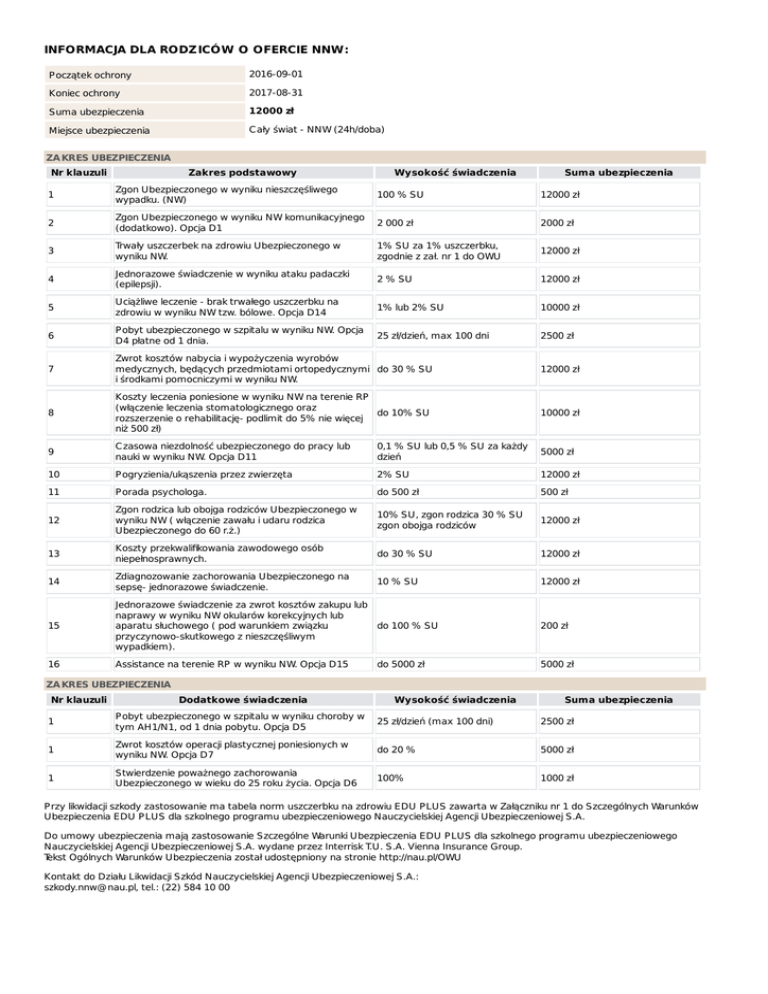INFORMACJA DLA RODZ ICÓW O OFERCIE NNW: P oczątek ochrony 2016-09-01 Koniec ochrony 2017-08-31 Suma ubezpieczenia 12000 zł Miejsce ubezpieczenia C ały świat - NNW (24h/doba) ZA KRES UBEZPIECZENIA Nr klauzuli Zakres podstawowy Wysokość świadczenia Suma ubezpieczenia 1 Zgon Ubezpieczonego w wyniku nieszczęśliwego wypadku. (NW) 100 % SU 12000 zł 2 Zgon Ubezpieczonego w wyniku NW komunikacyjnego (dodatkowo). Opcja D1 2 000 zł 2000 zł 3 Trwały uszczerbek na zdrowiu Ubezpieczonego w wyniku NW. 1% SU za 1% uszczerbku, zgodnie z zał. nr 1 do OWU 12000 zł 4 Jednorazowe świadczenie w wyniku ataku padaczki (epilepsji). 2 % SU 12000 zł 5 Uciążliwe leczenie - brak trwałego uszczerbku na zdrowiu w wyniku NW tzw. bólowe. Opcja D14 1% lub 2% SU 10000 zł 6 P obyt ubezpieczonego w szpitalu w wyniku NW. Opcja D4 płatne od 1 dnia. 25 zł/dzień, max 100 dni 2500 zł 7 Zwrot kosztów nabycia i wypożyczenia wyrobów medycznych, będących przedmiotami ortopedycznymi do 30 % SU i środkami pomocniczymi w wyniku NW. 12000 zł 8 Koszty leczenia poniesione w wyniku NW na terenie RP (włączenie leczenia stomatologicznego oraz do 10% SU rozszerzenie o rehabilitację- podlimit do 5% nie więcej niż 500 zł) 10000 zł 9 C zasowa niezdolność ubezpieczonego do pracy lub nauki w wyniku NW. Opcja D11 0,1 % SU lub 0,5 % SU za każdy dzień 5000 zł 10 P ogryzienia/ukąszenia przez zwierzęta 2% SU 12000 zł 11 P orada psychologa. do 500 zł 500 zł 12 Zgon rodzica lub obojga rodziców Ubezpieczonego w wyniku NW ( włączenie zawału i udaru rodzica Ubezpieczonego do 60 r.ż.) 10% SU, zgon rodzica 30 % SU zgon obojga rodziców 12000 zł 13 Koszty przekwalifikowania zawodowego osób niepełnosprawnych. do 30 % SU 12000 zł 14 Zdiagnozowanie zachorowania Ubezpieczonego na sepsę- jednorazowe świadczenie. 10 % SU 12000 zł 15 Jednorazowe świadczenie za zwrot kosztów zakupu lub naprawy w wyniku NW okularów korekcyjnych lub aparatu słuchowego ( pod warunkiem związku do 100 % SU przyczynowo-skutkowego z nieszczęśliwym wypadkiem). 200 zł 16 Assistance na terenie RP w wyniku NW. Opcja D15 5000 zł do 5000 zł ZA KRES UBEZPIECZENIA Nr klauzuli Dodatkowe świadczenia Wysokość świadczenia Suma ubezpieczenia 1 P obyt ubezpieczonego w szpitalu w wyniku choroby w tym AH1/N1, od 1 dnia pobytu. Opcja D5 25 zł/dzień (max 100 dni) 2500 zł 1 Zwrot kosztów operacji plastycznej poniesionych w wyniku NW. Opcja D7 do 20 % 5000 zł 1 Stwierdzenie poważnego zachorowania Ubezpieczonego w wieku do 25 roku życia. Opcja D6 100% 1000 zł P rzy likwidacji szkody zastosowanie ma tabela norm uszczerbku na zdrowiu EDU P LUS zawarta w Załączniku nr 1 do Szczególnych Warunków Ubezpieczenia EDU P LUS dla szkolnego programu ubezpieczeniowego Nauczycielskiej Agencji Ubezpieczeniowej S.A. Do umowy ubezpieczenia mają zastosowanie Szczególne Warunki Ubezpieczenia EDU P LUS dla szkolnego programu ubezpieczeniowego Nauczycielskiej Agencji Ubezpieczeniowej S.A. wydane przez Interrisk T.U. S.A. Vienna Insurance Group. Tekst Ogólnych Warunków Ubezpieczenia został udostępniony na stronie http://nau.pl/OWU Kontakt do Działu Likwidacji Szkód Nauczycielskiej Agencji Ubezpieczeniowej S.A.: szkody.nnw@ nau.pl, tel.: (22) 584 10 00