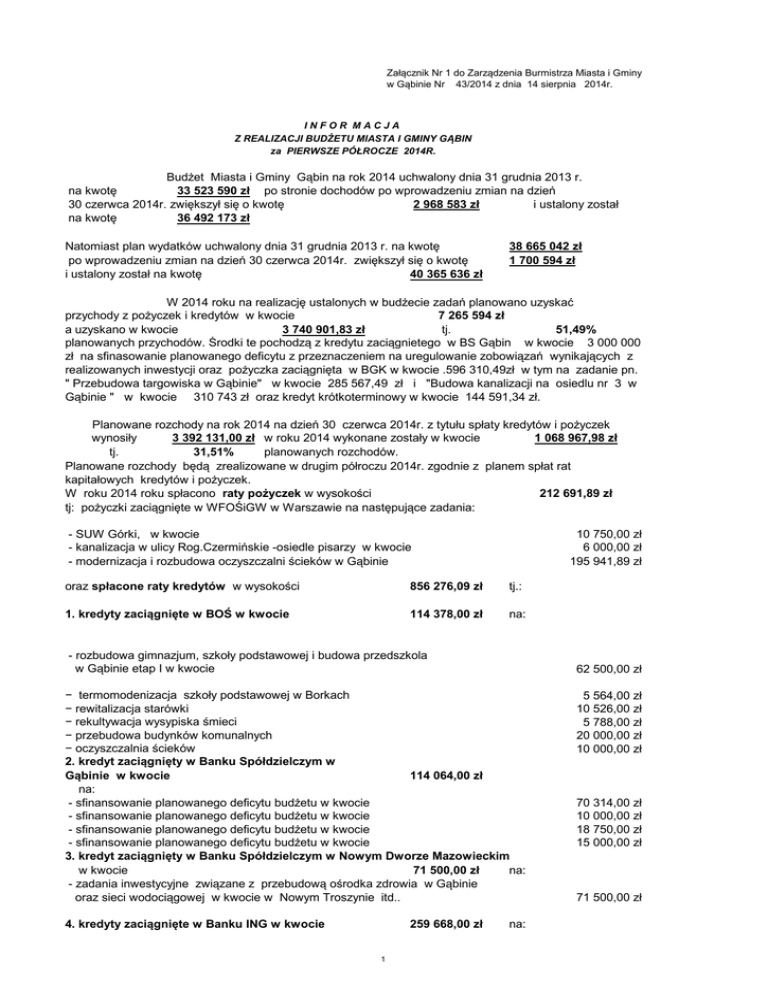 Załącznik Nr 1 do Zarządzenia Burmistrza Miasta i Gminy w Gąbinie Nr 43/2014 z dnia 14 sierpnia 2014r. INFOR MACJA Z REALIZACJI BUDŻETU MIASTA I GMINY GĄBIN za PIERWSZE PÓŁROCZE 2014R. Budżet Miasta i Gminy Gąbin na rok 2014 uchwalony dnia 31 grudnia 2013 r. na kwotę 33 523 590 zł po stronie dochodów po wprowadzeniu zmian na dzień 30 czerwca 2014r. zwiększył się o kwotę 2 968 583 zł i ustalony został na kwotę 36 492 173 zł Natomiast plan wydatków uchwalony dnia 31 grudnia 2013 r. na kwotę po wprowadzeniu zmian na dzień 30 czerwca 2014r. zwiększył się o kwotę i ustalony został na kwotę 40 365 636 zł 38 665 042 zł 1 700 594 zł W 2014 roku na realizację ustalonych w budżecie zadań planowano uzyskać przychody z pożyczek i kredytów w kwocie 7 265 594 zł a uzyskano w kwocie 3 740 901,83 zł tj. 51,49% planowanych przychodów. Środki te pochodzą z kredytu zaciągnietego w BS Gąbin w kwocie 3 000 000 zł na sfinasowanie planowanego deficytu z przeznaczeniem na uregulowanie zobowiązań wynikających z realizowanych inwestycji oraz pożyczka zaciągnięta w BGK w kwocie .596 310,49zł w tym na zadanie pn. " Przebudowa targowiska w Gąbinie" w kwocie 285 567,49 zł i "Budowa kanalizacji na osiedlu nr 3 w Gąbinie " w kwocie 310 743 zł oraz kredyt krótkoterminowy w kwocie 144 591,34 zł. Planowane rozchody na rok 2014 na dzień 30 czerwca 2014r. z tytułu spłaty kredytów i pożyczek wynosiły 3 392 131,00 zł w roku 2014 wykonane zostały w kwocie 1 068 967,98 zł tj. 31,51% planowanych rozchodów. Planowane rozchody będą zrealizowane w drugim półroczu 2014r. zgodnie z planem spłat rat kapitałowych kredytów i pożyczek. W roku 2014 roku spłacono raty pożyczek w wysokości 212 691,89 zł tj: pożyczki zaciągnięte w WFOŚiGW w Warszawie na następujące zadania: - SUW Górki, w kwocie - kanalizacja w ulicy Rog.Czermińskie -osiedle pisarzy w kwocie - modernizacja i rozbudowa oczyszczalni ścieków w Gąbinie 10 750,00 zł 6 000,00 zł 195 941,89 zł oraz spłacone raty kredytów w wysokości 856 276,09 zł tj.: 1. kredyty zaciągnięte w BOŚ w kwocie 114 378,00 zł na: - rozbudowa gimnazjum, szkoły podstawowej i budowa przedszkola w Gąbinie etap I w kwocie 62 500,00 zł − termomodenizacja szkoły podstawowej w Borkach − rewitalizacja starówki − rekultywacja wysypiska śmieci − przebudowa budynków komunalnych − oczyszczalnia ścieków 2. kredyt zaciągnięty w Banku Spółdzielczym w Gąbinie w kwocie 114 064,00 zł na: - sfinansowanie planowanego deficytu budżetu w kwocie - sfinansowanie planowanego deficytu budżetu w kwocie - sfinansowanie planowanego deficytu budżetu w kwocie - sfinansowanie planowanego deficytu budżetu w kwocie 3. kredyt zaciągnięty w Banku Spółdzielczym w Nowym Dworze Mazowieckim w kwocie 71 500,00 zł na: - zadania inwestycyjne związane z przebudową ośrodka zdrowia w Gąbinie oraz sieci wodociągowej w kwocie w Nowym Troszynie itd.. 4. kredyty zaciągnięte w Banku ING w kwocie 259 668,00 zł 1 na: 5 564,00 zł 10 526,00 zł 5 788,00 zł 20 000,00 zł 10 000,00 zł 70 314,00 zł 10 000,00 zł 18 750,00 zł 15 000,00 zł 71 500,00 zł modernizację przychodni zdrowia w Gąbinie oraz budowę drogi gminnej Nowy Kamień w kwocie - finansowanie planowanego deficytu w kwocie − przebudowa budynków komunalnych, budowa drogi Czermno-Strzemeszno, drogi Konstantynów , budowa drogi N.Kamień-Kamień Słubice 84 000,00 zł 91 668,00 zł 84 000,00 zł 101 668,00 zł 5. kredyt zaciągnięty w banku PKO BP SA -kredyt na budowę sali gimastycznej w Borkach , przebudowa przychodni zdrowia w Gąbinie, budowa świetlicy m/g oraz garaży na sprzęt transportowy i ratowniczy 91 668,00 zł - kredyt na zadania inwestycyjne: budowa dróg gminnych, przebudowa przepompowni ścieków w ulicy Płockiej, przebudowa przychodni zdrowia w Gąbinie i w Dobrzykowie, zakup sprzętu specjalistycznego dla OSP w Troszynie Polskim, itd.. 10 000,00 zł 6. kredyt krótkoterminowy w kwocie 194 998,09 zł 14 870 500,53 zł Na dzień 30 czerwca 2014r. pozostało do spłaty pożyczek zaciągniętych w W FOŚ i GW i BGK oraz kredytów zaciągniętych w bankach komercyjnych (BS w Gąbinie, BS w Nowym Dworze Mazowieckim, BOŚ w Płocku oraz w Banku ING, PKO BP SA ). Łączne zadłużenie z tytułu kredytów i pożyczek na dzień 30 czerwca 2014r. wynosiło : Pożyczki: -pożyczka krótkoterminowa zaciągnięta w BGK na sfinasowanie zadania p.n. "Przebudowa targowiska w Gąbinie" w ramach PROW -pożyczka krótkoterminowa zaciągnięta w BGK na sfinasowanie zadania p.n. kanalizacji na osiedlu nr 3 w Gąbinie" w ramach PROW 1 320 619,60 zł 586 380,49 zł "Budowa - pożyczka na modernizację i rozbudowę oczyszczalni ścieków w Gąbinie -WFOŚiGW - pożyczka na budowę kanalizacji sanitarnej na Osiedlu Pisarzy - WFOŚiGW −pożyczka zaciągnięta w WFOŚ i GW na budowę SUW Górki Kredyty: Kredyty zaciągnięte w BOŚ - kredyt na budowę szkoły w Gąbinie -BOŚ 616 383,00 zł 53 806,11 zł 31 800,00 zł 32 250,00 zł 13 549 880,93 zł 2 675 605,59 zł 187 500,00 zł -kredyt zaciągnięty w BOŚ na sfinasowanie planowanego deficytu na realizację zadań inwestycyjnych- modernizacja i rozbudowa oczyszczalni ścieków w Gąbinie , rewitalizacja i odnowa przestrzeni publicznej w Gąbinie, budowa świetlicy środowiskowej w Gąbinie −kredyt zaciągnięty w BOŚ na przebudowę budynków komunalnych oraz zakup mieszkań w budynku wielorodzinnym w Gąbinie kredyt zaciągnięty na sfinansowanie planowanego deficytu na zadanie związane z termomodernizacją szkoły Borkach , rekultywacja wysypiska śmieci i rewitalizacją przestrzeni publicznej 950 000,00 zł 1 188 000,00 zł 89 047,59 zł kredyt na sfinasowanie planowanego deficytu budżetu 168 422,00 zł kredyt na sfinasowanie planowanego deficytu budżetu 92 636,00 zł Kredyty zaciągnięte w ING Bank Śłąski 1 498 996,00 zł - kredyty na sfinansowanie planowanego deficytu związanego z pokry