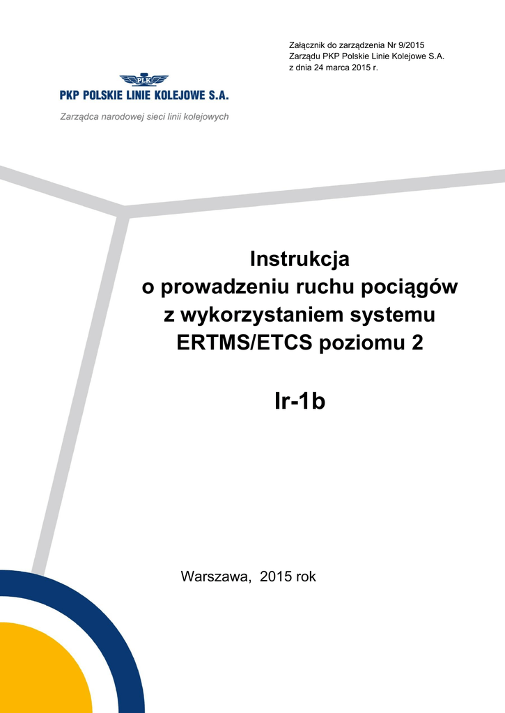 Załącznik do zarządzenia Nr 9/2015 Zarządu PKP Polskie Linie Kolejowe S.A. z dnia 24 marca 2015 r. Instrukcja o prowadzeniu ruchu pociągów z wykorzystaniem systemu ERTMS/ETCS poziomu 2 Ir-1b Warszawa, 2015 rok Regulacja wewnętrzna spełnia wymagania określone w ustawie z dnia 28 marca 2003 r. o transporcie kolejowym (Dz. U. z 2007 r. Nr 16 poz. 94 z późń. zm.) w zakresie zapewnienia bezpieczeństwa ruchu Właściciel: PKP Polskie Linie Kolejowe S.A. Wydawca: PKP Polskie Linie Kolejowe S.A. Centrala Biuro Eksploatacji Ul. Targowa 74, 02-734 Warszawa tel. (22) 47 32 014, fax. (22) 47 32 476 www.plk-sa.pl, e-mail: [email protected] Wszelkie prawa zastrzeżone. Modyfikacja, wprowadzanie do obrotu, publikacja, kopiowanie i dystrybucja w celach komercyjnych, całości lub części przepisu, bez uprzedniej zgody PKP Polskie Linie Kolejowe S.A. – są zabronione Spis treści ROZDZIAŁ I POSTANOWIENIA OGÓLNE……………………..………………………….……..5 § 1. Zakres stosowania instrukcji ………………………….…………..……………….….……….5 § 2. Podstawowe pojęcia i definicje…………………………………………...……… ….………..5 § 3. Funkcje systemu ERTMS/ETCS poziomu 2…………….…………….…..…………….…..11 ROZDZIAŁ II PRZYGOTOWANIE POCIĄGU DO JAZDY………………………………..……12 § 4. Przygotowanie i zgłoszenie do jazdy pociągu wyposażonego w urządzenia pokładowe systemu ETCS poziomu 2 …………………………………………………………….………12 ROZDZIAŁ III PROWADZENIE RUCHU POCIĄGÓW Z WYKORZYSTANIEM SYSTEMU ERTMS/ETCS………………………………………………………………………15 § 5. Prowadzenie ruchu pociągów z czynnymi urządzeniami pokładowymi systemu ERTMS/ETCS poziomu 2 na liniach wyposażonych w system ERTMS/ETCS poziomu 2 w warunkach normalnych…………………………………………………...……15 § 6. Zabezpieczenie ruchu na przejazdach i przejściach kolejowych…………...………...…..17 § 7. Prowadzenie ruchu pociągów z czynnymi urządzeniami pokładowymi systemu ERTMS/ETCS poziomu 2 na liniach wyposażonych w system ERTMS/ETCS poziomu 1………………………………………………………………………………………..18 § 8. Prowadzenie ruchu pociągów z czynnymi urządzeniami pokładowymi systemu ERTMS/ETCS poziomu 2 na liniach niewyposażonych w system ERTMS/ETCS ……..19 § 9. Prowadzenie ruchu pociągów z czynnymi urządzeniami pokładowymi systemu ERTMS/ETCS poziomu 1 na liniach wyposażonych w system ERTMS/ETCS poziomu 2…………………………………………………………………………………..…...19 § 10. Prowadzenie ruchu pociągów bez urządzeń pokładowych systemu ERTMS/ETCS na liniach wyposażonych w system ERTMS/ETCS poziomu 2…………….……………20 ROZDZIAŁ IV MANEWRY W SYSTEMIE ERTMS/ETCS POZIOMU 2………………………20 § 11. Prowadzenie manewrów z czynnymi urządzeniami pokładowymi systemu ERTMS/ETCS poziomu 2 na liniach wyposażonych w system ERTMS/ETCS poziomu 2……………………………………………………………………………………...20 § 12. Prowadzenie manewrów z czynnymi urządzeniami pokładowymi systemu ERTMS/ETCS poziomu 2 na liniach wyposażonych w system ERTMS/ETCS poziomu 1………………………………………………………………………..…………....21 § 13. Prowadzenie manewrów z czynnymi urządzeniami pokładowymi systemu ERTMS/ETCS poziomu 2 na liniach niewyposażonych…………………………….……21 3 PKP POLSKIE LINIE KOLEJOWE S.A. § 14. Prowadzenie manewrów z czynnymi urządzeniami pokładowymi systemu ERTMS/ETCS poziomu 1 na liniach wyposażonych w system ETCS poziomu 2……..22 § 15. Prowadzenie manewrów bez urządzeń pokładowych systemu ERTMS/ETCS na liniach wyposażonych w system ERTMS/ETCS poziomu 2……………… …...……22 ROZDZIAŁ V PROWADZENIE RUCHU POCIĄGÓW Z WYKORZYSTANIEM SYSTEMU ERTMS/ETCS POZIOMU 2 W WARUNKACH SZCZEGÓLNYCH I SYTUACJACH AWARYJNYCH…………………………………………...……..22 § 16. Zakłócenia w pracy RBC………………………………………………………………..……22 § 17. Zakłócenia w pracy urządzeń pokładowych systemu ERTMS/ETCS poziomu 2 i inne sytuacje nietypowe……………………………………………………………………….…..24 § 18. Zakłócenia w pracy GSM-R……………………………………………………………….…28 § 19. Zakłócenia przy wjeździe do obszaru objętego systemem ERTMS/ETCS poziomu 2..29 § 20. Zatrzymanie pociągu wyposażonego w urządzenia pokładowe systemu ERTMS/ETCS poziomu 2 w razie niebezpieczeństwa…………………………….….….30 § 21. Cofanie pociągu wyposażonego w urządzenia pokładowe systemu ERTMS/ETCS …31 § 22. Zmiana „Zezwolenia Na Jazdę” nie wynikająca z sytuacji niebezpiecznej……………..31 § 23. Zakłócenia w pracy stacyjnych urządzeń srk……………………………………………...32 § 24. Zakłócenia w pracy urządzeń blokady liniowej………...……………………….………....33 § 25. Zakłócenia w pracy urządzeń sterowania ruchem na przejeździe kolejowym…………35 ROZDZIAŁ VI OSTRZEŻENIA………………………...……………………………………….…36 § 26. Ostrzeżenia dotyczące ograniczenia prędkości jazdy………………………………….…36 § 27. Informacje z systemu detekcji stanów awaryjnych taboru kolejowego……………….…38 § 28. Wiadomości tekstowe……………………………………………………………...…………38 ROZDZIAŁ VII POSTANOWIENIA KOŃCOWE § 29. Przewidywane zmiany w instrukcji …………………………