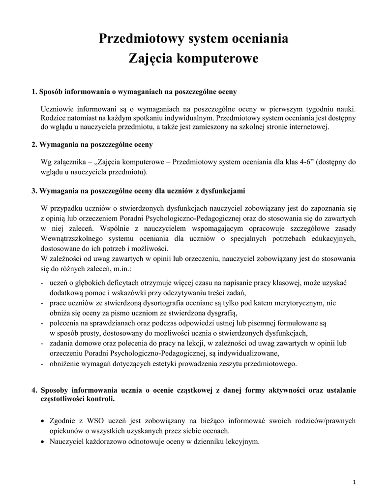 Przedmiotowy system oceniania Zajęcia komputerowe 1. Sposób informowania o wymaganiach na poszczególne oceny Uczniowie informowani są o wymaganiach na poszczególne oceny w pierwszym tygodniu nauki. Rodzice natomiast na każdym spotkaniu indywidualnym. Przedmiotowy system oceniania jest dostępny do wglądu u nauczyciela przedmiotu, a także jest zamieszony na szkolnej stronie internetowej. 2. Wymagania na poszczególne oceny Wg załącznika – „Zajęcia komputerowe – Przedmiotowy system oceniania dla klas 4-6” (dostępny do wglądu u nauczyciela przedmiotu). 3. Wymagania na poszczególne oceny dla uczniów z dysfunkcjami W przypadku uczniów o stwierdzonych dysfunkcjach nauczyciel zobowiązany jest do zapoznania się z opinią lub orzeczeniem Poradni Psychologiczno-Pedagogicznej oraz do stosowania się do zawartych w niej zaleceń. Wspólnie z nauczycielem wspomagającym opracowuje szczegółowe zasady Wewnątrzszkolnego systemu oceniania dla uczniów o specjalnych potrzebach edukacyjnych, dostosowane do ich potrzeb i możliwości. W zależności od uwag zawartych w opinii lub orzeczeniu, nauczyciel zobowiązany jest do stosowania się do różnych zaleceń, m.in.: - uczeń o głębokich deficytach otrzymuje więcej czasu na napisanie pracy klasowej, może uzyskać dodatkową pomoc i wskazówki przy odczytywaniu treści zadań, - prace uczniów ze stwierdzoną dysortografia oceniane są tylko pod katem merytorycznym, nie obniża się oceny za pismo uczniom ze stwierdzona dysgrafią, - polecenia na sprawdzianach oraz podczas odpowiedzi ustnej lub pisemnej formułowane są w sposób prosty, dostosowany do możliwości ucznia o stwierdzonych dysfunkcjach, - zadania domowe oraz polecenia do pracy na lekcji, w zależności od uwag zawartych w opinii lub orzeczeniu Poradni Psychologiczno-Pedagogicznej, są indywidualizowane, - obniżenie wymagań dotyczących estetyki prowadzenia zeszytu przedmiotowego. 4. Sposoby informowania ucznia o ocenie cząstkowej z danej formy aktywności oraz ustalanie częstotliwości kontroli. Zgodnie z WSO uczeń jest zobowiązany na bieżąco informować swoich rodziców/prawnych opiekunów o wszystkich uzyskanych przez siebie ocenach. Nauczyciel każdorazowo odnotowuje oceny w dzienniku lekcyjnym. 1 Nieobecność ucznia na lekcji nie zwalnia go z przygotowania się do kolejnej lekcji i możliwości odpowiedzi lub pisania kartkówki. Brak zadania domowego pisemnego: 3x (trzy minusy) - ocena niedostateczna. Uczeń, który na lekcji nie uważa i nie potrafi odpowiedzieć na proste pytanie nauczyciela w trakcie omawiania tematu otrzymuje ocenę niedostateczną z odpowiedzi. Ocena aktywności ucznia na lekcji może być negatywna w przypadku, gdy uczeń nie wykonuje ćwiczeń, nie uważa, rozprasza innych, skupia uwagę na sobie i nie zajmuje się lekcją: 3x (trzy minusy) - ocena niedostateczna. Forma aktywności Odpowiedź ustna Sposoby informowania ustnie po odpowiedzi. Praca domowa ustnie lub pisemnie w zeszycie ucznia. Rozwiązywanie problemu ustnie lub pisemnie w zeszycie ucznia lub na pracy pisemnej pisemnie w zeszycie Prowadzenie zeszytu przedmiotowego i zeszytu ćwiczeń Prace dodatkowe Aktywność ustnie lub pisemnie ustnie – trzy „+” to ocena bdb, trzy ”–„ to ndst Częstotliwość przynajmniej 1x w półroczu w zależności od omawianego materiału w zależności od omawianego materiału przynajmniej 1x w półroczu w zależności od omawianego materiału na każdej lekcji 5. Narzędzia sprawdzające stopień opanowania wiadomości i umiejętności. Zasady przeprowadzania klasówek i sprawdzianów oraz ustalenie form poprawiania ocen. Narzędzie Praca klasowa Zasady przeprowadzania klasówek przeprowadzana po powtórzeniu materiału, wpisana do dziennika; zapowiadana na dwa tygodnie przed praca klasowa do wglądu dla rodziców na spotkaniach indywidualnych lub u nauczyciela przedmiotu informacja o ocenie pisemna na danej pracy Ustalona ilość w półroczu sprawdzenie i oddanie do dwóch po każdym dziale 1 – 2 tygodni uczeń poprawia ocenę niedostateczną w terminie ustalonym z nauczycielem, nie później niż dwa tygodnie od omówienia poprawionej pracy klasowej Formy poprawiania 2 Sprawdzian może obejmować dział lub fragment danego działu (3-4 ostatnie lekcje) zapowiedziany na tydzień przed i wpisany do dziennika informacja o ocenie pisemna na danej pracy sprawdziany do wglądu dla rodziców na spotkaniach indywidualnych lub u nauczyciela przedmiotu sprawdzenie i oddanie tydzień po przeprowadzeniu sprawdzianu uczeń poprawia ocenę niedostateczną w terminie ustalonym z nauczycielem, nie później niż tydzień od omówienia poprawionego sprawdzianu w zależności od potrzeb Kartkówka obejmuje materiał wyłącznie z ostatniego tematu nie jest zapowiadany informacja o ocenia pisemna na kartkówce sprawdzenie i oddanie w ciągu tygodnia nie podlega poprawie w zależności od potrzeb Sprawdziany i prace klasowe są obowiązkowe – w przypadku nieobecności uczeń zalicza pracę w terminie 2 tygodni od czasu przyjścia do szkoły po okresie nieobecności. W przeciwnym razie uczeń otrzymuje ocenę niedostateczną. 6. Ustalenie wpływu różnych ocen cząstkowych na ocenę klasyfikacyjną. Ocena półroczna lub na koniec roku szkolnego nie jest średnią arytmetyczną wszystkich ocen. Wpływ na jej wartość mają oceny dydaktyczne oraz tzw. oceny pedagogiczne, wspierające. Oceny dydaktyczne: prace klasowe, sprawdziany, kartkówki, odpowiedzi ustne, ćwiczenia i zadania wykonane na lekcji Ocena pedagogiczna, wspierająca: prace domowe, prace dodatkowe, inne formy aktywności ucznia 60% 100% 40% Wagi ocen z zajęć komputerowych: - prace klasowe, sprawdziany pisemne – waga 3 - kartkówki, referaty, projekty, prezentacje – waga 2 - prace domowe, prace dodatkowe, praca na lekcji, aktywność, odpowiedź ustna – waga 1 3 7. Ustalenie sposobów wskazywania kierunków dalszej pracy ucznia. Omówienie pracy pisemnej i wskaz