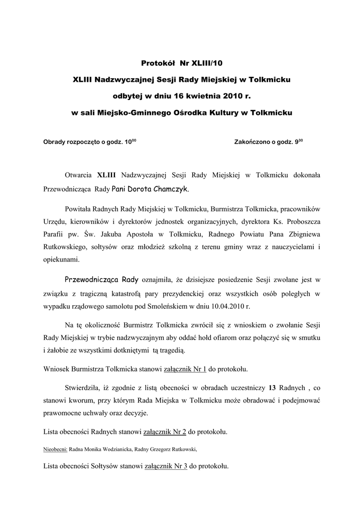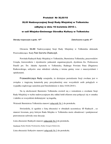 Protokół Nr XLIII/10 XLIII Nadzwyczajnej Sesji Rady Miejskiej w Tolkmicku odbytej w dniu 16 kwietnia 2010 r. w sali Miejsko-Gminnego Ośrodka Kultury w Tolkmicku Obrady rozpoczęto o godz. 1000 Zakończono o godz. 930 Otwarcia XLIII Nadzwyczajnej Sesji Rady Miejskiej w Tolkmicku dokonała Przewodnicząca Rady Pani Dorota Chamczyk. Powitała Radnych Rady Miejskiej w Tolkmicku, Burmistrza Tolkmicka, pracowników Urzędu, kierowników i dyrektorów jednostek organizacyjnych, dyrektora Ks. Proboszcza Parafii pw. Św. Jakuba Apostoła w Tolkmicku, Radnego Powiatu Pana Zbigniewa Rutkowskiego, sołtysów oraz młodzież szkolną z terenu gminy wraz z nauczycielami i opiekunami. Przewodnicząca Rady oznajmiła, że dzisiejsze posiedzenie Sesji zwołane jest w związku z tragiczną katastrofą pary prezydenckiej oraz wszystkich osób poległych w wypadku rządowego samolotu pod Smoleńskiem w dniu 10.04.2010 r. Na tę okoliczność Burmistrz Tolkmicka zwrócił się z wnioskiem o zwołanie Sesji Rady Miejskiej w trybie nadzwyczajnym aby oddać hołd ofiarom oraz połączyć się w smutku i żałobie ze wszystkimi dotkniętymi tą tragedią. Wniosek Burmistrza Tolkmicka stanowi załącznik Nr 1 do protokołu. Stwierdziła, iż zgodnie z listą obecności w obradach uczestniczy 13 Radnych , co stanowi kworum, przy którym Rada Miejska w Tolkmicku może obradować i podejmować prawomocne uchwały oraz decyzje. Lista obecności Radnych stanowi załącznik Nr 2 do protokołu. Nieobecni: Radna Monika Wodzianicka, Radny Grzegorz Rutkowski, Lista obecności Sołtysów stanowi załącznik Nr 3 do protokołu. Lista obecności zaproszonych gości stanowi załącznik Nr 4 do protokołu Ad. 2. Do proponowanego porządku obrad, który stanowi załącznik Nr 5 do protokołu, radni nie zgłosili uwag. W wyniku głosowania porządek obrad został przyjęty jednogłośnie – 13 głosów za, jak niżej: 2. Przyjęcie porządku obrad. 3. Oddanie hołdu osobom tragicznie zmarłym w katastrofie lotniczej pod Smoleńskiem. 4. Odczytanie oświadczenia Radnych Rady Miejskiej w Tolkmicku z dnia 16 kwietnia 2010 r. w sprawie uczczenia pamięci Prezydenta Rzeczypospolitej Polskiej Lecha Kaczyńskiego i członków jego delegacji –ofiar katastrofy lotniczej pod Smoleńskiem. 5. Zakończenie obrad. Przewodnicząca Rady Pani Dorota Chamczyk przekazała głos Wiceprzewodniczącemu Rady Panu Henrykowi Oleszkiewiczowi. Dla podkreślenia żałobnego charakteru przebiegu Nadzwyczajnej Sesji Rady Miejskiej w Tolkmicku, Wiceprzewodniczący Rady Henryk Oleszkiewicz poprosił wszystkich obecnych na sali o powstanie w związku z ceremonią wprowadzenia Pocztów Sztandarowych przez uczniów szkół podstawowych. Wiceprzewodniczący Rady wydał komendę: BACZNOŚĆ Wprowadzenie sztandaru odbyło się przy dźwiękach melodii. Następnie Wiceprzewodniczący Rady Henryk Oleszkiewicz wydał komendę: DO HYMNU PAŃSTWOWEGO. Po odśpiewaniu hymnu, Wiceprzewodniczący Rady poprosił ucznia Gimnazjum w Tolkmicku o przedstawienie krótkiej recenzji na temat sobotniej tragedii jaka miała miejsce pod Smoleńskiem. Ad. 3. Kolejnym punktem porządku obrad było Oddanie hołdu osobom tragicznie zmarłym w katastrofie lotniczej pod Smoleńskiem. Przewodnicząca Rady Dorota Chamczyk wspólnie z Burmistrzem Tolkmicka Panem Andrzejem Lemanowiczem odczytali listę pokładową pasażerów, którzy wraz z Prezydentem Rzeczypospolitej Polskiej Lechem Kaczyńskim i Jego małżonką Marią Kaczyńską lecieli z Warszawy do Katynia na obchody uroczystości 70-lecia Zbrodni Katyńskiej. Wszystkie osoby będące na pokładzie samolotu prezydenckiego TU-154, tj. Posłowie, Senatorowie, osoby towarzyszące parze prezydenckiej, przedstawiciele Kancelarii Prezydenta, przedstawiciele sił zbrojnych, funkcjonariusze BOR oraz załoga samolotu nieszczęśliwie polegli w katastrofie pod Smoleńskiem. Przewodnicząca Rady Dorota Chamczyk ogłosiła minutę ciszy ku czci pamięci ofiar katastrofy lotniczej, w której zginęła część elity politycznej naszego kraju. Ad. 4. Przewodnicząca Rady odczytała treść oświadczenia Radnych Rady Miejskiej w Tolkmicku z dnia 16 kwietnia 2010 r. w sprawie uczczenia pamięci Prezydenta Rzeczypospolitej Polskiej Lecha Kaczyńskiego i członków jego delegacji – ofiar katastrofy lotniczej pod Smoleńskiem. Treść kserokopii oświadczenia z podpisami radnych i wszystkich osób uczestniczących na Sesji stanowi załącznik Nr 6 do protokołu. Wiceprzewodniczący Rady Henryk Oleszkiewicz wydał komendę: SZTANDAROWE WYPROWADZIĆ SZTANDARY. SPOCZNIJ. POCZTY W związku z wyczerpaniem porządku obrad, Przewodnicząca Rady Pani Dorota Chamczyk podziękowała wszystkim osobom uczestniczącym w Sesji Nadzwyczajnej za niezawodne przybycie. Wobec powyższego ogłosiła XLIII Nadzwyczajną Sesję Rady Miejskiej w Tolkmicku za zamkniętą. Po zakończeniu obrad Nadzwyczajnej Sesji przewidziana jest część artystyczna w wykonaniu dzieci i młodzieży szkół podstawowych z terenu gminy Tolkmicko. Przewodnicząca Rady Miejskiej Dorota Chamczyk Protokołowała: Marta Pruchniewska