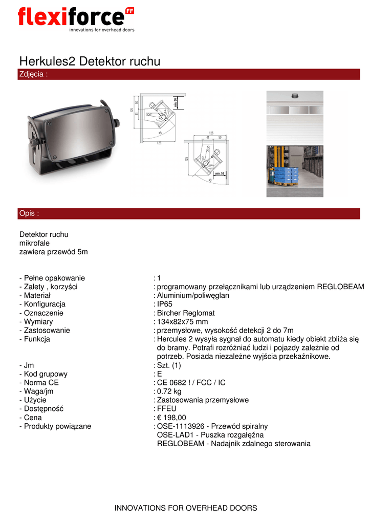 Herkules2 Detektor ruchu Zdjęcia : Opis : Detektor ruchu mikrofale zawiera przewód 5m - Pełne opakowanie - Zalety , korzyści - Materiał - Konfiguracja - Oznaczenie - Wymiary - Zastosowanie - Funkcja - Jm - Kod grupowy - Norma CE - Waga/jm - Użycie - Dostępność - Cena - Produkty powiązane :1 : programowany przełącznikami lub urządzeniem REGLOBEAM : Aluminium/poliwęglan : IP65 : Bircher Reglomat : 134x82x75 mm : przemysłowe, wysokość detekcji 2 do 7m : Hercules 2 wysyła sygnał do automatu kiedy obiekt zbliża się do bramy. Potrafi rozróżniać ludzi i pojazdy zależnie od potrzeb. Posiada niezależne wyjścia przekaźnikowe. : Szt. (1) :E : CE 0682 ! / FCC / IC : 0.72 kg : Zastosowania przemysłowe : FFEU : € 198,00 : OSE-1113926 - Przewód spiralny OSE-LAD1 - Puszka rozgałęźna REGLOBEAM - Nadajnik zdalnego sterowania INNOVATIONS FOR OVERHEAD DOORS