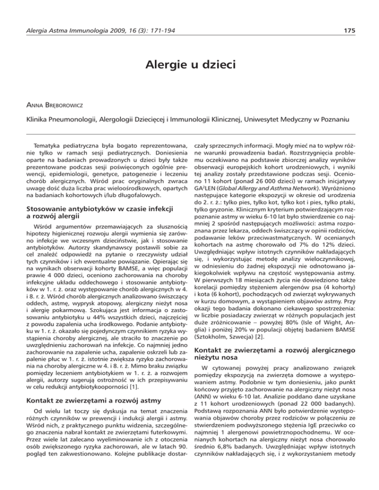 175 Alergia Astma Immunologia 2009, 16 (3): 171-194 Alergie u dzieci ANNA BRĘBOROWICZ Klinika Pneumonologii, Alergologii Dziecięcej i Immunologii Klinicznej, Uniwesytet Medyczny w Poznaniu Tematyka pediatryczna była bogato reprezentowana, nie tylko w ramach sesji pediatrycznych. Doniesienia oparte na badaniach prowadzonych u dzieci były także prezentowane podczas sesji poświęconych ogólnie prewencji, epidemiologii, genetyce, patogenezie i leczeniu chorób alergicznych. Wśród prac oryginalnych zwraca uwagę dość duża liczba prac wieloośrodkowych, opartych na badaniach kohortowych i/lub długofalowych. Stosowanie antybiotyków w czasie infekcji a rozwój alergii Wśród argumentów przemawiających za słusznością hipotezy higienicznej rozwoju alergii wymienia się zarówno infekcje we wczesnym dzieciństwie, jak i stosowanie antybiotyków. Autorzy skandynawscy postawili sobie za cel znaleźć odpowiedź na pytanie o rzeczywisty udział tych czynników i ich ewentualne powiązanie. Opierając się na wynikach obserwacji kohorty BAMSE, a więc populacji prawie 4 000 dzieci, oceniono zachorowania na choroby infekcyjne układu oddechowego i stosowanie antybiotyków w 1. r. ż. oraz występowanie chorób alergicznych w 4. i 8. r. ż. Wśród chorób alergicznych analizowano świszczący oddech, astmę, wyprysk atopowy, alergiczny nieżyt nosa i alergię pokarmową. Szokująca jest informacja o zastosowaniu antybiotyku u 44% wszystkich dzieci, najczęściej z powodu zapalenia ucha środkowego. Podanie antybiotyku w 1. r. ż. okazało się pojedynczym czynnikiem ryzyka wystąpienia choroby alergicznej, ale straciło to znaczenie po uwzględnieniu zachorowań na infekcje. Co najmniej jedno zachorowanie na zapalenie ucha, zapalenie oskrzeli lub zapalenie płuc w 1. r. ż. istotnie zwiększa ryzyko zachorowania na choroby alergiczne w 4. i 8. r. ż. Mimo braku związku pomiędzy leczeniem antybiotykiem w 1. r. ż. a rozwojem alergii, autorzy sugerują ostrożność w ich przepisywaniu w celu redukcji antybiotykooporności [1]. Kontakt ze zwierzętami a rozwój astmy Od wielu lat toczy się dyskusja na temat znaczenia różnych czynników w prewencji i indukcji alergii i astmy. Wśród nich, z praktycznego punktu widzenia, szczególnego znaczenia nabrał kontakt ze zwierzętami futerkowymi. Przez wiele lat zalecano wyeliminowanie ich z otoczenia osób zwiększonego ryzyka zachorowań, ale w latach 90. pogląd ten zakwestionowano. Kolejne publikacje dostar- czały sprzecznych informacji. Mogły mieć na to wpływ różne warunki prowadzenia badań. Rozstrzygnięcia problemu oczekiwano na podstawie zbiorczej analizy wyników obserwacji europejskich kohort urodzeniowych, i wyniki tej analizy zostały przedstawione podczas sesji. Oceniono 11 kohort (ponad 26 000 dzieci) w ramach inicjatywy GA2LEN (Global Allergy and Asthma Network). Wyróżniono następujące kategorie ekspozycji w okresie od urodzenia do 2. r. ż.: tylko pies, tylko kot, tylko kot i pies, tylko ptaki, tylko gryzonie. Klinicznym kryterium potwierdzającym rozpoznanie astmy w wieku 6-10 lat było stwierdzenie co najmniej 2 spośród następujących możliwości: astma rozpoznana przez lekarza, oddech świszczący w opinii rodziców, podawanie leków przeciwastmatycznych. W ocenianych kohortach na astmę chorowało od 7% do 12% dzieci. Uwzględniając wpływ istotnych czynników nakładających się, i wykorzystując metodę analizy wieloczynnikowej, w odniesieniu do żadnej ekspozycji nie odnotowano jakiegokolwiek wpływu na częstość występowania astmy. W pierwszych 18 miesiącach życia nie dowiedziono także korelacji pomiędzy stężeniem alergenów psa (4 kohorty) i kota (6 kohort), pochodzących od zwierząt wykrywanych w kurzu domowym, a wystąpieniem objawów astmy. Przy okazji tego badania dokonano ciekawego spostrzeżenia: w liczbie posiadaczy zwierząt w różnych populacjach jest duże zróżnicowanie – powyżej 80% (Isle of Wight, Anglia) i poniżej 20% w populacji objętej badaniem BAMSE (Sztokholm, Szwecja) [2]. Kontakt ze zwierzętami a rozwój alergicznego nieżytu nosa W cytowanej powyżej pracy analizowano związek pomiędzy ekspozycją na zwierzęta domowe a występowaniem astmy. Podobnie w tym doniesieniu, jako punkt końcowy przyjęto zachorowanie na alergiczny nieżyt nosa (ANN) w wieku 6-10 lat. Analizie poddano dane uzyskane z 11 kohort urodzeniowych (ponad 22 000 badanych). Podstawą rozpoznania ANN było potwierdzenie występowania objawów choroby przez rodziców w połączeniu ze stwierdzeniem podwyższonego stężenia IgE przeciwko co najmniej 1 alergenowi powietrznopochodnemu. W ocenianych kohortach na alergiczny nieżyt nosa chorowało średnio 6,8% badanych. Uwzględniając wpływ istotnych czynników nakładających się, i z wykorzystaniem metody 176 analizy wieloczynnikowej, w odniesieniu do żadnej ekspozycji nie odnotowano jakiegokolwiek wpływu na częstość występowania ANN. W pierwszych 18 miesiącach życia analiza związku pomiędzy stężeniem alergenów psa (4 kohorty) i kota (6 kohort), pochodzących od zwierząt wykrywanych w kurzu domowym, a wystąpieniem objawów ANN wykazała ochronny wpływ wysokich stężeń alergenów psa. Autorzy sugerują konieczność dalszych badań w celu wyjaśnienia i potwierdzenia tego spostrzeżenia [3]. Mieszanki mlekozastępcze w zapobieganiu alergii Wcześniej publikowane wyniki badania GINI potwierdziły skuteczność mieszanek mlekozastępczych w postaci hydrolizatów białkowych w zapobieganiu atopowemu zapaleniu skóry u dzieci zwiększonego ryzyka zachorowań na choroby alergiczne. Aktualne doniesienie oparte jest na poszerzonej kohorcie GINIplus, która dodatkowo obejmowała dzieci niepoddane żadnej interwencji. W tej grupie były dzieci obciążone i nieobciążone rodzinnie alergią. W sumie poddano analizie populację prawie 6 000 dzieci. Celem prezentowanego doniesienia było porównanie częstości występowania atopowego 