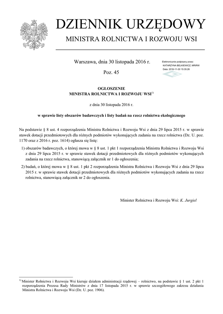 DZIENNIK URZĘDOWY MINISTRA ROLNICTWA I ROZWOJU WSI Warszawa, dnia 30 listopada 2016 r. Elektronicznie podpisany przez: KATARZYNA BELKIEWICZ; MRiRW Data: 2016-11-30 15:35:26 Poz. 45 OGŁOSZENIE MINISTRA ROLNICTWA I ROZWOJU WSI1) z dnia 30 listopada 2016 r. w sprawie listy obszarów badawczych i listy badań na rzecz rolnictwa ekologicznego Na podstawie § 8 ust. 4 rozporządzenia Ministra Rolnictwa i Rozwoju Wsi z dnia 29 lipca 2015 r. w sprawie stawek dotacji przedmiotowych dla różnych podmiotów wykonujących zadania na rzecz rolnictwa (Dz. U. poz. 1170 oraz z 2016 r. poz. 1614) ogłasza się listę: 1) obszarów badawczych, o której mowa w § 8 ust. 1 pkt 1 rozporządzenia Ministra Rolnictwa i Rozwoju Wsi z dnia 29 lipca 2015 r. w sprawie stawek dotacji przedmiotowych dla różnych podmiotów wykonujących zadania na rzecz rolnictwa, stanowiącą załącznik nr 1 do ogłoszenia; 2) badań, o której mowa w § 8 ust. 1 pkt 2 rozporządzenia Ministra Rolnictwa i Rozwoju Wsi z dnia 29 lipca 2015 r. w sprawie stawek dotacji przedmiotowych dla różnych podmiotów wykonujących zadania na rzecz rolnictwa, stanowiącą załącznik nr 2 do ogłoszenia. Minister Rolnictwa i Rozwoju Wsi: K. Jurgiel 1) Minister Rolnictwa i Rozwoju Wsi kieruje działem administracji rządowej – rolnictwo, na podstawie § 1 ust. 2 pkt 1 rozporządzenia Prezesa Rady Ministrów z dnia 17 listopada 2015 r. w sprawie szczegółowego zakresu działania Ministra Rolnictwa i Rozwoju Wsi (Dz. U. poz. 1906). Dziennik Urzędowy Ministra Rolnictwa i Rozwoju Wsi –2– Poz. 45 Załączniki do ogłoszenia Ministra Rolnictwa i Rozwoju Wsi z dnia 30 listopada 2016 r. (poz. 45) Załącznik nr 1 Lista obszarów badawczych, o której mowa w § 8 ust. 1 pkt 1 rozporządzenia Ministra Rolnictwa i Rozwoju Wsi z dnia 29 lipca 2015 r. w sprawie stawek dotacji przedmiotowych dla różnych podmiotów wykonujących zadania na rzecz rolnictwa 1. Warzywnictwo, w tym uprawa ziół, metodami ekologicznymi: 1) badania w zakresie optymalizacji warunków ekologicznej uprawy warzyw i ziół pod osłonami lub w szklarniach, ze szczególnym uwzględnieniem innowacyjnych rozwiązań zastępujących praktyki i środki produkcji niedozwolone w produkcji ekologicznej; 2) badania w zakresie innowacyjnych metod ochrony przed szkodnikami, chorobami i chwastami w towarowej ekologicznej produkcji warzyw i ziół. 2. Sadownictwo metodami ekologicznymi: 1) badania w zakresie optymalizacji warunków ekologicznej towarowej uprawy roślin sadowniczych, z uwzględnieniem zależności pomiędzy gęstością obsady, a występowaniem chorób i szkodników w tych uprawach; 2) badania w zakresie optymalizacji doboru odmian wybranych ważnych gatunków roślin sadowniczych do uprawy ekologicznej. 3. Uprawy polowe metodami ekologicznymi: 1) badania w zakresie optymalizacji warunków ekologicznej uprawy roślin rolniczych, ze szczególnym uwzględnieniem innowacyjnych rozwiązań podnoszących żyzność i aktywność biologiczną gleby; 2) badania w zakresie doboru odmian roślin bobowatych – strączkowych grubonasiennych, soi, rzepaku, zbóż oraz roślin wysokobiałkowych w uprawach polowych zalecanych do towarowej uprawy ekologicznej. Dziennik Urzędowy Ministra Rolnictwa i Rozwoju Wsi –3– Poz. 45 4. Produkcja zwierzęca metodami ekologicznymi: 1) badania w zakresie optymalizacji warunków chowu drobiu i odchowu piskląt w rolnictwie ekologicznym, ze szczególnym uwzględnieniem rozwiązań nowatorskich w tym chowie; 2) badania nad wpływem żywienia, w tym dodatków ziołowych i dodatków paszowych, na kształtowanie parametrów jakościowych produktów pochodzenia zwierzęcego w produkcji ekologicznej; 3) opracowanie praktycznych zasad wytwarzania ekologicznych mieszanek paszowych na poziomie gospodarstwa rolnego. Dziennik Urzędowy Ministra Rolnictwa i Rozwoju Wsi –4– Poz. 45 Załącznik nr 2 Lista badań, o której mowa w § 8 ust. 1 pkt 2 rozporządzenia Ministra Rolnictwa i Rozwoju Wsi z dnia 29 lipca 2015 r. w sprawie stawek dotacji przedmiotowych dla różnych podmiotów wykonujących zadania na rzecz rolnictwa 1. Warzywnictwo, w tym uprawa ziół, metodami ekologicznymi: 1) badania w zakresie określenia źródeł oraz przyczyn niezamierzonego występowania w produktach ekologicznych środków niedopuszczonych do stosowania w rolnictwie ekologicznym; określenie dobrych praktyk, standardów postępowania, opracowanie przewodnika oraz wytycznych w zakresie przeciwdziałania takim przypadkom; 2) badania w zakresie możliwości wykorzystania substancji podstawowych w ochronie warzyw i ziół w uprawach ekologicznych; 3) badania w zakresie optymalizacji produkcji nasiennej warzyw, ze szczególnym uwzględnieniem ograniczonego zakresu dozwolonych środków produkcji w uprawach ekologicznych. 2. Sadownictwo metodami ekologicznymi: 1) badania w zakresie określenia źródeł oraz przyczyn niezamierzonego występowania w produktach ekologicznych środków niedopuszczonych do stosowania w rolnictwie ekologicznym; określenie dobrych praktyk, standardów postępowania, opracowanie przewodnika oraz wytycznych w zakresie przeciwdziałania takim przypadkom; 2) badania w zakresie wykorzystania substancji podstawowych w ochronie upraw sadowniczych w uprawach ekologicznych; 3) badania nad nowatorskimi metodami ochrony upraw sadowniczych w rolnictwie ekologicznym, ze szczególnym uwzględnieniem upraw roślin jagodowych. 3. Uprawy polowe metodami ekologicznymi: 1) badania w zakresie określenia źródeł oraz przyczyn niezamierzonego występowania w produktach ekologicznych środków niedopuszczonych do stosowania w rolnictwie ekologicznym; określenie dobrych praktyk, standardów postępowania, opracowanie przewodnika oraz wytycznych w zakresie przeciwdziałania takim przypadkom; Dziennik Urzędowy Ministra Rolnictwa i Rozwoju Wsi 2) –5– Poz. 45 badania w zakresie wykorzystania substancji podstawowych w ochronie upraw polowych w uprawach ekologicznych; 3