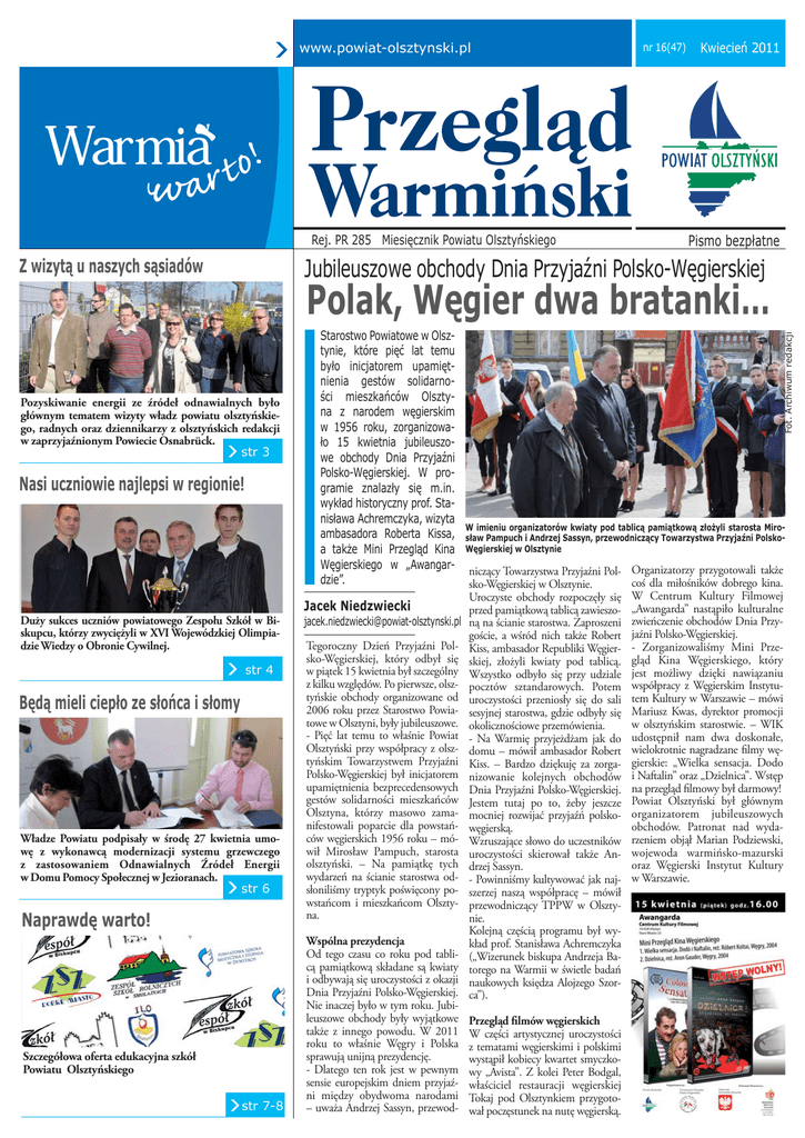 www.powiat-olsztynski.pl Rej. PR 285 Miesięcznik Powiatu Olsztyńskiego nr 16(47) Kwiecień 2011 Pismo bezpłatne Jubileuszowe obchody Dnia Przyjaźni Polsko-Węgierskiej Z wizytą u naszych sąsiadów Pozyskiwanie energii ze źródeł odnawialnych było głównym tematem wizyty władz powiatu olsztyńskiego, radnych oraz dziennikarzy z olsztyńskich redakcji w zaprzyjaźnionym Powiecie Osnabrück. str 3 Nasi uczniowie najlepsi w regionie! Starostwo Powiatowe w Olsztynie, które pięć lat temu było inicjatorem upamiętnienia gestów solidarności mieszkańców Olsztyna z narodem węgierskim w 1956 roku, zorganizowało 15 kwietnia jubileuszowe obchody Dnia Przyjaźni Polsko-Węgierskiej. W programie znalazły się m.in. wykład historyczny prof. Stanisława Achremczyka, wizyta ambasadora Roberta Kissa, a także Mini Przegląd Kina Węgierskiego w „Awangardzie”. Jacek Niedzwiecki Duży sukces uczniów powiatowego Zespołu Szkół w Biskupcu, którzy zwyciężyli w XVI Wojewódzkiej Olimpiadzie Wiedzy o Obronie Cywilnej. str 4 Będą mieli ciepło ze słońca i słomy Władze Powiatu podpisały w środę 27 kwietnia umowę z wykonawcą modernizacji systemu grzewczego z zastosowaniem Odnawialnych Źródeł Energii w Domu Pomocy Społecznej w Jezioranach. str 6 Naprawdę warto! Szczegółowa oferta edukacyjna szkół Powiatu Olsztyńskiego str 7-8 [email protected] Tegoroczny Dzień Przyjaźni Polsko-Węgierskiej, który odbył się w piątek 15 kwietnia był szczególny z kilku względów. Po pierwsze, olsztyńskie obchody organizowane od 2006 roku przez Starostwo Powiatowe w Olsztyni, były jubileuszowe. - Pięć lat temu to właśnie Powiat Olsztyński przy współpracy z olsztyńskim Towarzystwem Przyjaźni Polsko-Węgierskiej był inicjatorem upamiętnienia bezprecedensowych gestów solidarności mieszkańców Olsztyna, którzy masowo zamanifestowali poparcie dla powstańców węgierskich 1956 roku – mówił Mirosław Pampuch, starosta olsztyński. – Na pamiątkę tych wydarzeń na ścianie starostwa odsłoniliśmy tryptyk poświęcony powstańcom i mieszkańcom Olsztyna. Wspólna prezydencja Od tego czasu co roku pod tablicą pamiątkową składane są kwiaty i odbywają się uroczystości z okazji Dnia Przyjaźni Polsko-Węgierskiej. Nie inaczej było w tym roku. Jubileuszowe obchody były wyjątkowe także z innego powodu. W 2011 roku to właśnie Węgry i Polska sprawują unijną prezydencję. - Dlatego ten rok jest w pewnym sensie europejskim dniem przyjaźni między obydwoma narodami – uważa Andrzej Sassyn, przewod- Fot. Archiwum redakcji Polak, Węgier dwa bratanki… W imieniu organizatorów kwiaty pod tablicą pamiątkową złożyli starosta Mirosław Pampuch i Andrzej Sassyn, przewodniczący Towarzystwa Przyjaźni PolskoWęgierskiej w Olsztynie niczący Towarzystwa Przyjaźni Polsko-Węgierskiej w Olsztynie. Uroczyste obchody rozpoczęły się przed pamiątkową tablicą zawieszoną na ścianie starostwa. Zaproszeni goście, a wśród nich także Robert Kiss, ambasador Republiki Węgierskiej, złożyli kwiaty pod tablicą. Wszystko odbyło się przy udziale pocztów sztandarowych. Potem uroczystości przeniosły się do sali sesyjnej starostwa, gdzie odbyły się okolicznościowe przemówienia. - Na Warmię przyjeżdżam jak do domu – mówił ambasador Robert Kiss. – Bardzo dziękuję za zorganizowanie kolejnych obchodów Dnia Przyjaźni Polsko-Węgierskiej. Jestem tutaj po to, żeby jeszcze mocniej rozwijać przyjaźń polskowęgierską. Wzruszające słowo do uczestników uroczystości skierował także Andrzej Sassyn. - Powinniśmy kultywować jak najszerzej naszą współpracę – mówił przewodniczący TPPW w Olsztynie. Kolejną częścią programu był wykład prof. Stanisława Achremczyka („Wizerunek biskupa Andrzeja Batorego na Warmii w świetle badań naukowych księdza Alojzego Szorca”). Przegląd filmów węgierskich W części artystycznej uroczystości z tematami węgierskimi i polskimi wystąpił kobiecy kwartet smyczkowy „Avista”. Z kolei Peter Bodgal, właściciel restauracji węgierskiej Tokaj pod Olsztynkiem przygotował poczęstunek na nutę węgierską. Organizatorzy przygotowali także coś dla miłośników dobrego kina. W Centrum Kultury Filmowej „Awangarda” nastąpiło kulturalne zwieńczenie obchodów Dnia Przyjaźni Polsko-Węgierskiej. - Zorganizowaliśmy Mini Przegląd Kina Węgierskiego, który jest możliwy dzięki nawiązaniu współpracy z Węgierskim Instytutem Kultury w Warszawie – mówi Mariusz Kwas, dyrektor promocji w olsztyńskim starostwie. – WIK udostępnił nam dwa doskonałe, wielokrotnie nagradzane filmy węgierskie: „Wielka sensacja. Dodo i Naftalin” oraz „Dzielnica”. Wstęp na przegląd filmowy był darmowy! Powiat Olsztyński był głównym organizatorem jubileuszowych obchodów. Patronat nad wydarzeniem objął Marian Podziewski, wojewoda warmińsko-mazurski oraz Węgierski Instytut Kultury w Warszawie. 01 Z drugiej strony W Dobrym Mieście edukacja poprzez spotkania ze sztuką Lekcja sztuki współczesnej dla mechaników xxxx 02 Dzięki współpracy dyrektora szkoły z artystą Jackiem Adamasem przyszli mechanicy i ślusarze z powiatowego ZSZ w Dobrym Mieście maja szansę obcować ze sztuką współczesną. W piątek 8 kwietnia o godz. 10 w auli szkoły została otwarta wystawa zdjęć z głośnego pleneru artystów i robotników w zakładach metalowych w Świeciu. Fot. Archiwum ZSZ Hisotryjka: 013 2 nr 16(47) 2011 Jacek Niedzwiecki [email protected] 03 04 Pomysł na edukacje przez sztukę i spotkania z twórcami, to wspólna idea Andrzeja Woni, dyrektora Zespołu Szkół Zawodowych w Dobrym Mieście oraz Jacka Adamasa, rzeźbiarza, autora instalacji i performera z Warmii. - Jakiś czas temu Jacek Adamas przyniósł mi fantastyczne zdjęcia z pleneru rzeźbiarskiego zorganizowanego przez artystę Artura Żmijewskiego w 2009 roku w zakładach metalowych w Świeciu - mówi Andrzej Wonia. 