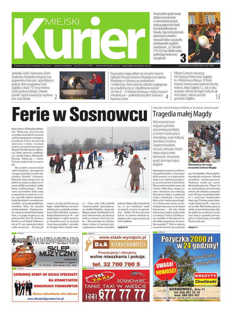 Kurier MIEJSKI Czasopismo Samorządowe Sosnowca wydanie bezpłatne luty 2012 Nr 2 (365) Spektakle, Dzień Teatromana i Dzień Studentów Wydziałów Reżyserii oraz prapremiera sztuki prof. Jacka Rykały to atrakcje, które przygotował Teatr Zagłębia z okazji 115-lecia istnienia. Sztuce profesora Rykały „Chłodne poranki” będzie towarzyszyć wystawa prac Jacka Rykały NR INDEKSU 373788 ISSN 1232-7395 Na początku lutego odbyło się uroczyste otwarcie Oddziału Chirurgii Urazowo-Ortopedycznej Szpitala Miejskiego w Sosnowcu po przebudowie i modernizacji. Koszt remontu oddziału znajdującego się w budynku przy ul. Zegadłowicza wyniósł 3,6 mln zł. – To kolejna inwestycja z myślą o naszych mieszkańcach – podkreślał prezydent Sosnowca Kazimierz Górski 2 umiem, ale chcę jeździć jeszcze lepiej – dodał. Pierwszy raz na środulskiej górce zjeżdżała siedmioletnia Julita Dukalska, uczennica Szkoły Podstawowej nr 36. – Jest bardzo fajnie i w ogóle się nie boję. Dostałam narty na urodziny i teraz się uczę jeździć – stwierdziła. Postępy dzieci śledzili rodzi- 3 www.kuriermiejski.com.pl [email protected] 4 Ferie w Sosnowcu Hasło filii nr 20 Miejskiej Biblioteki Publicznej przyświecało wszystkim dzieciakom i uczniom szkół gimnazjalnych i ponadgimnazjalnych, którzy postanowili skorzystać z ofer ty i licznych atrakcji, przygotowanych przez Miejski Ośrodek Sportu i Rekreacji, kluby sportowe i spółdzielcze, ośrodki kultury, Miejską Bibliotekę Publiczną i szkoły. Na brak atrakcji nikt nie narzekał. Dla uczniów sosnowieckich szkół bezpłatnie udostępniono wyciągi narciarskie na stoku narciarskim „Środula” i ślizgawki. Dzieciaki miały okazję uczyć się jeździć na nartach za darmo w ramach szkółki narciarskiej i robiły bardzo szybko postępy. – Większość uczestników miała narty na nogach po raz pierwszy w życiu, a po kilku dniach szkolenia, każdy brał udział w zawodach narciarskich – przyznaje pan Roman, instruktor, który nie narzekał na brak chętnych. – Zainteresowanie nauką na nartach było bardzo duże, a w grupie mogło uczyć się jednocześnie 10 osób. Ksawery Korfel, uczeń Szkoły Podstawowej nr 21, nie zmarnował okazji nauki na nartach. – Troszkę już Ponad siedem godzin trwała debata natemat zmian wsosnowieckiej oświacie, podczas połączonych obrad Komisji Budżetowej oraz Oświaty. Argumenty przeciwko planowanym zmianom wysuwali rodzice, nauczyciele, przedstawiciele związków zawodowych. „Za”byli radni zPO iSLD oraz władze miasta, podkreślając konieczność oszczędności ce. – Chcę, żeby córka jeździła z nami na nartach – przyznała mama, Sybilla Dukalska. Agnieszka Biegun, mama ośmioletniej Liwii, także obserwowała, jak pierwsze kroki na nartach stawia jej córka. – Pan instruktor uczy bardzo fajnie i widzę, że Liwia jest zdyscyplinowana i słucha wszystkich reklama reklama reklama reklama poleceń. Kiedy tylko dowiedziała się, że jest możliwość nauki na nartach, od razu się zgłosiliśmy – dodała. Nie bez znaczenia było to, że zarówno szkolenie instruktora, jak i wypożyczenie nart było bezpłatne. czytaj str.16 Piłkarze Czarnych zwycięzcą XVII Halowych Mistrzostw Zagłębia im. Włodzimierza Mazura. W finale imprezy sosnowiczanie pokonali obrońcę trofeum, ekipę Zagłębia 5:2. Jak co roku wszystkie zebrane pieniądze trafią do rąk Anny Mazur, wdowy po byłej gwieździe Zagłębia 13 Łóżeczko sześciomiesięcznej Madzi już na zawsze zostanie puste Tragedia małej Magdy Nad prowizorycznym miejscem pochówku sześciomiesięcznej Madzi, w ruinach w parku przy ul. Żeromskiego, wciąż modlą się mieszkańcy Sosnowca. Zasypane pluszakami, zniczami, wierszami i listami miejsce ukrycia zwłok dziewczynki, nie pozwala przejść obok tego miejsca obojętnie Zgromadzeni nad tym symbolicznym grobem ludzie, wciąż nie potrafią uwierzyć w tę tragiczną historię. Łzy współczucia pojawiają się na twarzach wielu kobiet. Płaczą zarówno młode mamy, jak i babcie. Małe dzieci, stojące, razem z dorosłymi, nie rozumieją, dlaczego to miejsce w parku jest usłane zabawkami i zniczami. Mężczyźni, bardziej powściągliwi w ukazywaniu uczuć, nie potrafią powstrzymać się od ostrych komentarzy. – Jak taka młoda dziewczyna i matka mogła zrobić coś takiego? Jeśli to był faktycznie wypadek, to dlaczego nie zadzwoniła na pogotowie, nie zawołała sąsiadów?! Tylko w ukryciu wyniosła dziecko i porzuciła jak reklama Mieszkańcy nie mogą zrozumieć śmierci Magdy psa. To nieludzkie. Przed całą Polską udawała cierpienie. Nabrała wszystkich – grzmią mężczyźni. Niektórzy wydali już wyrok. Brzmi jednoznacznie. Winna. I to nie nieumyślnego spowodowania śmierci, ale zabójstwa z premedytacją. Wiszące na gałązkach kartki z wierszami bezpośrednio obarczają 22-letnią mamę dziewczynki, Katarzynę W., winą za to, co się stało. Mieszkańcy piszą, że zabiła, że jest morderczynią. Opinia publiczna wydała już wyrok, choć śledczy są bardzo powściągliwi w ocenach tego, co się stało. Wyrok wyda sąd. czytaj str. 3 miasto W Brukseli Zdjęcie z Lechem Wałęsą EastNews ARC Zwarci i gotowi Na ul. Warszawską 1/2 mogą udać się wszyscy, którzy oczekują pomocy, wsparcia lub interwencji ze strony parlamentarzystów Platformy Obywatelskiej w Sosnowcu. Biuro Platformy oficjalnie zostało otwarte 16 stycznia – będą w nim pracować europarlamentarzyści Małgorzata Handzlik i Józef Buzek oraz senator Bogusław Śmigielski i poseł Jarosław Pięta. Obecni na otwarciu biura Małgorzata Handzlik, Bogusław Śmigielski i Jarosław Pięta, deklarowali gotowość do niesienia pomocy mieszkańcom zagłębia. – Bardzo mi miło, że mogę aktywnie działać na rzecz mieszkańców mojego okręgu wyborczego. Będę przyjmować w biurze mieszkańców dwa razy w tygodniu i gwarantuję, że odpowiem na każdy telefon – d