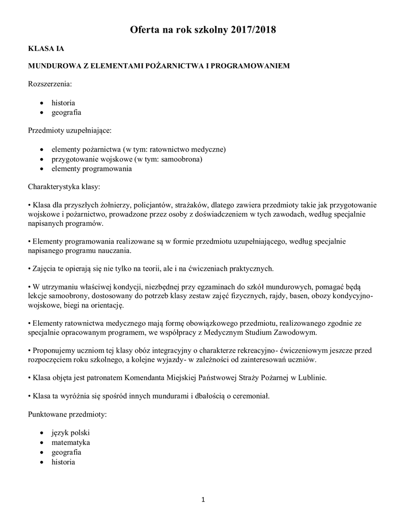 Oferta na rok szkolny 2017/2018 KLASA IA MUNDUROWA Z ELEMENTAMI POŻARNICTWA I PROGRAMOWANIEM Rozszerzenia: historia geografia Przedmioty uzupełniające: elementy pożarnictwa (w tym: ratownictwo medyczne) przygotowanie wojskowe (w tym: samoobrona) elementy programowania Charakterystyka klasy: • Klasa dla przyszłych żołnierzy, policjantów, strażaków, dlatego zawiera przedmioty takie jak przygotowanie wojskowe i pożarnictwo, prowadzone przez osoby z doświadczeniem w tych zawodach, według specjalnie napisanych programów. • Elementy programowania realizowane są w formie przedmiotu uzupełniającego, według specjalnie napisanego programu nauczania. • Zajęcia te opierają się nie tylko na teorii, ale i na ćwiczeniach praktycznych. • W utrzymaniu właściwej kondycji, niezbędnej przy egzaminach do szkół mundurowych, pomagać będą lekcje samoobrony, dostosowany do potrzeb klasy zestaw zajęć fizycznych, rajdy, basen, obozy kondycyjnowojskowe, biegi na orientację. • Elementy ratownictwa medycznego mają formę obowiązkowego przedmiotu, realizowanego zgodnie ze specjalnie opracowanym programem, we współpracy z Medycznym Studium Zawodowym. • Proponujemy uczniom tej klasy obóz integracyjny o charakterze rekreacyjno- ćwiczeniowym jeszcze przed rozpoczęciem roku szkolnego, a kolejne wyjazdy- w zależności od zainteresowań uczniów. • Klasa objęta jest patronatem Komendanta Miejskiej Państwowej Straży Pożarnej w Lublinie. • Klasa ta wyróżnia się spośród innych mundurami i dbałością o ceremoniał. Punktowane przedmioty: język polski matematyka geografia historia 1 KLASA IB HUMANISTYCZNA Z WIEDZĄ O FILMIE I TEATRZE Rozszerzenia: język polski historia Przedmioty uzupełniające: edukacja filmowa (w tym: montaż filmowy, grafika komputerowa) edukacja teatralna (w tym: elementy aktorstwa) przyroda Charakterystyka klasy: • Klasa pomyślana jako humanistyczna, ale wzbogacona o edukację filmową prowadzoną w formie odrębnych zajęć przedmiotowych, według specjalnie napisanego programu, opartego na projekcie edukacyjnym „Filmoteki Szkolnej”. • Edukacja teatralna realizowana jest w ramach przedmiotu uzupełniającego i wzbogacona jest o aktorstwo ukierunkowane na pracę warsztatową. • Ofertę tej klasy wzbogacają przedmioty o charakterze praktycznym związanym z mediami i technologią informacyjną, tj. montaż filmowy, grafika komputerowa. • Dla tej klasy przewidziane są zajęcia dodatkowe- takie jak koło filmoznawcze z projekcją filmu polskiego i obcego, projekty edukacyjne, organizowanie nocnego maratonu filmowego, przygotowywanie projektu teatralnego na Wiosnę Teatralną. • Zgodnie z potrzebami i zainteresowaniami młodzieży istnieje możliwość organizowania wycieczek przedmiotowych do ośrodków TV, PR oraz szkół filmowych, współpracy z Młodzieżową Akademią Filmową, kinem studyjnym, organizowania seansów filmowych kina ambitnego, udział w przeglądach i festiwalach. • Kontakt z innymi dziedzinami sztuki zapewnia szeroka oferta kulturalna szkoły: działania teatralne, próby poetyckie i muzyczne, spektakle teatralne. • Klasa atrakcyjna dla przyszłych studentów filmoznawstwa, teatrologii, kulturoznawstwa, kierunków humanistycznych i artystycznych. Punktowane przedmioty: język polski matematyka historia informatyka 2 KLASA IC BIOLOGICZNA Z KOSMETOLOGIĄ Rozszerzenia: biologia język angielski Przedmioty uzupełniające: kosmetologia (w tym: kształtowanie przestrzeni, florystyka, chemia w kosmetologii) dietetyka z ziołolecznictwem (w tym: ratownictwo medyczne) historia i społeczeństwo Charakterystyka klasy: • Klasa atrakcyjna dla młodzieży zainteresowanej przyrodą oraz zdrowiem i wyglądem człowieka. • Nawiązuje do tradycyjnej klasy biologiczno- chemicznej, wzbogaconej o treści dotyczące edukacji zdrowotnej, tj. kosmetologia i dietetyka, chemia w kosmetologii, prowadzonych według specjalnie napisanych programów. • Elementy ratownictwa medycznego mają formę obowiązkowego przedmiotu, realizowanego zgodnie ze specjalnie opracowanym programem, we współpracy z Medycznym Studium Zawodowym. • Fascynacje botaniczne uczniowie mogą realizować na nowatorskim przedmiocie- podstawy ziołolecznictwa. • Nowe programy dotyczą też przedmiotów: florystyka i kształtowanie przestrzeni, atrakcyjnych dla osób ze zmysłem estetycznym i nastawionych na praktyczne działania. • Dla zainteresowanych osób prowadzone jest koło ekologiczne, o wieloletniej tradycji w naszej szkole. • Młodzież tej klasy uczestniczy w akcjach ekologicznych, wielu wycieczkach przedmiotowych, konkursach ekologicznych, bierze udział w promowaniu zdrowego stylu życia i akcjach prozdrowotnych. • Klasa korzystna dla przyszłych studentów wydziałów biologicznych, ochrony środowiska, farmacji, medycyny, ratownictwa medycznego, ziołolecznictwa, kształtowania krajobrazu, kosmetologii, dietetyki, objęta także patronatem Wydziału Chemii UMCS. Punktowane przedmioty: język polski matematyka język angielski biologia 3 KLASA I D MUNDUROWA Z BEZPIECZEŃSTWEM WEWNĘTRZNYM Rozszerzenia: język angielski geografia Przedmioty uzupełniające: przygotowanie wojskowe (w tym: samoobrona) bezpieczeństwo wewnętrzne (w tym: kryminalistyka, public relations) historia i społeczeństwo Charakterystyka klasy: • Klasa dla przyszłych żołnierzy, policjantów, strażaków, dlatego zawiera przedmioty takie jak przygotowanie wojskowe , bezpieczeństwo wewnętrzne, kryminalistykę, prowadzone przez osoby z doświadczeniem w tych zawodach, według specjalnie napisanych programów. • Zajęcia te opierają się nie tylko na teorii, ale i na ćwiczeniach praktycznych. Dlatego wzbogacona jest o public relations, bo we wskazanych zawodach niezbędna jest umiejętność nawiązania relacji społecznych. • W utrzymaniu właściwej kondycji, niezbędnej przy egzaminach do szkół mundurowych, pomagać będą lekcje samoobrony, 