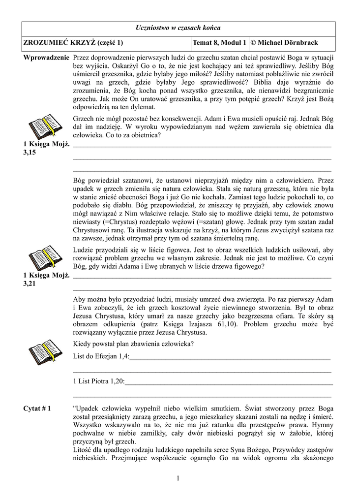 Uczniostwo w czasach końca ZROZUMIEĆ KRZYŻ (część 1) Temat 8, Moduł 1 © Michael Dörnbrack Wprowadzenie Przez doprowadzenie pierwszych ludzi do grzechu szatan chciał postawić Boga w sytuacji bez wyjścia. Oskarżył Go o to, że nie jest kochający ani też sprawiedliwy. Jeśliby Bóg uśmiercił grzesznika, gdzie byłaby jego miłość? Jeśliby natomiast pobłażliwie nie zwrócił uwagi na grzech, gdzie byłaby Jego sprawiedliwość? Biblia daje wyraźnie do zrozumienia, że Bóg kocha ponad wszystko grzesznika, ale nienawidzi bezgranicznie grzechu. Jak może On uratować grzesznika, a przy tym potępić grzech? Krzyż jest Bożą odpowiedzią na ten dylemat. Grzech nie mógł pozostać bez konsekwencji. Adam i Ewa musieli opuścić raj. Jednak Bóg dał im nadzieję. W wyroku wypowiedzianym nad wężem zawierała się obietnica dla człowieka. Co to za obietnica? 1 Księga Mojż. ________________________________________________________________________ 3,15 ________________________________________________________________________ ________________________________________________________________________ Bóg powiedział szatanowi, że ustanowi nieprzyjaźń między nim a człowiekiem. Przez upadek w grzech zmieniła się natura człowieka. Stała się naturą grzeszną, która nie była w stanie znieść obecności Boga i już Go nie kochała. Zamiast tego ludzie pokochali to, co podobało się diabłu. Bóg przepowiedział, że zniszczy tę przyjaźń, aby człowiek znowu mógł nawiązać z Nim właściwe relacje. Stało się to możliwe dzięki temu, że potomstwo niewiasty (=Chrystus) rozdeptało wężowi (=szatan) głowę. Jednak przy tym szatan zadał Chrystusowi ranę. Ta ilustracja wskazuje na krzyż, na którym Jezus zwyciężył szatana raz na zawsze, jednak otrzymał przy tym od szatana śmiertelną ranę. Ludzie przyodziali się w liście figowca. Jest to obraz wszelkich ludzkich usiłowań, aby rozwiązać problem grzechu we własnym zakresie. Jednak nie jest to możliwe. Co czyni Bóg, gdy widzi Adama i Ewę ubranych w liście drzewa figowego? 1 Księga Mojż. ________________________________________________________________________ 3,21 ________________________________________________________________________ Aby można było przyodziać ludzi, musiały umrzeć dwa zwierzęta. Po raz pierwszy Adam i Ewa zobaczyli, że ich grzech kosztował życie niewinnego stworzenia. Był to obraz Jezusa Chrystusa, który umarł za nasze grzechy jako bezgrzeszna ofiara. Te skóry są obrazem odkupienia (patrz Księga Izajasza 61,10). Problem grzechu może być rozwiązany wyłącznie przez Jezusa Chrystusa. Kiedy powstał plan zbawienia człowieka? List do Efezjan 1,4:________________________________________________________ ________________________________________________________________________ 1 List Piotra 1,20:__________________________________________________________ ________________________________________________________________________ Cytat # 1 "Upadek człowieka wypełnił niebo wielkim smutkiem. Świat stworzony przez Boga został przesiąknięty zarazą grzechu, a jego mieszkańcy skazani zostali na nędzę i śmierć. Wszystko wskazywało na to, że nie ma już ratunku dla przestępców prawa. Hymny pochwalne w niebie zamilkły, cały dwór niebieski pogrążył się w żałobie, której przyczyną był grzech. Litość dla upadłego rodzaju ludzkiego napełniła serce Syna Bożego, Przywódcy zastępów niebieskich. Przejmujące współczucie ogarnęło Go na widok ogromu zła skażonego 1 świata. Wiedziony Bożą miłością ułożył plan odkupienia ludzkości. Sprzeniewierzenie się prawu Bożemu wymagało śmierci grzesznika. W całym wszechświecie On jeden tylko mógł – w imieniu człowieka – zaspokoić wymagania prawa. Ponieważ prawo Boże jest tak święte jak sam Bóg, jedynie istota równa Bogu mogła zadośćuczynić przestępstwu. Jedynie Chrystus mógł wybawić upadły rodzaj ludzki od ciążącego na nim przekleństwa i przywrócić utraconą harmonię między niebem a ziemią. Chrystus miał przyjąć na siebie cały ciężar i cień grzechu, który był tak obmierzły Bogu, iż musiał stworzyć na pewien czas rozdział między Ojcem a Synem. Chrystus miał zstąpić na samo dno nędzy, aby wybawić upadłą ludzkość. Wstawił się u Ojca za grzesznikami, zaś zastęp niebieski oczekiwał wyników z ogromną uwagą, jakiej nie sposób wyrazić słowami. Długo trwała „tajemnicza rada pokoju” (Księga Zachariasza 6,13), na której rozstrzygano losy upadłych synów ludzkich. Plan wybawienia ułożony był przed stworzeniem świata, ponieważ napisano: „Oddadzą mu pokłon wszyscy mieszkańcy ziemi, każdy, którego imię nie jest od założenia świata zapisane w księdze żywota Baranka, który został zabity” (Objawienie Jana 13,8). Mimo to ciężko było samemu Królowi wszechświata zezwolić swojemu Synowi umrzeć za grzechy rodzaju ludzkiego. Lecz „Bóg tak umiłował świat, że Syna swego jednorodzonego dał, aby każdy, kto weń wierzy, nie zginął, ale miał żywot wieczny“ (Ewangelia Jana 3,16). O wielka tajemnico odkupienia! Jak ogromna i nieskończona jest miłość Boża dla świata, który Go nie kochał! Kto może poznać głębię takiej miłości, która „przekracza poznanie” Ef.3,19. Wieki całe nieśmiertelne umysły będą starały się zrozumieć w podziwie i uwielbieniu wielką tajemnicę tej niepojętej miłości" (Patriarchowie i prorocy, wyd. 2, s. 42-43). Cytat # 2 "Plan, który jedynie mógł być ratunkiem dla człowieka, poruszył swą niezmierzoną ofiarą niebiosa. Aniołowie nie mogli się cieszyć, kiedy Chrystus wyjawił im plan odkupienia. Widzieli bowiem, że wybawienie człowieka dokonać się może jedynie kosztem niewysłowionych cierpień ich ukochanego Pana. Z podziwem i smutkiem przysłuchiwali się słowom Chrystusa, kiedy Ten tłumaczył im, iż musi opuścić niebo, pełne czyst