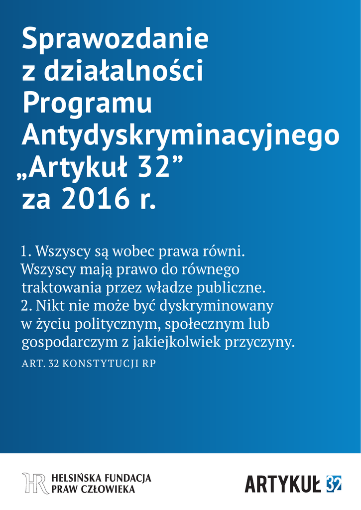 Sprawozdanie z działalności Programu Antydyskryminacyjnego „Artykuł 32” za 2016 r. 1. Wszyscy są wobec prawa równi. Wszyscy mają prawo do równego traktowania przez władze publiczne. 2. Nikt nie może być dyskryminowany w życiu politycznym, społecznym lub gospodarczym z jakiejkolwiek przyczyny. art. 32 konstytucji rp Przedmiotem działalności Programu Antydyskryminacyjnego „Artykuł 32” Helsińskiej Fundacji Praw Człowieka są sprawy z zakresu dyskryminacji. Nazwa Programu nawiązuje do art. 32 Konstytucji RP. Działalność Programu można śledzić na stronie internetowej: www.hfhr.org.pl/dyskryminacja W 2016 r. podjęliśmy działania w ponad 60 różnych sprawach. Zaangażowaliśmy prawników pro bono do 14 nowych spraw, podejmowaliśmy działania interwencyjne w 13 sprawach i obserwowaliśmy 31 rozpraw sądowych. Składaliśmy też opinie przyjaciela sądu i działaliśmy jako organizacja społeczna w postępowaniach. Prowadziliśmy też działalność edukacyjną i badawczą, w ramach której przygotowane zostały dwie publikacje książkowe oraz przeprowadzone zostały szkolenia dla sędziów, prokuratorów i adwokatów w całej Polsce. Działalność o charakterze litygacyjnym i interwencyjnym W 2016 r. podejmowaliśmy działania litygacyjne i interwencyjne dotyczące różnych obszarów dyskryminacji: Dyskryminacja z powodu niepełnosprawności: • orzekanie o ubezwłasnowolnieniu wbrew krajowym i międzynarodowym standardom nakazującym szanować godność i autonomię osób z niepełnosprawnościami; • dostępność dla osób z niepełnosprawnościami usług świadczonych przez banki i przewoźników kolejowych; • różnicowanie sytuacji posiadaczy różnych rodzajów psów asystujących pod względem prawa do ulg w przejazdach koleją oraz ulg podatkowych; • niewywiązywanie się władz samorządowych z obowiązku zapewnienia dowozu do szkół uczniom z niepełnosprawnościami; Wyrok w sprawie niewpuszczenia do busa osoby z psem asystującym Sąd Okręgowy Warszawa-Praga w Warszawie stwierdził w wyroku naruszenie dóbr osobistych klientki HFPC poruszającej się z psem asystującym, której kierowca autobusu odmówił możliwości wstępu do pojazdu ze względu na obecność psa. W uzasadnieniu wyroku sąd podkreślił, że takie zachowanie kierowcy stanowiło rażący przykład dyskryminacji klientki ze względu na niepełnosprawność i naruszyło jej godność. Klientka w toku procesu była reprezentowana przez prawników pro bono adw. Aleksandra Woźnickiego oraz adw. Rafała Karbowniczka. • brak możliwości wypłaty świadczenia pielęgnacyjnego lub jego części opiekunom osób z niepełnosprawnościami, którzy mają ustalone prawo do emerytury, mimo że emerytura jest znacząco niższa od świadczenia pielęgnacyjnego; • nieprawidłowości podczas postępowania administracyjnego w sprawie orzekania o stopniu niepełnosprawności; • dyskryminacja osób z HIV w zakresie ochrony zdrowia; • odmowa zatrudnienia z powodu hemofilii. Dostosowania dla osób z niepełnosprawnościami podczas egzaminów wstępnych na aplikacje prawnicze Od 2016 r. osoby z niepełnosprawnościami mogą liczyć na dostosowania podczas przebiegu egzaminów wstępnych na aplikacje adwokacką, radcowską i notarialną. Do tej pory osoby z niepełnosprawnością mogły liczyć jedynie na wydłużony czas egzaminu oraz dostosowanie jego formy podczas egzaminów zawodowych (egz. adwokackiego, radcowskiego i notarialnego). Brak analogicznych dostosowań na egzaminach wstępnych stanowił istotny wyłom w procesie edukacji prawników. Wprowadzone przez Ministerstwo Sprawiedliwości zmiany są odpowiedzią na postulaty, które zgłaszaliśmy od 2013 r. Więcej bankomatów dostępnych dla osób niewidomych Jeden z banków sprzedał klientowi, będącemu osobą niewidomą, kartę płatniczą, z której nie mógł on w zasadzie korzystać, ponieważ żaden z bankomatów w jego mieście nie był udźwiękowiony. Ostatecznie po naszych interwencjach w Związku Banków Polskich i Urzędzie Ochrony Konkurencji i Konsumentów bank zaczął stopniowo udźwiękawiać swoje bankomaty (liczba dostosowanych bankomatów podwoiła się), w tym te położone w miejscu zamieszkania naszego klienta. Dyskryminacja z powodu działalności związkowej: Dyskryminacja z powodu pochodzenia narodowego i etnicznego: • dyskryminacja działaczy związkowych w jednej ze spółek kolejowych; • eksmisja Romów z koczowiska przy ul. Paprotnej we Wrocławiu; • dyskryminacja katechety w zakresie rozwiązania stosunku pracy. • zatrzymanie obywatela Syrii w Zgorzelcu przez firmę ochroniarską Fenix; • wypowiedzenie umowy rachunku bankowego ze względu na pochodzenie narodowe. Wyrok w sprawie katechety zwolnionego mimo ochrony związkowej Skarga do ETPCz ws. likwidacji romskiego koczowiska Sąd Rejonowy Poznań-Grunwald i Jeżyce w Poznaniu stwierdził w wyroku, że zwolnienie katechety, będącego także nauczycielem historii, zgodnie z uproszczonym trybem rozwiązywania stosunku pracy z nauczycielami religii, stanowiło nadużycie prawa i było sprzeczne z zasadami współżycia społecznego. Katecheta w tej sprawie został zwolniony mimo przysługiwania mu szczególnej ochrony związkowej. Klienta reprezentowali prawnicy pro bono r.pr. Piotr Kryczek oraz mec. Weronika Papucewicz (wyrok jest nieprawomocny). Romowie opuścili swoje miejW styczniu 2016 r. przygotowaliśmy w imieniu 16 klientów sce zamieszkania rano 22 lipca pochodzenia romskiego skargę i wtedy koczowisko zostało wyburzone. W związku z tym do Europejskiego Trybunału skarżący utracili miejsce zaPraw Człowieka w Strasburgu mieszkania oraz należące do dotyczącą wyburzenia w lipcu nich rzeczy. W skardze zarzu2015 r. przez Miasto Wrocław ich domów na koczowisku przy cono m.in. naruszenie zakazu tortur, nieludzkiego i poniżaul. Paprotnej. Romowie nie jącego traktowania, prawa do wiedzieli o planowanym wyposzanowania ży
