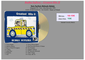 Budka Suflera – Greatest Hits II Rock, Pop-Rock, Weltmusik, Balladen Original CD / New Abra Records 1999 EAN: 0724352236725 / Nr.NA030 / Made in Poland Wert ca.: Unser Preis: 10-15€ 10€ Zustand: Cover(1), Disc(1) 1. Twoje Radio 2. Martwe Morze 3. Sur Le Pont D'Avignon 4. V Bieg 5. Jeden Raz 6. Ragtime 7. Noc 8. Nowa Wieża Babel 9. Ona Przyszła Prosto Z Chmur 10. Noc Komety 11. Giganci Tańczą 12. W Niewielu Słowach 13. Takie Tango 14. Cisza, Jak Ta