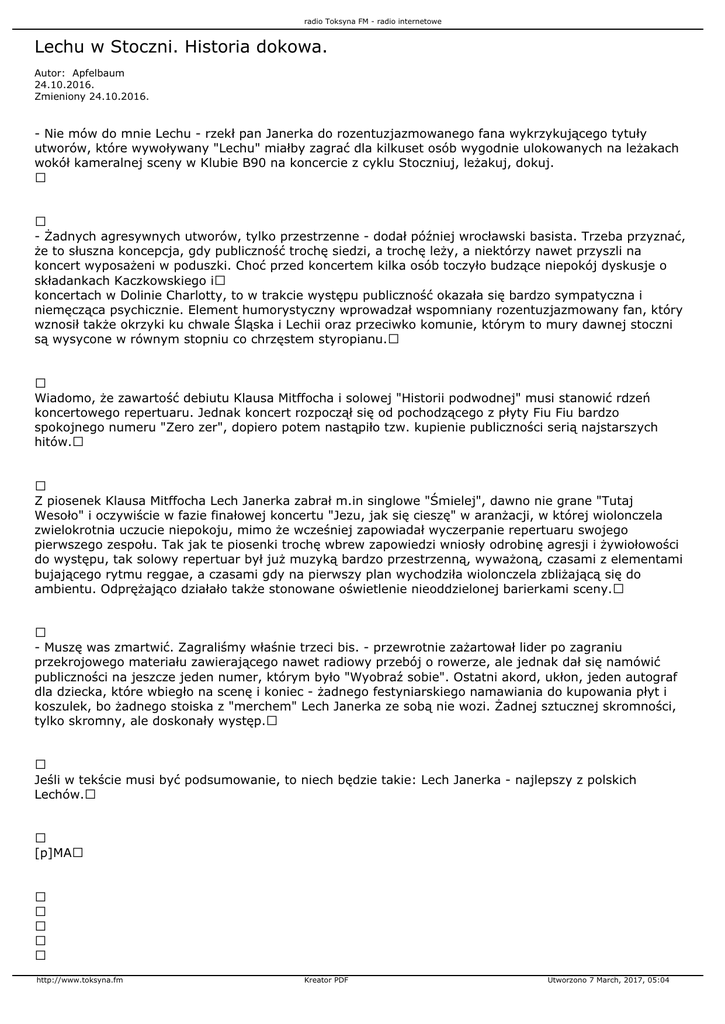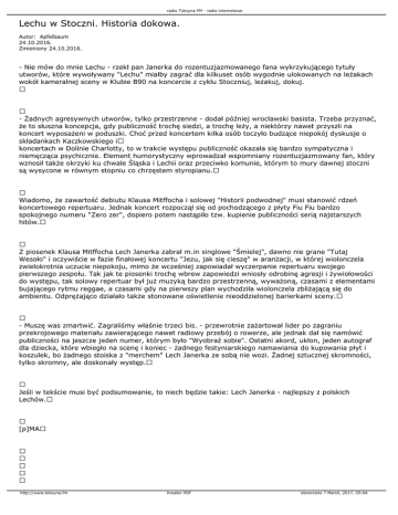 radio Toksyna FM - radio internetowe Lechu w Stoczni. Historia dokowa. Autor: Apfelbaum 24.10.2016. Zmieniony 24.10.2016. - Nie mów do mnie Lechu - rzekł pan Janerka do rozentuzjazmowanego fana wykrzykującego tytuły utworów, które wywoływany "Lechu" miałby zagrać dla kilkuset osób wygodnie ulokowanych na leżakach wokół kameralnej sceny w Klubie B90 na koncercie z cyklu Stoczniuj, leżakuj, dokuj. - Żadnych agresywnych utworów, tylko przestrzenne - dodał później wrocławski basista. Trzeba przyznać, że to słuszna koncepcja, gdy publiczność trochę siedzi, a trochę leży, a niektórzy nawet przyszli na koncert wyposażeni w poduszki. Choć przed koncertem kilka osób toczyło budzące niepokój dyskusje o składankach Kaczkowskiego i koncertach w Dolinie Charlotty, to w trakcie występu publiczność okazała się bardzo sympatyczna i niemęcząca psychicznie. Element humorystyczny wprowadzał wspomniany rozentuzjazmowany fan, który wznosił także okrzyki ku chwale Śląska i Lechii oraz przeciwko komunie, którym to mury dawnej stoczni są wysycone w równym stopniu co chrzęstem styropianu. Wiadomo, że zawartość debiutu Klausa Mitffocha i solowej "Historii podwodnej" musi stanowić rdzeń koncertowego repertuaru. Jednak koncert rozpoczął się od pochodzącego z płyty Fiu Fiu bardzo spokojnego numeru "Zero zer", dopiero potem nastąpiło tzw. kupienie publiczności serią najstarszych hitów. Z piosenek Klausa Mitffocha Lech Janerka zabrał m.in singlowe "Śmielej", dawno nie grane "Tutaj Wesoło" i oczywiście w fazie finałowej koncertu "Jezu, jak się cieszę" w aranżacji, w której wiolonczela zwielokrotnia uczucie niepokoju, mimo że wcześniej zapowiadał wyczerpanie repertuaru swojego pierwszego zespołu. Tak jak te piosenki trochę wbrew zapowiedzi wniosły odrobinę agresji i żywiołowości do występu, tak solowy repertuar był już muzyką bardzo przestrzenną, wyważoną, czasami z elementami bujającego rytmu reggae, a czasami gdy na pierwszy plan wychodziła wiolonczela zbliżającą się do ambientu. Odprężająco działało także stonowane oświetlenie nieoddzielonej barierkami sceny. - Muszę was zmartwić. Zagraliśmy właśnie trzeci bis. - przewrotnie zażartował lider po zagraniu przekrojowego materiału zawierającego nawet radiowy przebój o rowerze, ale jednak dał się namówić publiczności na jeszcze jeden numer, którym było "Wyobraź sobie". Ostatni akord, ukłon, jeden autograf dla dziecka, które wbiegło na scenę i koniec - żadnego festyniarskiego namawiania do kupowania płyt i koszulek, bo żadnego stoiska z "merchem" Lech Janerka ze sobą nie wozi. Żadnej sztucznej skromności, tylko skromny, ale doskonały występ. Jeśli w tekście musi być podsumowanie, to niech będzie takie: Lech Janerka - najlepszy z polskich Lechów. [p]MA http://www.toksyna.fm Kreator PDF Utworzono 7 March, 2017, 05:04 radio Toksyna FM - radio internetowe http://www.toksyna.fm Kreator PDF Utworzono 7 March, 2017, 05:04