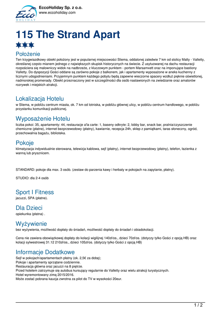 EccoHoliday Sp. z o.o. www.eccoholiday.com 115 The Strand Apart Położenie Ten trzygwiazdkowy obiekt położony jest w popularnej miejscowości Sliema, oddalonej zaledwie 7 km od stolicy Malty - Valletty, określanej często mianem jednego z największych skupisk historycznych na świecie. Z usytuowanej na dachu restauracji rozpościera się malowniczy widok na nadbrzeże, z kluczowym punktem - portem Marsamxett oraz na imponujące bastiony Valletty. Do dyspozycji Gości oddane są zarówno pokoje z balkonem, jak i apartamenty wyposażone w aneks kuchenny z licznymi udogodnieniami. Przyjemnym punktem każdego pobytu będą zapewne wieczorne spacery wzdłuż pięknie oświetlonej, nadmorskiej promenady. Obiekt przeznaczony jest w szczególności dla osób nastawionych na zwiedzanie oraz amatorów rozrywek i miejskich atrakcji. Lokalizacja Hotelu w Sliema, w pobliżu centrum miasta, ok. 7 km od lotniska, w pobliżu głównej ulicy, w pobliżu centrum handlowego, w pobliżu przystanku komunikacji publicznej. Wyposażenie Hotelu liczba pokoi: 35, apartamenty: 44, restauracje a'la carte: 1, baseny odkryte: 2, lobby bar, snack bar, pralnia/czyszczenie chemiczne (płatne), internet bezprzewodowy (płatny), kawiarnie, recepcja 24h, sklep z pamiątkami, taras słoneczny, ogród, przechowalnia bagażu, biblioteka. Pokoje klimatyzacja indywidualnie sterowana, telewizja kablowa, sejf (płatny), internet bezprzewodowy (płatny), telefon, łazienka z wanną lub prysznicem. STANDARD: pokoje dla max. 3 osób. (zestaw do parzenia kawy i herbaty w pokojach na zapytanie, płatny). STUDIO: dla 2-4 osób Sport I Fitness jacuzzi, SPA (płatne). Dla Dzieci opiekunka (płatna) . Wyżywienie bez wyżywienia, możliwość dopłaty do śniadań, możliwość dopłaty do śniadań i obiadokolacji. Cena nie zawiera obowiązkowej dopłaty do kolacji wigilijnej 140zł/os., dzieci 70zł/os. (dotyczy tylko Gości z opcją HB) oraz kolacji sylwestrowej 31.12 210zł/os., dzieci 105zł/os. (dotyczy tylko Gości z opcją HB) Informacje Dodatkowe Sejf w pokojach/apartamentach płatny (ok. 2,5€ za dobę); Pokoje i apartamenty sprzątane codziennie. Restauracja główna oraz jacuzzi na 8 piętrze. Przed hotelem zatrzymuje się autobus kursujący regularnie do Valletty oraz wielu atrakcji turystycznych. Hotel wyremontowany zimą 2015/2016. Może zostać pobrana kaucja zwrotna za pilot do TV w wysokości 20eur. 1/2 EccoHoliday Sp. z o.o. www.eccoholiday.com Oferta: Wylot 01.01.1970 Powrót 01.01.1970 godz. godz. Zakwaterowanie -() Dni dni Cena os. dorosła 2/2 Powered by TCPDF (www.tcpdf.org)