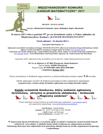 MIĘDZYNARODOWY KONKURS „KANGUR MATEMATYCZNY” 2017 REGION WŁOCŁAWSKI Powiaty: Aleksandrów Kujawski, Lipno, Radziejów, Rypin, Włocławek 16 marca 2017 roku o godzinie 900 po raz dwudziesty szósty w Polsce odbędzie się Międzynarodowy Konkurs „KANGUR MATEMATYCZNY” Termin zgłoszeń – 31 stycznia 2017 r. Uprzejmie informujemy, że Zgłoszenie uczestników do konkursu Kangur MATEMATYCZNY odbywa się wyłącznie drogą elektroniczną. Szkoła zgłasza swoich uczestników za pomocą swojego konta na stronie www.kangur-mat.pl Jeśli konto nie zostało założone (np. w poprzednich edycjach), należy założyć na stronie krajowego organizatora: www.kangur-mat.pl Przed dokonaniem rejestracji należy zapoznać się z umieszczoną tam instrukcją. Logowanie szkół i zgłaszanie liczby uczestników jest już aktywne, wpłaty będą przyjmowane na konto: SP 14, ul. Bukowa 9, 87-800 Włocławek, Rada Rodziców Nazwa banku: KDBS Włocławek Numer konta: 83 9550 0003 2001 0070 5598 0001 z dopiskiem Kangur 2017 Prawo uczestnictwa w Konkursie mają uczniowie, za których dokonana zostanie wpłata 9 zł od osoby. Szkoły zgłaszające uczniów do konkursu przesyłają na adres organizatora regionalnego wygenerowany z konta szkoły formularz zgłoszenia oraz kopię dowodu wpłaty. Każdy uczestnik Konkursu, który zostanie zgłoszony terminowo, otrzyma w prezencie układankę – breloczek „Magiczny sześcian” Więcej informacji na temat konkursu na stronie krajowego organizatora: www.kangur-mat.pl oraz organizatora regionalnego www.sp14wloclawek.neostrada.pl koordynator: Danuta Rybka kontakt: fax 54 412 20 40 lub tel. 692 104 868 e-mail: [email protected] dyżur telefoniczny: czwartek 1300 - 1730 Uwaga!!! W tegorocznej edycji oświadczenie o wyrażeniu zgody na udział w konkursie i przetwarzaniu danych osobowych oraz zmiany w obsłudze konta szkoły (widoczne po zalogowaniu na konto). Informacje dotyczące kart odpowiedzi oraz instrukcja obsługi konta na stronie organizatora krajowego i regionalnego.