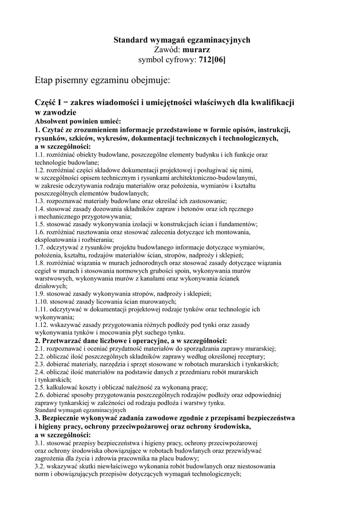 Standard wymagań egzaminacyjnych Zawód: murarz symbol cyfrowy: 712[06] Etap pisemny egzaminu obejmuje: Część I − zakres wiadomości i umiejętności właściwych dla kwalifikacji w zawodzie Absolwent powinien umieć: 1. Czytać ze zrozumieniem informacje przedstawione w formie opisów, instrukcji, rysunków, szkiców, wykresów, dokumentacji technicznych i technologicznych, a w szczególności: 1.1. rozróżniać obiekty budowlane, poszczególne elementy budynku i ich funkcje oraz technologie budowlane; 1.2. rozróżniać części składowe dokumentacji projektowej i posługiwać się nimi, w szczególności opisem technicznym i rysunkami architektoniczno-budowlanymi, w zakresie odczytywania rodzaju materiałów oraz położenia, wymiarów i kształtu poszczególnych elementów budowlanych; 1.3. rozpoznawać materiały budowlane oraz określać ich zastosowanie; 1.4. stosować zasady dozowania składników zapraw i betonów oraz ich ręcznego i mechanicznego przygotowywania; 1.5. stosować zasady wykonywania izolacji w konstrukcjach ścian i fundamentów; 1.6. rozróżniać rusztowania oraz stosować zalecenia dotyczące ich montowania, eksploatowania i rozbierania; 1.7. odczytywać z rysunków projektu budowlanego informacje dotyczące wymiarów, położenia, kształtu, rodzajów materiałów ścian, stropów, nadproży i sklepień; 1.8. rozróżniać wiązania w murach jednorodnych oraz stosować zasady dotyczące wiązania cegieł w murach i stosowania normowych grubości spoin, wykonywania murów warstwowych, wykonywania murów z kanałami oraz wykonywania ścianek działowych; 1.9. stosować zasady wykonywania stropów, nadproży i sklepień; 1.10. stosować zasady licowania ścian murowanych; 1.11. odczytywać w dokumentacji projektowej rodzaje tynków oraz technologie ich wykonywania; 1.12. wskazywać zasady przygotowania różnych podłoży pod tynki oraz zasady wykonywania tynków i mocowania płyt suchego tynku. 2. Przetwarzać dane liczbowe i operacyjne, a w szczególności: 2.1. rozpoznawać i oceniać przydatność materiałów do sporządzania zaprawy murarskiej; 2.2. obliczać ilość poszczególnych składników zaprawy według określonej receptury; 2.3. dobierać materiały, narzędzia i sprzęt stosowane w robotach murarskich i tynkarskich; 2.4. obliczać ilość materiałów na podstawie danych z przedmiaru robót murarskich i tynkarskich; 2.5. kalkulować koszty i obliczać należność za wykonaną pracę; 2.6. dobierać sposoby przygotowania poszczególnych rodzajów podłoży oraz odpowiedniej zaprawy tynkarskiej w zależności od rodzaju podłoża i warstwy tynku. Standard wymagań egzaminacyjnych 3. Bezpiecznie wykonywać zadania zawodowe zgodnie z przepisami bezpieczeństwa i higieny pracy, ochrony przeciwpożarowej oraz ochrony środowiska, a w szczególności: 3.1. stosować przepisy bezpieczeństwa i higieny pracy, ochrony przeciwpożarowej oraz ochrony środowiska obowiązujące w robotach budowlanych oraz przewidywać zagrożenia dla życia i zdrowia pracownika na placu budowy; 3.2. wskazywać skutki niewłaściwego wykonania robót budowlanych oraz niestosowania norm i obowiązujących przepisów dotyczących wymagań technologicznych; 3.3. wskazywać zagrożenia dla życia i zdrowia występujące podczas wykonywania prac murarskich i tynkarskich; 3.4. dobrać odpowiednią odzież roboczą i sprzęt ochrony indywidualnej do wykonywanych robót murarskich i tynkarskich; 3.5. stosować przepisy bezpieczeństwa i higieny pracy, ochrony przeciwpożarowej oraz ochrony środowiska obowiązujące w robotach murarskich i tynkarskich; 3.6. wskazywać i stosować normy, przepisy, warunki techniczne wykonywania i odbioru robót murarskich i tynkarskich oraz przewidywać skutki ich nieprzestrzegania; 3.7. wskazywać działania w sytuacjach wymagających udzielenia pomocy przedlekarskiej. Część II − zakres wiadomości i umiejętności związanych z zatrudnieniem i działalnością gospodarczą Absolwent powinien umieć: 1. Czytać ze zrozumieniem informacje przedstawione w formie opisów, instrukcji, tabel, wykresów, a w szczególności: 1.1. rozróżniać podstawowe pojęcia i terminy z obszaru funkcjonowania gospodarki oraz prawa pracy, prawa podatkowego i przepisów regulujących podejmowanie i wykonywanie działalności gospodarczej; 1.2. rozróżniać dokumenty związane z zatrudnieniem oraz podejmowaniem i wykonywaniem działalności gospodarczej; 1.3. identyfikować i analizować informacje dotyczące wymagań i uprawnień pracownika, pracodawcy, bezrobotnego i klienta. 2. Przetwarzać dane liczbowe i operacyjne, a w szczególności: 2.1. analizować informacje związane z podnoszeniem kwalifikacji, poszukiwaniem pracy i zatrudnieniem oraz podejmowaniem i wykonywaniem działalności gospodarczej; 2.2. sporządzać dokumenty związane z poszukiwaniem pracy i zatrudnieniem oraz z podejmowaniem i wykonywaniem działalności gospodarczej; 2.3. rozróżniać skutki wynikające z nawiązania i rozwiązania stosunku pracy. Etap praktyczny egzaminu obejmuje praktyczne umiejętności z zakresu kwalifikacji w zawodzie, objęte tematami: 1. Wykonanie fragmentu muru zgodnie z dokumentacją, w zadanym wiązaniu i określonej technice murowania. 2. Wykonanie zadanego rodzaju tynku na wyznaczonym fragmencie ściany. Absolwent powinien umieć: 1. Planować czynności związane z wykonaniem zadania: 1.1. sporządzić plan działania; Standard wymagań egzaminacyjnych 1.2. sporządzić wykaz niezbędnych surowców, materiałów, sprzętu kontrolno-pomiarowego, narzędzi; 1.3. wykonać niezbędne obliczenia, rysunki lub szkice pomocnicze. 2. Organizować stanowisko pracy: 2.1. zgromadzić i rozmieścić na stanowisku pracy materiały, narzędzia, urządzenia i sprzęt zgodnie z zasadami bezpieczeństwa i higieny pracy oraz ochrony przeciwpożarowej; 2.2. sprawdzić stan techniczny maszyn, urządzeń i sprzętu; 2.3. dobrać odzież roboczą i środki ochrony indywidu