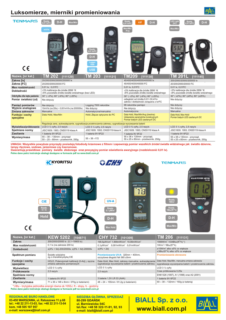 Luksomierze, mierniki promieniowania Rozdz. 0,01 lx/FC D-H Rozdz. 0,01 lx/FC Max/Min cd LED Light (DC) D-H Max/Min Avg mV/lx Rozdz. 0,01 lx/FC D-H Max/Min Rozdz. 0,01 lx/FC D-H Logger 7000 USB Nazwa, [nr kat.] TM 202 Zakres [lx] Zakres [FC] Max rozdzielczość Dokładność 20/200/2000/20000/200000 lx Odchyłka dla kąta padania Pomiar światłości (cd) Pamięć pomiarów Wyjście analogowe Zmiana zakresów Funkcje i cechy specjalne Wyświetlacz/próbkowanie Spełniane normy Zasilanie Wymiary/masa TM 203 [111120] TM209 [111121] 20/200/2000/20000 FC 0,01 lx; 0,01FC ±3% kalibracja dla źródła 2856 °K ±6% pozostałe źródła światła widzialnego (bez LED) 30° ( ±2%); 60° (±6%); 80° (±25%) 30° ( ±2%); 60° (±6%); 80° (±25%) odległość od źródła 0,01~30,47m zakres i dokładność związana z lx/FC 99 rekordów pamięci Nie dotyczy Automatyczna Data Hold, Max/Min/Avg (średnia) Ustawianie parametrów korekcyjnych Pomiar białych LED zasilanych DC Nie dotyczy Nie dotyczy 10mV/lx (na 20lx) ~ 0,001mV/lx (na 200000lx) Manualna Data Hold, Max/Min TM 201L [111130] 40/400/4000/40000/400000 lx 40/400/4000/40000 FC 0,01 lx, 0,01FC ±3% kalibracja dla źródła 2856 °K ±6% pozostałe źródła światła widzialnego Logging 7000 rekordów Nie dotyczy Automatyczna/manualna Hold; Złącze optyczne do PC [111145] 200/2000/20000/200000 lx 20/200/2000/20000 FC 0,01 lx, 0,01FC ±3% kalibracja dla źródła 2856 °K ±8% pozostałe źródła światła widzialnego 30° ( ±2%); 60° (±6%); 80° (±25%) Nie dotyczy Nie dotyczy Nie dotyczy Manualna Data Hold, Max Hold Pomiar białych LED zasilanych DC Regulacja zera, autowyłączanie, sygnalizacja przekroczenia zakresu, sygnalizacja wyczerpania baterii LCD 3 ¾ cyfry, 2,5 razy/s LCD 3 ½ cyfry, 2,5 razy/s LCD 3 ½ cyfry, 2,5 razy/s JISC1609: 1993; CNS5119 klasa A JISC1609: 1993; CNS5119 klasa A JISC1609: 1993; CNS5119 klasa A LCD 3 ½ cyfry, 2,5 razy/s 1 bateria 9V 6F22 55 ´ 38 ´ 130mm - przyrząd 55 ´ 25 ´ 80mm - przetwornik, 250g 1 bateria 9V 6F22 55 x 38 x 130mm - przyrząd, 55 x 25 x 80mm - przetwornik, 250g 1 bateria 9V 6F22 1 bateria 9V 6F22 55 x 38 x 130mm - przyrząd, 55 x 25 x 80mm - przetwornik, 250g 55 ´ 38 ´172 JISC1609: 1993; CNS5119 klasa A UWAGA: Wszystkie powyższe przyrządy posiadają fotodiody krzemowe z filtrem i zapewniają pomiar wszelkich źródeł światła widzialnego jak: światło dzienne, lampy rtęciowe, sodowe, jarzeniowe czy ksenonowe. Gwarantują prawidłowe pomiary światła złożonego oraz precyzyjny pomiar oświetlenia awaryjnego (rozdzielczość 0,01 lx). Pełne dane patrz instrukcje obsługi dostępne w formacie pdf na www.biall.com.pl CIE UV-A Rozdz.2 1W/m Rozdz. 0,1 lx Rozdz. 0,1 µW/m2 Rozdz. 1Btu/(ft2*h) D-H D-H Hold Max/Min Max Hold Nazwa, [nr kat.] KEW 5202 Zakres Max rozdzielczość Dokładność 200/2000/20000 lx (0,1~19900 lx) CHY 732 [104871] TM 206 [101309] 2 2 199,9µW/cm 1,999mW/cm 19,99mW/cm [111131] 1999W/m2 / 634Btu/(ft2*h) *) 1W/m2 / 1Btu/(ft2*h) 0,1 lx (na zakresie 200 lx) 0,1µW/cm2 ±(4% + 5d)-200/2000lx; ±(5% + 4d)-20000lx ±(4% + 2d) ±10W/m2 albo ±5% co większe ±3Btu/(ft2*h) albo ±5% co większe Spektrum pomiaru Światło widzialne zg z charakterystyką CIE Promieniowanie UV-A: 320nm ~ 400nm, szczytowa długość fali 365 ±5nm Promieniowanie słoneczne Funkcje i cechy specjalne HOLD, Potencjometr kalibracji (0-Adj.), ręczna zmiana zakresów pomiarowych Data Hold, Max Hold, zakresy manualne, autowyłączanie Data Hold, Max/Min, manualna zmiana zakresów sygnalizacja wyczerpania baterii i przekroczenia zakresu sygnalizacja wyczerpania baterii i przekroczenia zakresu LCD 3 ½ cyfry LCD 3 ½ cyfry 2,5 razy/s 2,5 razy/s 1 bateria 9V 6F22 3 baterie 1,5V LR 03 (AAA) 71 x 36 x 148 x 8mm / 270g (z bateriami) 48 ´ 24 ´ 155mm / 81,2g (z bateriami) Wyświetlacz Próbkowanie Spełniane normy Zasilanie Wymiary/masa 0,001mW/cm2 0,01mW/cm2 2 LCD 3 ½ cyfry Czas próbkowania 0,25s EN61326 (1997), A1 (1998) oraz A2 (2001) 1 bateria 9V 6F22 60 ´ 38 ´ 132mm / 150g (z baterią) *) Btu - brytyjska jednostka energii równa ok.1055J, ft - stopy, h - godziny Pełne dane patrz instrukcje obsługi dostępne w formacie pdf na www.biall.com.pl REGIONALNE BIURO HANDLOWE 03-450 WARSZAWA, ul. Ratuszowa 11 p.68 tel.: +48 22 211-13-03, fax: +48 22 211-13-04 kom. +48 505 107 957 e-mail: [email protected] SIEDZIBA GŁÓWNA, SPRZEDAŻ 80-299 GDAŃSK ul. Barniewicka 54C tel./fax: +48 58 322-11-91, 92, 93 e-mail: [email protected] BIALL Sp. z o.o. www.biall.com.pl