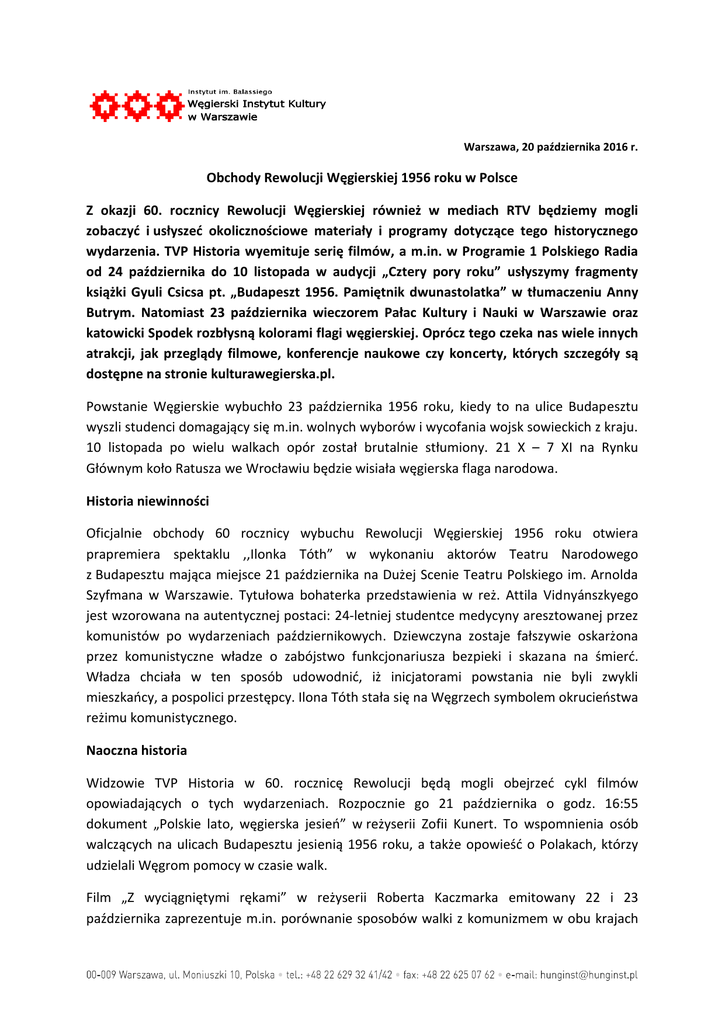 Warszawa, 20 października 2016 r. Obchody Rewolucji Węgierskiej 1956 roku w Polsce Z okazji 60. rocznicy Rewolucji Węgierskiej również w mediach RTV będziemy mogli zobaczyć i usłyszeć okolicznościowe materiały i programy dotyczące tego historycznego wydarzenia. TVP Historia wyemituje serię filmów, a m.in. w Programie 1 Polskiego Radia od 24 października do 10 listopada w audycji „Cztery pory roku” usłyszymy fragmenty książki Gyuli Csicsa pt. „Budapeszt 1956. Pamiętnik dwunastolatka” w tłumaczeniu Anny Butrym. Natomiast 23 października wieczorem Pałac Kultury i Nauki w Warszawie oraz katowicki Spodek rozbłysną kolorami flagi węgierskiej. Oprócz tego czeka nas wiele innych atrakcji, jak przeglądy filmowe, konferencje naukowe czy koncerty, których szczegóły są dostępne na stronie kulturawegierska.pl. Powstanie Węgierskie wybuchło 23 października 1956 roku, kiedy to na ulice Budapesztu wyszli studenci domagający się m.in. wolnych wyborów i wycofania wojsk sowieckich z kraju. 10 listopada po wielu walkach opór został brutalnie stłumiony. 21 X – 7 XI na Rynku Głównym koło Ratusza we Wrocławiu będzie wisiała węgierska flaga narodowa. Historia niewinności Oficjalnie obchody 60 rocznicy wybuchu Rewolucji Węgierskiej 1956 roku otwiera prapremiera spektaklu ,,Ilonka Tóth” w wykonaniu aktorów Teatru Narodowego z Budapesztu mająca miejsce 21 października na Dużej Scenie Teatru Polskiego im. Arnolda Szyfmana w Warszawie. Tytułowa bohaterka przedstawienia w reż. Attila Vidnyánszkyego jest wzorowana na autentycznej postaci: 24-letniej studentce medycyny aresztowanej przez komunistów po wydarzeniach październikowych. Dziewczyna zostaje fałszywie oskarżona przez komunistyczne władze o zabójstwo funkcjonariusza bezpieki i skazana na śmierć. Władza chciała w ten sposób udowodnić, iż inicjatorami powstania nie byli zwykli mieszkańcy, a pospolici przestępcy. Ilona Tóth stała się na Węgrzech symbolem okrucieństwa reżimu komunistycznego. Naoczna historia Widzowie TVP Historia w 60. rocznicę Rewolucji będą mogli obejrzeć cykl filmów opowiadających o tych wydarzeniach. Rozpocznie go 21 października o godz. 16:55 dokument „Polskie lato, węgierska jesień” w reżyserii Zofii Kunert. To wspomnienia osób walczących na ulicach Budapesztu jesienią 1956 roku, a także opowieść o Polakach, którzy udzielali Węgrom pomocy w czasie walk. Film „Z wyciągniętymi rękami” w reżyserii Roberta Kaczmarka emitowany 22 i 23 października zaprezentuje m.in. porównanie sposobów walki z komunizmem w obu krajach oraz efekty wolnościowych zrywów. „Nasz brat Béla Varga” w reżyserii Sylwestera Kiełbiewskiego opowie 23 października o godzinie 19.20 o życiu i działalności węgierskiego księdza Béla Vargi, który podczas II wojny światowej organizował opiekę na polskimi uchodźcami. 30 października o godzinie 19.30 zobaczymy dokument „Za ołowianą bramą. Kardynał József Mindszenty” w reżyserii Gilberto Martinelliego, a 30 października o 22.30 film pt. „Zdławiona nadzieja – Węgry 1956” w reżyserii Macieja Zakrockiego. Cykl w TVP Historia zakończy się 4 listopada. Tego dnia o godz. 16.40 będzie można zobaczyć film „13 lat, 13 minut” w reż. Marka Maldisa, o godz. 22.25 rozpocznie się film „Niepochowany” w reżyserii Márty Mészáros, który przedstawia losy Imre Nagya, byłego premiera Węgier, który podczas Powstania domagał się wycofania z kraju wojsk sowieckich i zapowiadał wolne wybory. W ramach zemsty został osądzony przez reżim Jánosa Kádára w tajnym procesie i skazany na śmierć. Lektura w radiu W Programie 1 Polskiego Radia od 24 października do 10 listopada w audycji „Cztery pory roku” o godz. 10.35 usłyszymy fragmenty książki Gyuli Csicsa pt. „Budapeszt 1956. Pamiętnik dwunastolatka” w tłumaczeniu Anny Butrym. Czterominutowe fragmenty będzie czytał aktor Teatru Studio w Warszawie, znakomity interpretator prozy Wojciech Żołądkowicz. Na innych antenach będzie można również usłyszeć wiele okolicznościowych nagrań rozmów i wywiadów także z naocznymi świadkami tamtejszych wydarzeń. Obchody od morza do Tatr W całej Polsce będzie miały miejsce liczne obchody, konferencje, koncerty i inne formy upamiętnienia ówczesnych wydarzeń. W celu poznania ich harmonogramu serdecznie zapraszamy na stronę: www.kulturawegier.pl bądź do zadawania bezpośrednich pytań.