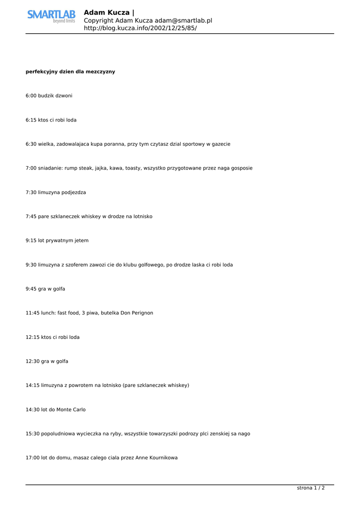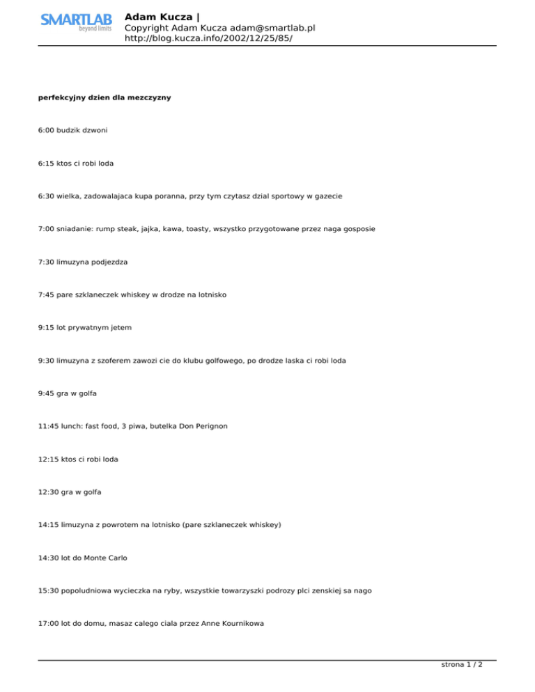 Adam Kucza | Copyright Adam Kucza [email protected] http://blog.kucza.info/2002/12/25/85/ perfekcyjny dzien dla mezczyzny 6:00 budzik dzwoni 6:15 ktos ci robi loda 6:30 wielka, zadowalajaca kupa poranna, przy tym czytasz dzial sportowy w gazecie 7:00 sniadanie: rump steak, jajka, kawa, toasty, wszystko przygotowane przez naga gosposie 7:30 limuzyna podjezdza 7:45 pare szklaneczek whiskey w drodze na lotnisko 9:15 lot prywatnym jetem 9:30 limuzyna z szoferem zawozi cie do klubu golfowego, po drodze laska ci robi loda 9:45 gra w golfa 11:45 lunch: fast food, 3 piwa, butelka Don Perignon 12:15 ktos ci robi loda 12:30 gra w golfa 14:15 limuzyna z powrotem na lotnisko (pare szklaneczek whiskey) 14:30 lot do Monte Carlo 15:30 popoludniowa wycieczka na ryby, wszystkie towarzyszki podrozy plci zenskiej sa nago 17:00 lot do domu, masaz calego ciala przez Anne Kournikowa strona 1 / 2 Adam Kucza | Copyright Adam Kucza [email protected] http://blog.kucza.info/2002/12/25/85/ 18:45 kupa, prysznic, golenie 19:00 ogladasz wiadomosci w telewizji: Brad Pitt zamordowany, marihuana i hardcore-pornos zalegalizowane 19:30 kolacja: rak na przystawke, Dom Perignon (1953), wielki stek, na deser lody serwowane na nagich piersiach 21:00 Napoleon Cognac, Cohuna, ogladasz sport w tv na szerokopanoramicznym duzym odbiorniku, Niemcy pokonuja Holandie 11:0 (od tlum. wstaw wedlug preferencji np. Wisla Krakow - Legia 11:0, albo Widzew-Bayern 11:0) 21:30 sex z trzema kobietami, wszystkie wykazuja sklonnosci do nimfomanii 23:00 masaz i kapiel w whirlpoolu, do tego pizza i duze jasne 23:30 ktos ci robi loda "na dobranoc" 23:45 lezysz sam w lozku 23:50 12-sekudnowy pierd, ktorego ton zmienia sie 4 razy i ktory zmusza psa do opuszczenia pokoju strona 2 / 2