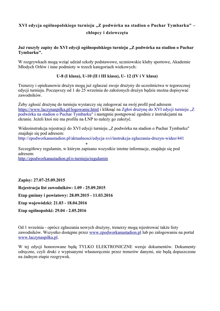 XVI edycja ogólnopolskiego turnieju „Z podwórka na stadion o Puchar Tymbarku" – chłopcy i dziewczęta Już ruszyły zapisy do XVI edycji ogólnopolskiego turnieju „Z podwórka na stadion o Puchar Tymbarku". W rozgrywkach mogą wziąć udział szkoły podstawowe, uczniowskie kluby sportowe, Akademie Młodych Orłów i inne podmioty w trzech kategoriach wiekowych: U-8 (I klasa), U-10 (II i III kiasa), U- 12 (IV i V klasa) Trenerzy i opiekunowie drużyn mogą już zgłaszać swoje drużyny do ucześtnictwa w tegorocznej edycji turnieju. Począwszy od 1 do 25 września do założonych drużyn będzie można dopisywać zawodników. Żeby zgłosić drużynę do turnieju wystarczy się zalogować na swój profil pod adresem https://www.laczynaspilka.pl/logowanie.html i kliknąć na Zgłoś drużynę do XVI edycji turnieju „Z podwórka na stadion o Puchar Tymbarku" i następnie postępować zgodnie z instrukcjami na ekranie. Jeżeli ktoś nie ma profilu na ŁNP to należy go założyć. Wideoinstrukcja rejestracji do XVI edycji turnieju „Z podwórka na stadion o Puchar Tymbarku" znajduje się pod adresem: http://zpodworkanastadion.pl/aktualnosci/edycja-xvi/instrukcja-zglaszania-druzyn-wideo/441 * Szczegółowy regulamin, w którym zapisano wszystkie istotne informacje, znajduje się pod adresem: http://zpodworkanastadion.pl/o-turnieju/regulamin Zapisy: 27.07-25.09.2015 Rejestracja list zawodników: 1.09 - 25.09.2015 Etap gminny i powiatowy: 28.09.2015 - 11.03.2016 Etap wojewódzki: 21.03 - 18.04.2016 Etap ogólnopolski: 29.04 - 2.05.2016 Od 1 września - oprócz zgłaszania nowych drużyny, trenerzy mogą rejestrować także listy zawodników. Wszystko dostępne przez www.zpodworkanastadion.pl lub po zalogowaniu na portal www.laczynaspilka.pl. W tej edycji honorowane będą TYLKO ELEKTRONICZNE wersje dokumentów. Dokumenty odręczne, czyli druki z wypisanymi własnoręcznie przez trenerów danymi, nie będą dopuszczone na żadnym etapie rozgrywek.