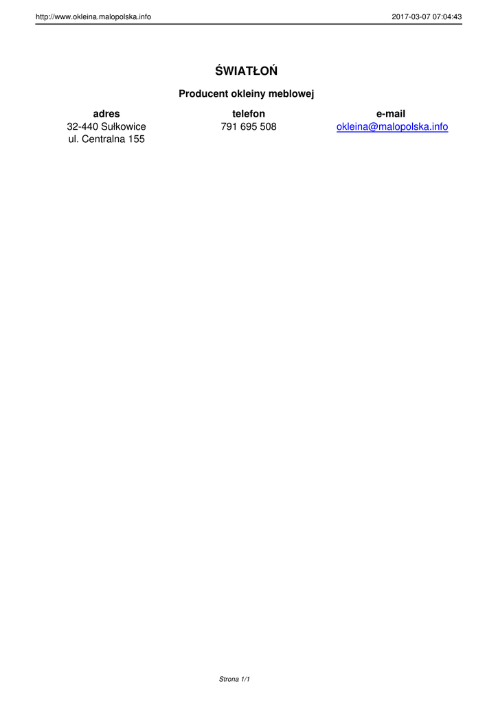 http://www.okleina.malopolska.info 2017-03-07 07:04:43 ŚWIATŁOŃ Producent okleiny meblowej adres 32-440 Sułkowice ul. Centralna 155 telefon 791 695 508 Strona 1/1 e-mail [email protected]