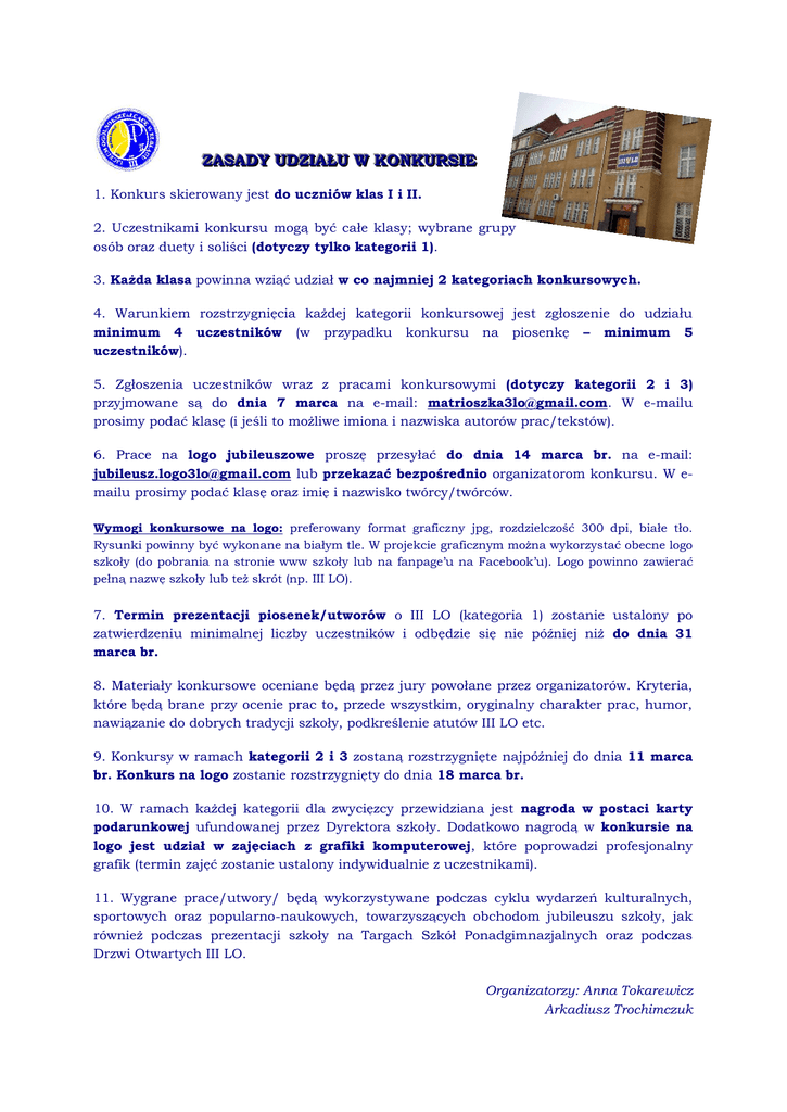 ZZA ASSA AD DY YU UD DZZIIA AŁŁU UW WK KO ON NK KU UR RS SIIE E 1. Konkurs skierowany jest do uczniów klas I i II. 2. Uczestnikami konkursu mogą być całe klasy; wybrane grupy osób oraz duety i soliści (dotyczy tylko kategorii 1). 3. Każda klasa powinna wziąć udział w co najmniej 2 kategoriach konkursowych. 4. Warunkiem rozstrzygnięcia każdej kategorii konkursowej jest zgłoszenie do udziału minimum 4 uczestników (w przypadku konkursu na piosenkę – minimum 5 uczestników). 5. Zgłoszenia uczestników wraz z pracami konkursowymi (dotyczy kategorii 2 i 3) przyjmowane są do dnia 7 marca na e-mail: [email protected]. W e-mailu prosimy podać klasę (i jeśli to możliwe imiona i nazwiska autorów prac/tekstów). 6. Prace na logo jubileuszowe proszę przesyłać do dnia 14 marca br. na e-mail: [email protected] lub przekazać bezpośrednio organizatorom konkursu. W emailu prosimy podać klasę oraz imię i nazwisko twórcy/twórców. Wymogi konkursowe na logo: preferowany format graficzny jpg, rozdzielczość 300 dpi, białe tło. Rysunki powinny być wykonane na białym tle. W projekcie graficznym można wykorzystać obecne logo szkoły (do pobrania na stronie www szkoły lub na fanpage’u na Facebook’u). Logo powinno zawierać pełną nazwę szkoły lub też skrót (np. III LO). 7. Termin prezentacji piosenek/utworów o III LO (kategoria 1) zostanie ustalony po zatwierdzeniu minimalnej liczby uczestników i odbędzie się nie później niż do dnia 31 marca br. 8. Materiały konkursowe oceniane będą przez jury powołane przez organizatorów. Kryteria, które będą brane przy ocenie prac to, przede wszystkim, oryginalny charakter prac, humor, nawiązanie do dobrych tradycji szkoły, podkreślenie atutów III LO etc. 9. Konkursy w ramach kategorii 2 i 3 zostaną rozstrzygnięte najpóźniej do dnia 11 marca br. Konkurs na logo zostanie rozstrzygnięty do dnia 18 marca br. 10. W ramach każdej kategorii dla zwycięzcy przewidziana jest nagroda w postaci karty podarunkowej ufundowanej przez Dyrektora szkoły. Dodatkowo nagrodą w konkursie na logo jest udział w zajęciach z grafiki komputerowej, które poprowadzi profesjonalny grafik (termin zajęć zostanie ustalony indywidualnie z uczestnikami). 11. Wygrane prace/utwory/ będą wykorzystywane podczas cyklu wydarzeń kulturalnych, sportowych oraz popularno-naukowych, towarzyszących obchodom jubileuszu szkoły, jak również podczas prezentacji szkoły na Targach Szkół Ponadgimnazjalnych oraz podczas Drzwi Otwartych III LO. Organizatorzy: Anna Tokarewicz Arkadiusz Trochimczuk