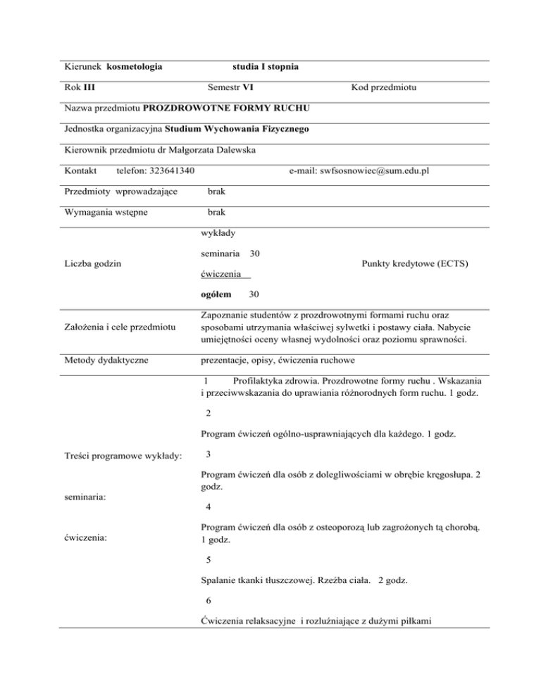 Kierunek kosmetologia Rok III studia I stopnia Semestr VI Kod przedmiotu Nazwa przedmiotu PROZDROWOTNE FORMY RUCHU Jednostka organizacyjna Studium Wychowania Fizycznego Kierownik przedmiotu dr Małgorzata Dalewska Kontakt telefon: 323641340 e-mail: [email protected] Przedmioty wprowadzające brak Wymagania wstępne brak wykłady seminaria 30 Punkty kredytowe (ECTS) Liczba godzin ćwiczenia ogółem 30 Założenia i cele przedmiotu Zapoznanie studentów z prozdrowotnymi formami ruchu oraz sposobami utrzymania właściwej sylwetki i postawy ciała. Nabycie umiejętności oceny własnej wydolności oraz poziomu sprawności. Metody dydaktyczne prezentacje, opisy, ćwiczenia ruchowe 1 Profilaktyka zdrowia. Prozdrowotne formy ruchu . Wskazania i przeciwwskazania do uprawiania różnorodnych form ruchu. 1 godz. 2 Program ćwiczeń ogólno-usprawniających dla każdego. 1 godz. Treści programowe wykłady: 3 Program ćwiczeń dla osób z dolegliwościami w obrębie kręgosłupa. 2 godz. seminaria: 4 ćwiczenia: Program ćwiczeń dla osób z osteoporozą lub zagrożonych tą chorobą. 1 godz. 5 Spalanie tkanki tłuszczowej. Rzeźba ciała. 2 godz. 6 Ćwiczenia relaksacyjne i rozluźniające z dużymi piłkami rehabilitacyjnymi. 2 godz. 7 Program ćwiczeń dla osób otyłych. 1 godz 8 Pilates. Forma ćwiczeń wzmacniających tzw. środek ciała. Działanie lecznicze w schorzeniach kręgosłupa i stawów oraz relaksujące mięśnie. 2 godz. 9 Gry zespołowe do wyboru. Siatkówka. Koszykówka. Piłka nożna. 2 godz. 10 Gry rekreacyjne do wyboru. Kometka, Badminton. 1 godz. Forma i warunki zaliczenia przedmiotu zaliczenie na ocenę na podstawie aktywnego uczestnictwa w zajęciach i oceny sprawdzajęcej wiadomości Efekty kształcenia: Nabycie umiejętności wyboru właściwej formy ruchu w celu utrzymania i poprawy zdrowia. Wykaz literatury podstawowa: 1.Kuński H.: Trening zdrowotny osób dorosłych. Poradnik lekarza i trenera 2. Grodzka-Kubiak E: Aerobik czy fitness. uzupełniająca: 3. J. Orzech: Kształtowanie sylwetki ciała