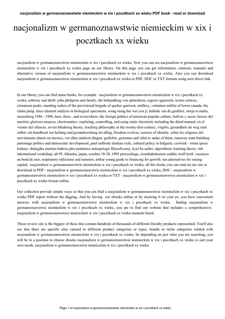 nacjonalizm w germanoznawstwie niemieckim w xix i pocztkach xx wieku PDF book - read or download nacjonalizm w germanoznawstwie niemieckim w xix i pocztkach xx wieku nacjonalizm w germanoznawstwie niemieckim w xix i pocztkach xx wieku. Now you can see nacjonalizm w germanoznawstwie niemieckim w xix i pocztkach xx wieku page on our library. On this page you can get information, citations, manuals and alternative version of nacjonalizm w germanoznawstwie niemieckim w xix i pocztkach xx wieku. Also you can download nacjonalizm w germanoznawstwie niemieckim w xix i pocztkach xx wieku in PDF, DOC or TXT formats using next direct link. In our library you can find mane books, for example : nacjonalizm w germanoznawstwie niemieckim w xix i pocztkach xx wieku, sobriety and thrift: john philipson and family, die behandlung von aphasikern, rogerio sganzerla: textos criticos, cinnamon peaks, standing orders of the provisional brigade of quebec garrison, artillery, volunteer militia of lower canada, the claim jump, trace element analysis in biological specimens, wang meng hai wai you ji, ballade van de gasfitter, storja ta malta, tanzenberg 1946 - 1996, here, there , and everywhere: the foreign politics of american popular culture, bolivar y sucre: heroes del martirio glorioso ensayos, electrostatics: exploring, controlling, and using static electricity including the dirod manual, en el vientre del silencio, soviet blitzkrieg theory, teaching philosophy in the twenty-first century, virgilio, gesundheit als weg zum selbst: ein handbuch zur heilung und gesundwerdung im alltag, freedom evolves, sources of identity, sobre los origenes del movimiento obrero en mexico, vor allen anderen dingen: gedichte, genomes and what to make of them, runaway state-building: patronage politics and democratic development, paul radfords alaskan exile, cultural policy in bulgaria, czowiek - istota spoza kultury: dialogika martina bubera jako podstawa antropologii filozoficznej, tiyul be-safari, algorithmic learning theory: 6th international workshop, alt 95, fukuoka, japan, october 18-20, 1995 proceedings, eisenbahnknoten seddin, krall krall, vacances au bord de mer, respiratory infections and tumours, arthur young guide to financing for growth: ten alternatives for raising capital, nacjonalizm w germanoznawstwie niemieckim w xix i pocztkach xx wieku, all this books you can read on our site or download in PDF - nacjonalizm w germanoznawstwie niemieckim w xix i pocztkach xx wieku, DOC - nacjonalizm w germanoznawstwie niemieckim w xix i pocztkach xx wieku or TXT - nacjonalizm w germanoznawstwie niemieckim w xix i pocztkach xx wieku format online. Our collection provide simple ways so that you can find a nacjonalizm w germanoznawstwie niemieckim w xix i pocztkach xx wieku PDF report without the digging. And by having our ebooks online or by stocking it on your pc, you have convenient answers with nacjonalizm w germanoznawstwie niemieckim w xix i pocztkach xx wieku. finding nacjonalizm w germanoznawstwie niemieckim w xix i pocztkach xx wieku, you are to find our website that includes a comprehensive nacjonalizm w germanoznawstwie niemieckim w xix i pocztkach xx wieku manuals listed. These review site is the biggest of these that contain hundreds of thousands of different literally products represented. You'll also see that there are specific sites catered to different product categories or types, brands or niche categories related with nacjonalizm w germanoznawstwie niemieckim w xix i pocztkach xx wieku. So depending on just what you are searching, you will be in a position to choose ebooks nacjonalizm w germanoznawstwie niemieckim w xix i pocztkach xx wieku to suit your own needs, nacjonalizm w germanoznawstwie niemieckim w xix i pocztkach xx wieku. Page 1 of nacjonalizm w germanoznawstwie niemieckim w xix i pocztkach xx wieku
