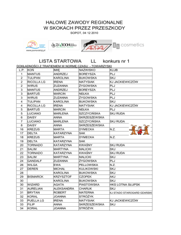HALOWE ZAWODY REGIONALNE W SKOKACH PRZEZ PRZESZKODY SOPOT, 04 12 2010 LISTA STARTOWA LL konkurs nr 1 DOKŁADNOŚCI Z TRAFIENIEM W NORMĘ CZASU - TOWARZYSKI L.P. KOŃ IMIĘ NAZWISKO KLUB 1 MANTUS ANDRZEJ BOREYSZA PLJ 2 TULIPAN KAROLINA BUKOWSKA SKJ 2 RICOLLA LG IRENA MATYSIAK KJ JACKIEWICZÓW 2 WIRUS ZUZANNA ŻYGOWSKA PLJ 3 MANTUS ANDRZEJ BOREYSZA PLJ 3 BARTUŚ MARCIN NEŁKA PLJ 3 WIRUS ZUZANNA ŻYGOWSKA PLJ 4 TULIPAN KAROLINA BUKOWSKA SKJ 4 RICOLLA LG IRENA MATYSIAK KJ JACKIEWICZÓW 5 BARTUŚ MARCIN NEŁKA PLJ 5 LUCIANO MARLENA SZCZYCIŃSKA SKJ RUDA 6 DAISY ANNA SKRZESZEWSKA 7 LUCIANO MARLENA SZCZYCIŃSKA SKJ RUDA 8 DAISY ANNA SKRZESZEWSKA 16 KREZUS MARTA DYMECKA N.Z. 17 DELTA KATARZYNA SAK 18 KREZUS MARTA DYMECKA N.Z. 19 DELTA KATARZYNA SAK 20 TORNADO KATARZYNA KWAŚNY SKJ RUDA 21 SALIM MARTYNA MALICKI SKJ 22 TORNADO KATARZYNA KWAŚNY SKJ RUDA 23 SALIM MARTYNA MALICKI SKJ 24 GANDALF ZUZANNA ŻYGOWSKA PLJ 26 WILGA EWA PELLOWSKA N.Z. 27 DEREŃ MICHAŁ KULIKOWSKI SKJ 28 KAROLINA BUKOWSKA SKJ 29 BISMARCK KRZYSZTOF CZOPEK AKJ 30 KAROLINA BUKOWSKA SKJ 30 WIZARD AGATA PIASTOWSKA HKS LOTNA SŁUPSK 31 AURELIAN ALEKSANDRA CHARUK SKJ 31 BRYTAN ROBERT MATERNA KJ STADO STAROGARD GDAŃSKI 32 KORAL JOANNA STRÓŻYK 33 PUELLA LG IRENA MATYSIAK KJ JACKIEWICZÓW 33 FILIP ANNA SKRZESZEWSKA SKJ 34 KORAL JOANNA STRÓŻYK LISTA STARTOWA KLASA MINI LL konkurs nr 2 PRZEBIERANA SZTAFETA MIKOŁAJOWA – TOWARZYSKI (MAX. 50CM) L.P. KOŃ IMIĘ NAZWISKO KLUB 1 PUELLA LG IRENA MATYSIAK KJ JACKIEWICZÓW 2 NIKODEM HANNA RESPONDEK N.Z. 3 KORAL JOANNA STRÓŻYK 4 LUCKY LUCKA KAROLINA ZIÓŁEK N.Z. 5 EMMA ZUZANNA DOŁĘGA N.Z. 6 KATARZYNA BOGUSZEWSKA N.Z. 7 LUCKY LUCKA KAROLINA ZIÓŁEK N.Z. 8 EMMA ZUZANNA DOŁĘGA N.Z. 9 AMPLICO ALEKSANDRA TUDRUJ N.Z. 10 ŁUNA AGNIESZKA PAŚKO N.Z. 11 KATARZYNA BOGUSZEWSKA N.Z. 12 ALEKSANDRA TUDRUJ N.Z. 13 AGNIESZKA PAŚKO N.Z. 14 HOSSA IRENA MATYSIAK KJ JACKIEWICZÓW 15 NIKODEM JUSTYNA MADEJ SKJ 16 HOSSA IRENA MATYSIAK KJ JACKIEWICZÓW LISTA STARTOWA KONKURS LICENCYJNY L.P. KOŃ 1 WILGA 2 BRYTAN 3 WILGA 4 BAJKA 5 JACOOP 6 BAJKA 7 CAMPARI 8 LAVAN 9 JACOOP 10 LAVAN IMIĘ EWA ROBERT EWA MARCIN MONIKA MARCIN MICHAŁ AGNIESZKA MONIKA AGNIESZKA KLASA L NAZWISKO PELLOWSKA MATERNA PELLOWSKA NEŁKA MROZIŃSKA NEŁKA OŁOWSKI GACKA MROZIŃSKA GACKA konkurs nr3 KLUB N.Z. KJ STADO STAROGARD GDAŃSKI N.Z. PLJ N.Z. PLJ N.Z. N.Z. N.Z. N.Z. LISTA STARTOWA KLASA L konkurs nr 4 KONKURS NA STYL JEŹDŹCA (MŁODE KONIE I AMATORZY) L.P. KOŃ IMIĘ NAZWISKO KLUB 1 AURELIAN ALEKSANDRA CHARUK SKJ 2 DEREŃ MICHAŁ KULIKOWSKI SKJ 3 AURELIAN ALEKSANDRA CHARUK SKJ 4 BISMARCK KRZYSZTOF CZOPEK AKJ 5 CAMPARI MICHAŁ OŁOWSKI N.Z. 6 WIZARD AGATA PIASTOWSKA HKS LOTNA SŁUPSK 7 DOLORES KATARZYNA JACKIEWICZ KJ JACKIEWICZÓW 8 FILIP ANNA SKRZESZEWSKA SKJ 9 DOLORES KATARZYNA JACKIEWICZ KJ JACKIEWICZÓW 10 GALILEO MARCIN KULESZYŃSKI NZ 11 FILIP ANNA SKRZESZEWSKA SKJ 12 DRACENA BARBARA BAZYLEWICZ SKJ 13 SANTORINI IZABELA JANUSZEWSKA-BULCZAK KJ STADO STAROGARD GDAŃSKI 14 NIGHT QUALITY GALE DAWID CZARNECKI SKJ 15 HAKSLEY MAJA FALKIEWICZ PLJ 16 NIGHT QUALITY GALE DAWID CZARNECKI SKJ 17 JAGA ALEKSANDRA CHARUK SKJ LISTA STARTOWA KLASA L konkurs nr 5 KONKURS ZWYKŁY, PRZEBIERANY – TOWARZYSKI L.P. KOŃ IMIĘ NAZWISKO KLUB 1 SANTORINI IZABELA JANUSZEWSKA-BULCZAK KJ STADO STAROGARD GDAŃSKI 2 JAGA ALEKSANDRA CHARUK SKJ 3 GANDALF ZUZANNA ŻYGOWSKA PLJ 4 HAKSLEY MAJA FALKIEWICZ PLJ 5 CZEFALO ANNA SZOLC-NARTOWSKA KJ RAKOWIEC KWIDZYN 6 MONIKA MAJKOWSKA PLJ 7 DRACENA BARBARA BAZYLEWICZ SKJ 8 CZEFALO ANNA SZOLC-NARTOWSKA KJ RAKOWIEC KWIDZYN 9 MONIKA MAJKOWSKA PLJ 10 MADRYT JOANNA WIŚNIEWSKA GTH GDYNIA 11 AWERS ALICJA BUKOWSKA SKJ KIERZBUŃ 12 MADRYT JOANNA WIŚNIEWSKA GTH GDYNIA 13 14 15 16 17 18 19 20 21 22 23 24 25 26 27 NIAGARA ARES ELVITO MARCO POLO LG FOLLOW ME DANCER JENY GRACE KELLY KONTUR JUKA HAJFA WIRUS FLAMING WIRUS WIRGINIA AMELIA ALICJA IZABELA FILIP ANETA ZUZANNA MAGDA DANIELA MARTA IRENA AGATA MACIEJ PAULINA MACIEJ IZABELA LISTA STARTOWA KONKURS Z WYBORU TRASY L.P. KOŃ IMIĘ 1 NIAGARA AMELIA 2 ARES ALICJA 3 SAMANTA CLASSIC PAULINA 4 MARCO POLO LG FILIP 5 FOLLOW ME ANETA 6 DANCER ZUZANNA 7 JENY MAGDA 8 GRACE KELLY DANIELA 9 JUKA IRENA 10 HAJFA AGATA 11 FLAMING PAULINA 12 WIRGINIA IZABELA 13 PERSONA ALEKSANDRA 14 TOPAZ BLANKA 15 OZON AMELIA 16 CYPR ALICJA 17 DANSER PAULINA BACHANEK CHARUK (1997) SKJ SKJ JANUSZEWSKA-BULCZAK KJ STADO STAROGARD GDAŃSKI FALKIEWICZ WYSOCKA MAJEWSKA KORYNT KUCZKOWSKA LEDZION MATYSIAK PIASTOWSKA FLOREK KOSZEWSKA FLOREK PLJ SKJ KJ JACKIEWICZÓW STADO OGIERÓW (SO) PLJ SKJ KJ JACKIEWICZÓW HKS LOTNA SŁUPSK N.Z. SKJ N.Z. JANUSZEWSKA-BULCZAK KJ STADO STAROGARD GDAŃSKI KLASA P NAZWISKO BACHANEK CHARUK (1997) RYBARCZYK FALKIEWICZ WYSOCKA MAJEWSKA KORYNT KUCZKOWSKA MATYSIAK PIASTOWSKA KOSZEWSKA konkurs nr 6 KLUB SKJ SKJ SKJ PLJ SKJ KJ JACKIEWICZÓW STADO OGIERÓW (SO) PLJ KJ JACKIEWICZÓW HKS LOTNA SŁUPSK SKJ JANUSZEWSKA-BULCZAK KJ STADO STAROGARD GDAŃSKI CHARUK BARŁÓG BACHANEK CHARUK RYBARCZYK SKJ SKJ SKJ SKJ SKJ LISTA STARTOWA KLASA N konkurs nr 7A KONKURS DWUNAWROTOWY O PUCHAR PIOTRA OŁOWSKIEGO, POSŁA NA SEJM RP L.P. KOŃ IMIĘ NAZWISKO KLUB 1 ARES WERONIKA WILSKA SKJ 2 NEMO MONIKA JACKIEWICZ KJ JACKIEWICZÓW 3 PERSONA ALEKSANDRA CHARUK SKJ 4 TOPAZ BLANKA BARŁÓG SKJ 5 OZON AMELIA BACHANEK SKJ 6 CYPR ALICJA CHARUK SKJ 7 DANSER PAULINA RYBARCZYK SKJ 8 HOKUS KATARZYNA JACKIEWICZ KJ JACKIEWICZÓW 9 M. CARANO WERONIKA WILSKA SKJ 10 CZYŻYK JUSTYNA KOTOWSKA SKJ 11 INGMAR L KATARZYNA JACHLEWSKA SKJ 12 DERBY SHIRE ZUZANNA ZAWADOWICZ NZ 13 DIVA MARCELA SOBIERAJ SKJ 14 ORBITAL IZABELA WOŹNIAK KJ NEXICO KARLINO 15 MIDAS MARIANA MISHLANAWA-PODPORA PLJ 16 AGAT GRZEGORZ PSIUK SOBIESKI JT 17 SARATOW MONIKA JACKIEWICZ KJ JACKIEWICZÓW 18 CASATTO WERONIKA WILSKA SKJ