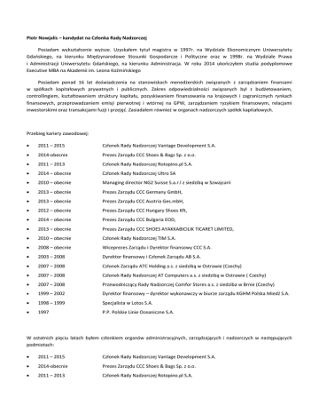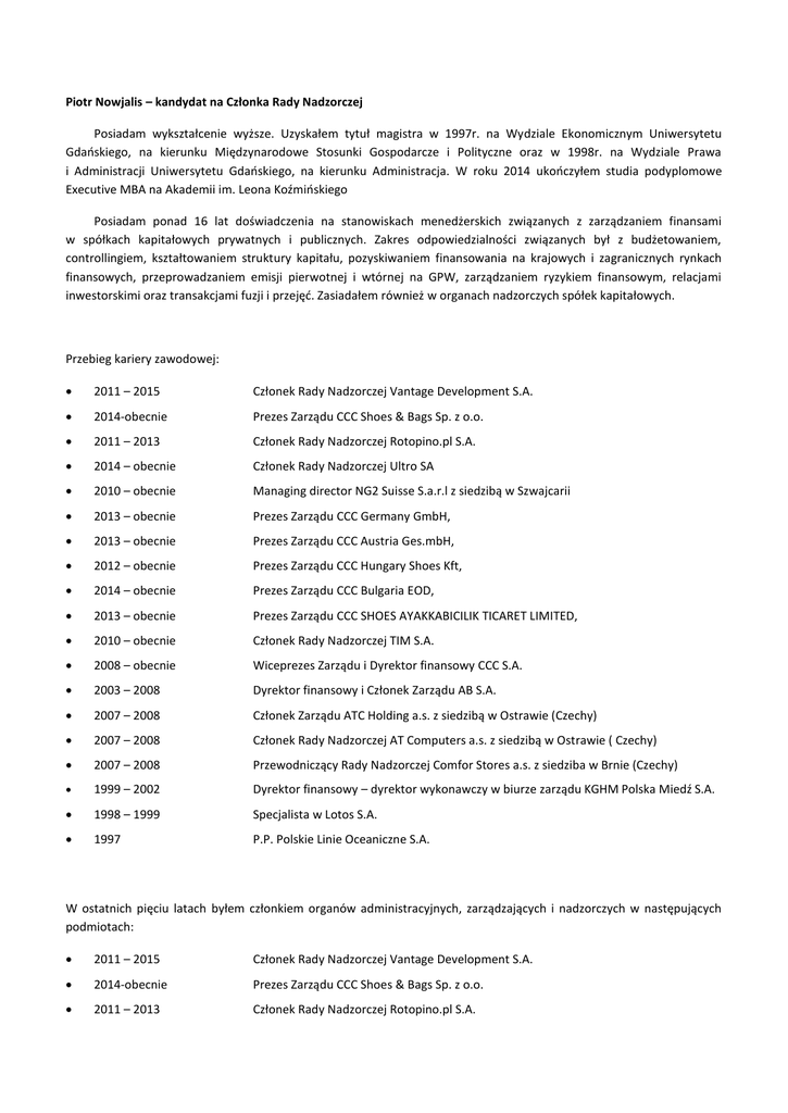 Piotr Nowjalis – kandydat na Członka Rady Nadzorczej Posiadam wykształcenie wyższe. Uzyskałem tytuł magistra w 1997r. na Wydziale Ekonomicznym Uniwersytetu Gdaoskiego, na kierunku Międzynarodowe Stosunki Gospodarcze i Polityczne oraz w 1998r. na Wydziale Prawa i Administracji Uniwersytetu Gdaoskiego, na kierunku Administracja. W roku 2014 ukooczyłem studia podyplomowe Executive MBA na Akademii im. Leona Koźmioskiego Posiadam ponad 16 lat doświadczenia na stanowiskach menedżerskich związanych z zarządzaniem finansami w spółkach kapitałowych prywatnych i publicznych. Zakres odpowiedzialności związanych był z budżetowaniem, controllingiem, kształtowaniem struktury kapitału, pozyskiwaniem finansowania na krajowych i zagranicznych rynkach finansowych, przeprowadzaniem emisji pierwotnej i wtórnej na GPW, zarządzaniem ryzykiem finansowym, relacjami inwestorskimi oraz transakcjami fuzji i przejęd. Zasiadałem również w organach nadzorczych spółek kapitałowych. Przebieg kariery zawodowej: 2011 – 2015 Członek Rady Nadzorczej Vantage Development S.A. 2014-obecnie Prezes Zarządu CCC Shoes & Bags Sp. z o.o. 2011 – 2013 Członek Rady Nadzorczej Rotopino.pl S.A. 2014 – obecnie Członek Rady Nadzorczej Ultro SA 2010 – obecnie Managing director NG2 Suisse S.a.r.l z siedzibą w Szwajcarii 2013 – obecnie Prezes Zarządu CCC Germany GmbH, 2013 – obecnie Prezes Zarządu CCC Austria Ges.mbH, 2012 – obecnie Prezes Zarządu CCC Hungary Shoes Kft, 2014 – obecnie Prezes Zarządu CCC Bulgaria EOD, 2013 – obecnie Prezes Zarządu CCC SHOES AYAKKABICILIK TICARET LIMITED, 2010 – obecnie Członek Rady Nadzorczej TIM S.A. 2008 – obecnie Wiceprezes Zarządu i Dyrektor finansowy CCC S.A. 2003 – 2008 Dyrektor finansowy i Członek Zarządu AB S.A. 2007 – 2008 Członek Zarządu ATC Holding a.s. z siedzibą w Ostrawie (Czechy) 2007 – 2008 Członek Rady Nadzorczej AT Computers a.s. z siedzibą w Ostrawie ( Czechy) 2007 – 2008 Przewodniczący Rady Nadzorczej Comfor Stores a.s. z siedziba w Brnie (Czechy) 1999 – 2002 Dyrektor finansowy – dyrektor wykonawczy w biurze zarządu KGHM Polska Miedź S.A. 1998 – 1999 Specjalista w Lotos S.A. 1997 P.P. Polskie Linie Oceaniczne S.A. W ostatnich pięciu latach byłem członkiem organów administracyjnych, zarządzających i nadzorczych w następujących podmiotach: 2011 – 2015 Członek Rady Nadzorczej Vantage Development S.A. 2014-obecnie Prezes Zarządu CCC Shoes & Bags Sp. z o.o. 2011 – 2013 Członek Rady Nadzorczej Rotopino.pl S.A. 2014 – obecnie Członek Rady Nadzorczej Ultro SA 2010 – obecnie Managing director NG2 Suisse S.a.r.l z siedzibą w Szwajcarii 2013 – obecnie Prezes Zarządu CCC Germany GmbH, 2013 – obecnie Prezes Zarządu CCC Austria Ges.mbH, 2012 – obecnie Prezes Zarządu CCC Hungary Shoes Kft, 2014 – obecnie Prezes Zarządu CCC Bulgaria EOD, 2013 – obecnie Prezes Zarządu CCC SHOES AYAKKABICILIK TICARET LIMITED, 2010 – obecnie Członek Rady Nadzorczej TIM S.A.