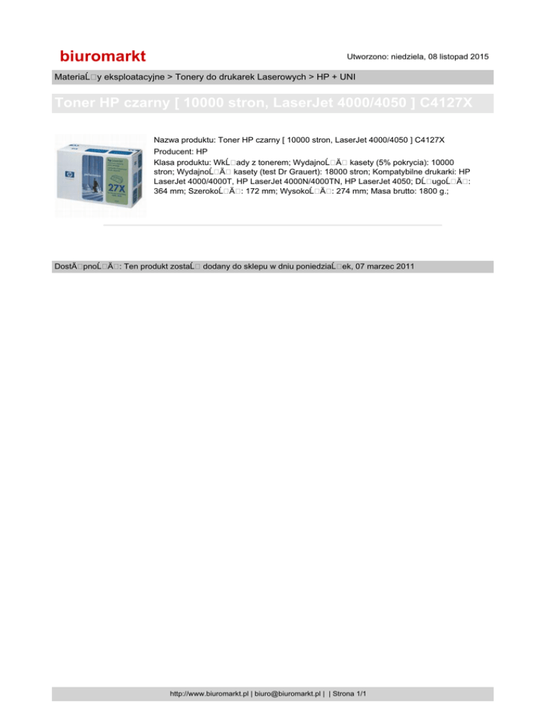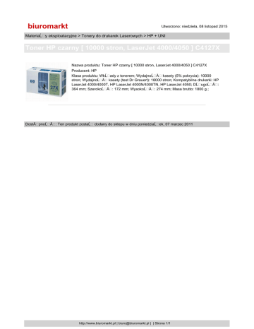 biuromarkt Utworzono: niedziela, 08 listopad 2015 MateriaĹ y eksploatacyjne > Tonery do drukarek Laserowych > HP + UNI Toner HP czarny [ 10000 stron, LaserJet 4000/4050 ] C4127X Nazwa produktu: Toner HP czarny [ 10000 stron, LaserJet 4000/4050 ] C4127X Producent: HP Klasa produktu: WkĹ ady z tonerem; WydajnoĹ Ä kasety (5% pokrycia): 10000 stron; WydajnoĹ Ä kasety (test Dr Grauert): 18000 stron; Kompatybilne drukarki: HP LaserJet 4000/4000T, HP LaserJet 4000N/4000TN, HP LaserJet 4050; DĹ ugoĹ Ä : 364 mm; SzerokoĹ Ä : 172 mm; WysokoĹ Ä : 274 mm; Masa brutto: 1800 g.; DostÄ pnoĹ Ä : Ten produkt zostaĹ dodany do sklepu w dniu poniedziaĹ ek, 07 marzec 2011 http://www.biuromarkt.pl | [email protected] | | Strona 1/1