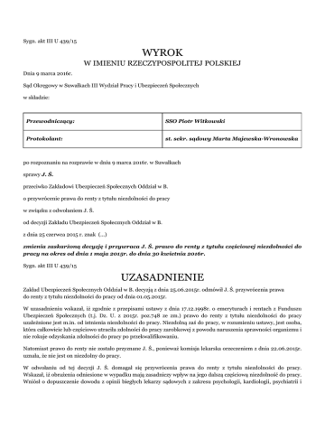 Sygn. akt III U 439/15 WYROK W IMIENIU RZECZYPOSPOLITEJ POLSKIEJ Dnia 9 marca 2016r. Sąd Okręgowy w Suwałkach III Wydział Pracy i Ubezpieczeń Społecznych w składzie: Przewodniczący: SSO Piotr Witkowski Protokolant: st. sekr. sądowy Marta Majewska-Wronowska po rozpoznaniu na rozprawie w dniu 9 marca 2016r. w Suwałkach sprawy J. Ś. przeciwko Zakładowi Ubezpieczeń Społecznych Oddział w B. o przywrócenie prawa do renty z tytułu niezdolności do pracy w związku z odwołaniem J. Ś. od decyzji Zakładu Ubezpieczeń Społecznych Oddział w B. z dnia 25 czerwca 2015 r. znak (...) zmienia zaskarżoną decyzję i przywraca J. Ś. prawo do renty z tytułu częściowej niezdolności do pracy na okres od dnia 1 maja 2015r. do dnia 30 kwietnia 2016r. Sygn. akt III U 439/15 UZASADNIENIE Zakład Ubezpieczeń Społecznych Oddział w B. decyzją z dnia 25.06.2015r. odmówił J. Ś. przywrócenia prawa do renty z tytułu niezdolności do pracy od dnia 01.05.2015r. W uzasadnieniu wskazał, iż zgodnie z przepisami ustawy z dnia 17.12.1998r. o emeryturach i rentach z Funduszu Ubezpieczeń Społecznych (t.j. Dz. U. z 2015r. poz.748 ze zm.) prawo do renty z tytułu niezdolności do pracy uzależnione jest m.in. od istnienia niezdolności do pracy. Niezdolną zaś do pracy, w rozumieniu ustawy, jest osoba, która całkowicie lub częściowo utraciła zdolności do pracy zarobkowej z powodu naruszenia sprawności organizmu i nie rokuje odzyskania zdolności do pracy po przekwalifikowaniu. Natomiast prawo do renty nie zostało przyznane J. Ś., ponieważ komisja lekarska orzeczeniem z dnia 22.06.2015r. uznała, że nie jest on niezdolny do pracy. W odwołaniu od tej decyzji J. Ś. domagał się przywrócenia prawa do renty z tytułu niezdolności do pracy. Wskazał, iż obrażenia odniesione w wypadku mają zasadniczy wpływ na jego dalszą częściową niezdolność do pracy. Wniósł o dopuszczenie dowodu z opinii biegłych lekarzy sądowych z zakresu psychologii, kardiologii, psychiatrii i otolaryngologii z (...) Centrum (...) w K., gdyż obrażenia, których doznał, są niezwykle rzadkie i uczciwą ocenę ich wpływu na zdolność do pracy może opisać biegły z Centrum, gdzie przeprowadzono badania, trwało jego leczenie i lekarze mają doświadczenie w leczeniu niezwykle rzadkich przypadków. W odpowiedzi na odwołanie organ rentowy wniósł o jego oddalenie. Wskazał, że zgodnie z art. 61 ustawy o emeryturach i rentach z Funduszu Ubezpieczeń Społecznych prawo do renty, które ustało z powodu ustąpienia niezdolności do pracy, podlega przywróceniu, jeżeli w ciągu 18 miesięcy od ustania prawa do renty ubezpieczony ponownie stał się niezdolny do pracy. Komisja lekarska Zakładu Ubezpieczeń Społecznych nie uznała natomiast J. Ś. za w dalszym ciągu niezdolnego do pracy. Sąd Okręgowy w Suwałkach ustalił i zważył, co następuje: Odwołanie należało uznać za uzasadnione. Odwołujący się jest bowiem nadal częściowo niezdolny do pracy. Tak mianowicie wynika z opinii biegłych sądowych lekarzy E. L. – z zakresu otolaryngologii, K. J. – z zakresu neurologii, J. H. – z zakresu kardiologii i J. M. – z zakresu psychiatrii, którzy na podstawie art. 278 kpc sporządzili opinię na potrzeby postępowania sądowego. Po przebadaniu odwołującego się i przeanalizowaniu dokumentacji medycznej zgromadzonej w sprawie rozpoznali u niego organiczne zaburzenia nastroju, stan po urazie głowy, kręgosłupa i kończyny dolnej lewej w wypadku komunikacyjnym w 2007r., szumy uszne po przebytym urazie czaszkowo-mózgowym w 2007r., dyskopatię L4/L5 i L5/S1, naczyniaka trzonu kręgu L1 oraz zwyrodnienie kręgosłupa szyjnego. W związku natomiast z ich stopniem nasilenia zaopiniowali, iż powodują u odwołującego się dalszą jego częściową niezdolność do pracy zarobkowej na okres od 01.05.2015r. do 30.04.2016r. Biegli wskazali, iż stwierdzone objawy występują u odwołującego się od momentu wypadku komunikacyjnego, któremu uległ w 2007r. Odwołujący się leczy się psychiatrycznie, przyjmuje leki nasenne i przeciwdepresyjne, jednak bez poprawy. Śpi około 3,5 godziny na dobę, ma również osłabioną pamięć świeżą. Pozostaje pod opieką poradni specjalistycznych. Był również leczony w (...)w W., ale bez poprawy. Biegli wskazali również, iż bóle kręgosłupa występowały u odwołującego się od 2005r., natomiast ich nasilenie nastąpiło od czasu wypadku w 2007r. W dniu 19.01.2007r. poddany był ablacji drogi dodatkowej. Obecnie biegli nie stwierdzili napadów arytmii. Wskazywali również, iż odwołujący się w kontakcie jest napięty, drażliwy, z obniżonym, nastrojem. Podkreśli, że występuje u niego negatywny wpływ szumów usznych i dźwięków w głowie oraz bezsenności na funkcjonowanie. Te objawy, zdaniem opiniujących, w istotny sposób naruszają sprawność odwołującego się i aktualnie powodują częściową niezdolność do pracy na dalszy okres jednego roku. Sąd tymczasem podzielił opinię biegłych sądowych, gdyż została sporządzona przez lekarzy o specjalności w leczeniu chorób, na które cierpi odwołujący się i jest jednoznaczna w swojej wymowie. Jak zaś wypowiedział się Sąd Najwyższy choćby w wyroku z dnia 14.03.2007r. III UK 130/06 (LEX 368973), w sprawie o świadczenie rentowe to ustalenia biegłych lekarzy sądowych dostarczają sądowi wiedzy specjalistycznej, koniecznej do dokonania oceny stanu zdrowia osoby ubiegającej się o świadczenia rentowe, w tym rodzaju występujących schorzeń, stopnia ich zaawansowania i nasilenia związanych z nimi dolegliwości. Podobnie wypowiedział się również Sąd Najwyższy w wyroku z dnia 12.01.2010r. I UK 204/09 (Lex 577813) i z 24.02.2010r. II UK 191/09 (Lex 590238). Sąd bowiem musi zawsze kierować się ustaleniami biegłych lekarzy sądowych, którzy posiadają w tym względzie specjalistyczną wiedzę. Biegli tymczasem, wydając opinię w sprawie, uwzględn
