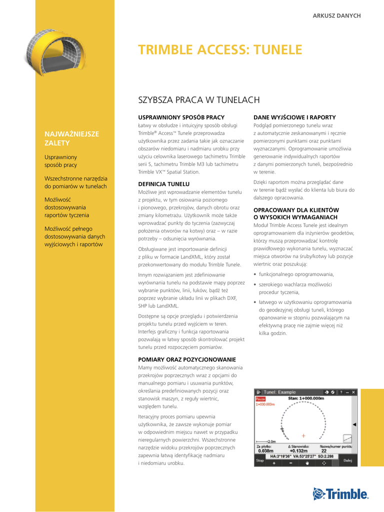 ARKUSZ DANYCH TRIMBLE aCCESS: tunele SZYBSZA PRACA W TUNELACH Najważniejsze zalety Usprawniony sposób pracy Wszechstronne narzędzia do pomiarów w tunelach Możliwość dostosowywania raportów tyczenia Możliwość pełnego dostosowywania danych wyjściowych i raportów Usprawniony SPOSÓB pracy Dane wyjściowe i raporty Łatwy w obsłudze i intuicyjny sposób obsługi Trimble® Access™ Tunele przeprowadza użytkownika przez zadania takie jak oznaczanie obszarów niedomiaru i nadmiaru urobku przy użyciu celownika laserowego tachimetru Trimble serii S, tachimetru Trimble M3 lub tachimetru Trimble VX™ Spatial Station. Podgląd pomierzonego tunelu wraz z automatycznie zeskanowanymi i ręcznie pomierzonymi punktami oraz punktami wyznaczanymi. Oprogramowanie umożliwia generowanie indywidualnych raportów z danymi pomierzonych tuneli, bezpośrednio w terenie. Definicja tunelu Dzięki raportom można przeglądać dane w terenie bądź wysłać do klienta lub biura do dalszego opracowania. Możliwe jest wprowadzanie elementów tunelu z projektu, w tym osiowania poziomego i pionowego, przekrojów, danych obrotu oraz zmiany kilometrażu. Użytkownik może także wprowadzać punkty do tyczenia (zazwyczaj położenia otworów na kotwy) oraz – w razie potrzeby – odsunięcia wyrównania. Obsługiwane jest importowanie definicji z pliku w formacie LandXML, który został przekonwertowany do modułu Trimble Tunele. Innym rozwiązaniem jest zdefiniowanie wyrównania tunelu na podstawie mapy poprzez wybranie punktów, linii, łuków, bądź też poprzez wybranie układu linii w plikach DXF, SHP lub LandXML. Dostępne są opcje przeglądu i potwierdzenia projektu tunelu przed wyjściem w teren. Interfejs graficzny i funkcja raportowania pozwalają w łatwy sposób skontrolować projekt tunelu przed rozpoczęciem pomiarów. Pomiary oraz pozycjonowanie Mamy możliwość automatycznego skanowania przekrojów poprzecznych wraz z opcjami do manualnego pomiaru i usuwania punktów, określania predefiniowanych pozycji oraz stanowisk maszyn, z reguły wiertnic, względem tunelu. Iteracyjny proces pomiaru upewnia użytkownika, że zawsze wykonuje pomiar w odpowiednim miejscu nawet w przypadku nieregularnych powierzchni. Wszechstronne narzędzie widoku przekrojów poprzecznych zapewnia łatwą identyfikację nadmiaru i niedomiaru urobku. Opracowany dla klientów o wysokich wymaganiach Moduł Trimble Access Tunele jest idealnym oprogramowaniem dla inżynierów geodetów, którzy muszą przeprowadzać kontrolę prawidłowego wykonania tunelu, wyznaczać miejsca otworów na śruby/kotwy lub pozycje wiertnic oraz poszukują: • funkcjonalnego oprogramowania, • szerokiego wachlarza możliwości procedur tyczenia, • łatwego w użytkowaniu oprogramowania do geodezyjnej obsługi tuneli, którego opanowanie w stopniu pozwalającym na efektywną pracę nie zajmie więcej niż kilka godzin. Definiowanie elementów tunelu Pomiar tunelu Element Szczegóły Element Szczegóły Geometria w planie • Długość/współrzędne: –– Elementy liniowe –– Łuki –– Krzywe przejściowe wejściowe i wyjściowe • Kilometraż końcowy • Wierzchołki: –– Typy krzywych: –– Łuk kołowy –– Przejście | Łuk | Przejście –– Przejście | Przejście • Wybór poprzez wskazanie na mapie w pliku DXF lub SHP • Typy krzywych przejściowych: –– Spirala klotoidy –– Jajowata spirala klotoidy –– Spirala 3D –– Spirala Bloss –– Krzywa trzeciego stopnia NSW • Przyrost indeksu kilometrażu • Wybór mapy Pozycje automatycznego skanowania • Automatyczne skanowanie mierzy punkty ze zdefiniowanym interwałem dla wybranego kilometrażu Strefy skanowania • Strefy skanowania mogą być zastosowane w przypadku gdy część przekroju tunelu nie jest dostępna do pomiaru bądź nie może być pomierzona, na przykład obszary znajdujące się za przewodami wentylacyjnymi Wskazówki dla przekroju poprzecznego • Wyświetlanie linii poziomej (linia pomocnicza) oraz linii pionowej Dopasowanie na kilometrażu • Kontrola gdzie pozycja będzie pomierzona, kiedy powierzchnia tunelu nie odpowiada projektowi Skanowanie tachimetrem Trimble VX • Możliwość zastosowania tachimetru skanującego Trimble VX dla polepszenia jakości skanowania Wskaźnik laserowy dużej mocy • Obsługiwany W trakcie skanowania • Podgląd wartości nadmiaru i niedomiaru urobku dla poprzednio skanowanych pozycji Geometria w profilu podłużnym • Elementy przekroju pionowego: –– Elementy punktowe –– Łuki kołowe –– Symetryczne parabole –– Asymetryczne parabole • Punkty początkowe i końcowe: –– Elementy punktowe –– Łuki kołowe –– Symetryczne parabole Po zakończeniu skanowania • Przegląd wyników dla każdego ze stanowisk • Przegląd wartości nadmiaru i niedomiaru urobku • Możliwość zmiany wartości tolerancji i ponownej oceny wyników Pomiar manualny Przekroje • Wiele powierzchni: –– Elementy liniowe, wprowadzone lub zmierzone w tunelu –– Łuki –– Odsunięcie od innej powierzchni • Użytkownik posiada możliwość manualnego pomiaru punktów, które nie zostały pomierzone podczas skanowania • Możliwość usunięcia punktów pomierzonych ręcznie oraz punktów skanowanych Pozycje w tunelu Pozycje przekrojów • Możliwość tworzenia przekrojów złożonych –– Szablony zastosowane względem ukształtowania pionowego: –– Prostopadle –– Pionowo Obrót • Przy użyciu tej funkcji można dokonać pochylenia lub obrotu przekrojów –– Punkt osiowy może zostać odsunięty od wyrównania: –– Poziomo –– Pionowo Punkty pod otwory na śruby/kotwy • Definiowane przez kilometraż oraz offset, za pomocą jednej z poniższych metod: –– Promieniowa: –– Włącznie z offsetem od punktu centralnego –– Pionowa –– Pozioma • Pomiar pozycji w dowolnym kilometrażu w granicach tunelu –– Porównywanie pozycji z parametrami