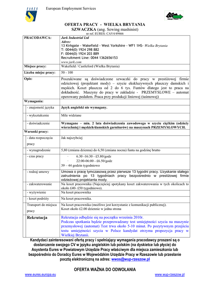 European Employment Services OFERTA PRACY - WIELKA BRYTANIA SZWACZKA (ang. Sewing mashinist) nr ref. EURES: CAV4/49466 PRACODAWCA: Miejsce pracy: Jark Industrial Ltd Adres: 13 Kirkgate - Wakefield - West Yorkshire - WF1 1HS- Wielka Brytania T: 0044(0) 1924 298 882 F: 0044(0) 1924 203 889 Recruitment Line: 0044 1362656153 www.jark.com Wakefield / Castleford (Wielka Brytania) Liczba miejsc pracy: 50 - 100 Opis: Poszukiwane są doświadczone szwaczki do pracy w prestiżowej firmie odzieżowej (projektant mody) – szycie ekskluzywnych płaszczy damskich i męskich. Koszt płaszcza od 2 do 6 tys. Funtów dlatego jest to praca na dokładność. Maszyny do pracy w zakładzie - PRZEMYSLOWE – automat operowany pedałem. Praca przy produkcji liniowej (taśmowej) Wymagania: - znajomość języka Język angielski nie wymagany. - wykształcenie Mile widziane - doświadczenie Wymagane – min. 2 lata doświadczenia zawodowego w szyciu ciężkim (odzieży wierzchniej i męskich/damskich garniturów) na maszynach PRZEMYSLOWYCH. Warunki pracy: - data rozpoczęcia Jak najszybciej pracy - wynagrodzenie 5,80 (zmiana dzienna) do 6,50 (zmiana nocna) funta na godzinę brutto - czas pracy · 6.30 -16:30 - £5.80/godz · 22:00-06:00 - £6.50/godz 39 – 44 godzin tygodniowo - rodzaj umowy - wyżywienie Umowa o pracę tymczasową przez pierwsze 13 tygodni pracy. Uzyskanie stałego zatrudnienia po 13 tygodniach pracy bezpośrednio w prestiżowej firmie odzieżowej projektanta mody. Na koszt pracownika (Najczęściej spotykany koszt zakwaterowania w tych okolicach to około £40- £50 tygodniowo). Na koszt pracownika - koszt podróży Na koszt pracownika. Transport do miejsca Na koszt pracownika (możliwe jest korzystanie z komunikacji publicznej). Koszt około £2.00 dziennie w jedna strona - zakwaterowanie pracy Rekrutacja Rekrutacja odbędzie się na początku września 2010r. Podczas spotkania będzie przeprowadzany test umiejętności szycia na maszynie przemysłowej (automat) Test trwa około 5-10 minut. Po pozytywnym przejściu testu umiejętności szycia w Polsce kandydat otrzyma propozycja pracy w Wielkiej Brytanii. Kandydaci zainteresowani ofertą pracy i spełniający wymagania pracodawcy proszeni są o dostarczenie swojego CV w języku angielskim lub polskim (na dyskietce lub płycie) do Asystenta Eures w Powiatowym Urzędzie Pracy właściwym dla miejsca zamieszkania lub bezpośrednio do Doradcy Eures w Wojewódzkim Urzędzie Pracy w Rzeszowie lub przesłanie pocztą elektroniczną na adres: [email protected] OFERTA WAŻNA DO ODWOŁANIA www.eures.europa.eu www.wup-rzeszow.pl