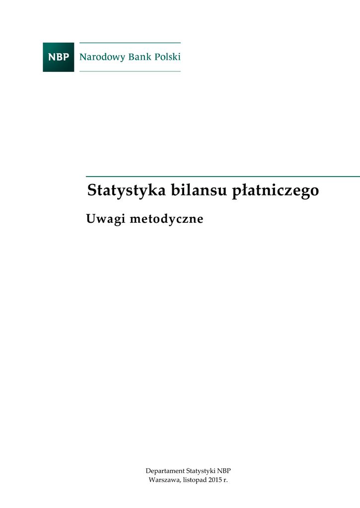 Statystyka bilansu płatniczego Uwagi metodyczne Departament Statystyki NBP Warszawa, listopad 2015 r. Opracował: Departament Statystyki Narodowy Bank Polski 00-919 Warszawa ul. Świętokrzyska 11/21 Spis treści 1. Uwarunkowania instytucjonalne 4 1.1. Wstęp 4 1.2. Uwarunkowania prawne 4 1.3. Współpraca z instytucjami zewnętrznymi 4 1.4. Użytkownicy 5 2. System statystyczny 6 2.1. Typ systemu 6 2.2. Podmioty sprawozdawcze 6 2.3. Progi 6 2.4. Dostępność danych 7 2.5. Kontrola danych 7 3. Polityka rewizji 8 4. Publikacje 8 5. Bilans płatniczy 9 5.1. Rachunek bieżący 9 5.2. Rachunek kapitałowy 19 5.3. Rachunek finansowy 20 6. Międzynarodowa pozycja inwestycyjna 27 6.1. Inwestycje bezpośrednie 27 6.2. Inwestycje portfelowe 28 6.3. Pochodne instrumenty finansowe 30 6.4. Pozostałe inwestycje 30 6.5. Aktywa rezerwowe 33 7. Zadłużenie zagraniczne Polski 34 Uwarunkowania instytucjonalne 1. Uwarunkowania instytucjonalne 1.1. Wstęp Narodowy Bank Polski (NBP) jest instytucją odpowiedzialną za opracowywanie i publikację bilansu płatniczego w Polsce. W NBP opracowywane są również inne statystyki związane z bilansem płatniczym (międzynarodowa pozycja inwestycyjna, zadłużenie zagraniczne, zagraniczne inwestycje bezpośrednie, aktywa rezerwowe). 1.2. Uwarunkowania prawne Zgodnie z Ustawą z dnia 29 sierpnia 1997 r. o Narodowym Banku Polskim (Dz.U. nr 140, poz. 938) NBP jest zobligowany do opracowywania statystyki bilansu płatniczego oraz międzynarodowej pozycji inwestycyjnej, a także do przedstawiania Sejmowi i Radzie Ministrów informacji o tych statystykach. Obowiązki sprawozdawcze podmiotów krajowych zostały określone w ustawie o NBP oraz w ustawie Prawo dewizowe (Dz. U. z 2002 r. nr 141, poz. 1178), jak również w aktach niższego rzędu, takich jak: rozporządzenie Rady Ministrów z dnia 23 października 2009 r. w sprawie przekazywania Narodowemu Bankowi Polskiemu danych niezbędnych do sporządzania bilansu płatniczego oraz międzynarodowej pozycji inwestycyjnej (Dz. U. nr 184, poz.1437) oraz uchwała Zarządu NBP nr 78 z dnia 29 października 2009 r. w sprawie trybu i szczegółowych zasad przekazywania przez banki Narodowemu Bankowi Polskiemu danych niezbędnych do sporządzania bilansu płatniczego oraz międzynarodowej pozycji inwestycyjnej (Dz. Urz. NBP nr 18 z dnia 19 listopada 2009 r.). Niewywiązywanie się z obowiązków sprawozdawczych na potrzeby bilansu płatniczego zagrożone jest, zgodnie z Kodeksem karnym skarbowym, karą grzywny. 1.3. Współpraca z instytucjami zewnętrznymi Narodowy Bank Polski współpracuje z różnymi instytucjami, zarówno krajowymi (przede wszystkim z Głównym Urzędem Statystycznym), jak i zagranicznymi. Dane niezbędne do sporządzania statystyki bilansu płatniczego są dostarczane przez różne instytucje państwowe. Główny Urząd Statystyczny (GUS) przekazuje NBP dane dotyczące handlu zagranicznego i międzynarodowego handlu usługami, zgodne z metodyką wypracowaną wspólnie przez obie instytucje. Dane dotyczące obrotów towarowych i usługowych z zagranicą są wykorzystywane przez 4 Narodowy Bank Polski Uwarunkowania instytucjonalne GUS do wyliczania rachunku reszty świata w statystyce rachunków narodowych (PKB). Dane dotyczące podróży zagranicznych (Polaków i cudzoziemców) są zbierane i przekazywane do NBP przez GUS. Narodowy Bank Polski otrzymuje także z GUS dane o statystyce migracyjnej, które są wykorzystywane do szacowania dochodów z pracy Polaków za granicą i cudzoziemców w Polsce oraz informacje z Badania budżetów gospodarstw domowych. Narodowy Bank Polski pozyskuje z GUS również dane potrzebne do aktualizacji rejestru podmiotów dokonujących operacji ujmowanych w bilansie płatniczym. Ministerstwo Finansów (MF) dostarcza NBP dane o transakcjach zagranicznych sektora rządowego. Przekazuje także informacje, które są wykorzystywane do kompilacji rachunku bieżącego bilansu płatniczego, tj. dane dotyczące importu używanych samochodów z obszaru Unii Europejskiej (UE); dane te nie są rejestrowane przez GUS. Zakład Ubezpieczeń Społecznych (ZUS) przekazuje NBP dane o liczbie cudzoziemców, za których odprowadzane są składki na ubezpieczenie społeczne i zdrowotne, oraz dane o rentach i emeryturach wypłacanych za granicę. Ministerstwo Pracy i Polityki Społecznej (MPiPS) przekazuje NBP dane na temat liczby złożonych oświadczeń o chęci powierzenia cudzoziemcom pracy w Polsce oraz na temat liczby wydanych zezwoleń na pracę. Informacje te są wykorzystywane do szacowania dochodów z pracy cudzoziemców w Polsce i przekazywanych zarobków. Ponadto NBP współpracuje w zakresie metodyki bilansu płatniczego z instytucjami międzynarodowymi, takimi jak: Europejski Bank Centralny (EBC), Eurostat, Międzynarodowy Fundusz Walutowy (MFW), Organizacja Współpracy Gospodarczej i Rozwoju (OECD), Bank Światowy (BŚ) oraz Bank Rozrachunków Międzynarodowych (BIS). 1.4. Użytkownicy Bilans płatniczy, międzynarodowa pozycja inwestycyjna, zadłużenie zagraniczne i oficjalne aktywa rezerwowe są publikowane na stronie internetowej NBP i w ten sposób udostępniane użytkownikom. Ponadto dane oraz opis bilansu płatniczego są przekazywane m.in. do Parlamentu, Rządu, GUS, publicznych i prywatnych ośrodków badawczych, wyższych uczelni, agencji ratingowych. Materiał analityczny opisujący bilans płatniczy jest również publikowany na stronie internetowej NBP. Dane bilansu płatniczego, międzynarodowej pozycji inwestycyjnej i zagranicznych inwestycji bezpośrednich są regularnie przekazywane do Eurostatu, EBC, MFW, OECD, BŚ. Statystyka bilansu płatniczego 5 System statystyczny 2. System statystyczny 2.1. Typ systemu System kompilacji bilansu płatniczego w Polsce jest oparty na sprawozdaniach bezpośrednio przekazywanych przez podmioty sprawozdawcze do NBP. Sprawozdania te dotyczą zagranicznych aktywów i pasywów finansowych oraz dochodów z nich. Ponadto do zestawi