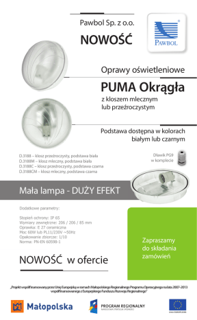 www.pawbol.pl Pawbol Sp. z o.o. ® NOWOŚĆ NOWOŚĆ Oprawy oświetleniowe PUMA Okrągła z kloszem mlecznym lub przeźroczystym Podstawa dostępna w kolorach białym lub czarnym D.3188 – klosz przeźroczysty, podstawa biała D.3188M – klosz mleczny, podstawa biała D.3188C – klosz przeźroczysty, podstawa czarna D.3188CM – klosz mleczny, podstawa czarna Dławik PG9 w komplecie Mała lampa - DUŻY EFEKT Dodatkowe parametry: Stopień ochrony: IP 65 Wymiary zewnętrzne: 206 / 206 / 85 mm Oprawka: E 27 ceramiczna Moc 60W lub PL11/230V ~50Hz Opakowanie zbiorcze: 1/10 Norma: PN-EN 60598-1 NOWOŚĆ w ofercie Zapraszamy do składania zamówień