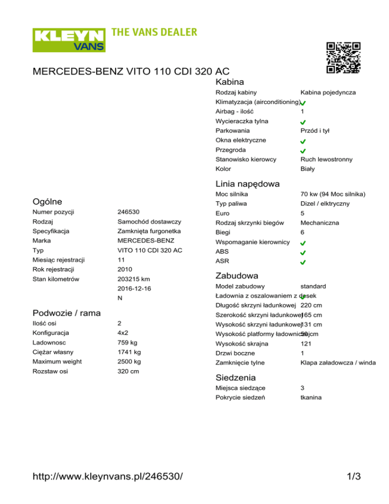MERCEDES-BENZ VITO 110 CDI 320 AC Kabina Rodzaj kabiny Kabina pojedyncza Klimatyzacja (airconditioning) Airbag - ilość 1 Wycieraczka tylna Parkowania Przód i tył Okna elektryczne Przegroda Stanowisko kierowcy Ruch lewostronny Kolor Biały Linia napędowa Ogólne Moc silnika 70 kw (94 Moc silnika) Typ paliwa Dizel / elktryczny Numer pozycji 246530 Euro 5 Rodzaj Samochód dostawczy Rodzaj skrzynki biegów Mechaniczna Specyfikacja Zamknięta furgonetka Biegi 6 Marka MERCEDES-BENZ Wspomaganie kierownicy Typ VITO 110 CDI 320 AC ABS Miesiąc rejestracji 11 ASR Rok rejestracji 2010 Stan kilometrów 203215 km Zabudowa 2016-12-16 Model zabudowy N Ładownia z oszalowaniem z desek standard Długość skrzyni ładunkowej 220 cm Podwozie / rama Szerokość skrzyni ładunkowej165 cm Ilość osi 2 Wysokość skrzyni ładunkowej131 cm Konfiguracja 4x2 Wysokość platformy ładowniczej 50 cm Ladownosc 759 kg Wysokość skrajna 121 Ciężar własny 1741 kg Drzwi boczne 1 Maximum weight 2500 kg Zamknięcie tylne Klapa załadowcza / winda Rozstaw osi 320 cm http://www.kleynvans.pl/246530/ Siedzenia Miejsca siedzące 3 Pokrycie siedzeń tkanina 1/3 MERCEDES-BENZ VITO 110 CDI 320 AC Ilość osi mm mm Hamulce tarczowe Rodzaj osi skrętnej Mechaniczne Typ zawieszenia Wymiar opony 205/65R16,0 Oś skrętna Raport inspekcji Kody wyświetlacza Elektryczny Kolumna kierownicу Resory Rama mm mm Hamulce tarczowe Typ zawieszenia Wymiar opony Hamulce Idealny/nowy Silnik - całość Bardzo dobry Układ chłodzenia Rozsądny Stan Układ paliwowy Akceptowalny Układ wydechowy Nie spełnia wymagań 205/65R16,0 Układ smarowania Skrzynka biegów Sprzęgło Napęd Opony http://www.kleynvans.pl/246530/ 2/3 MERCEDES-BENZ VITO 110 CDI 320 AC http://www.kleynvans.pl/246530/ 3/3
