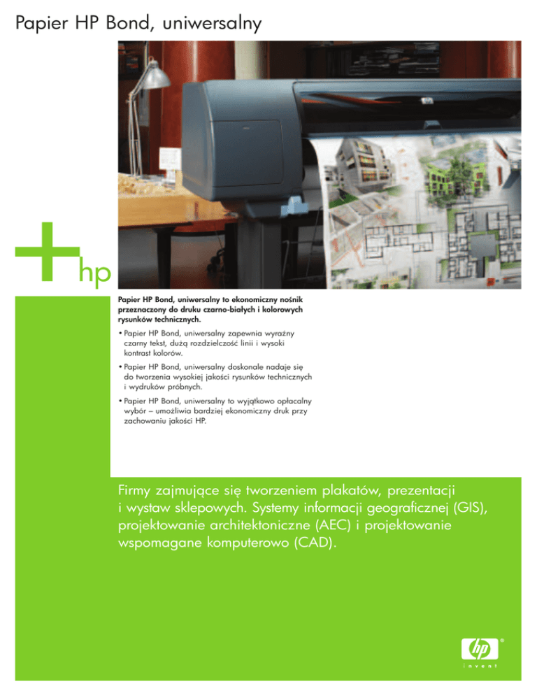 Papier HP Bond, uniwersalny Papier HP Bond, uniwersalny to ekonomiczny nonik przeznaczony do druku czarno-białych i kolorowych rysunków technicznych. • Papier HP Bond, uniwersalny zapewnia wyrany czarny tekst, du rozdzielczoć linii i wysoki kontrast kolorów. • Papier HP Bond, uniwersalny doskonale nadaje si do tworzenia wysokiej jakoci rysunków technicznych i wydruków próbnych. • Papier HP Bond, uniwersalny to wyjtkowo opłacalny wybór – umoliwia bardziej ekonomiczny druk przy zachowaniu jakoci HP. Firmy zajmujce si tworzeniem plakatów, prezentacji i wystaw sklepowych. Systemy informacji geograficznej (GIS), projektowanie architektoniczne (AEC) i projektowanie wspomagane komputerowo (CAD). Papier HP Bond, uniwersalny Zgodnoć Drukarki HP Designjet Systemy atramentowe HP Ustawienie na panelu sterowania Drukarki HP Designjet seria 5500/5000 Barwnikowy system atramentowy HP 81 Basic Bond Paper – Universal Drukarki HP Designjet seria 3000CP/2000CP Barwnikowy system atramentowy HP CP Coated Paper Drukarki HP Designjet seria 1000 Barwnikowy system atramentowy HP 80 Bright White Inkjet Paper Drukarki HP Designjet seria 800/500 Barwnikowe systemy atramentowe HP 10, 11 i 82 Bright White Inkjet Paper Drukarki HP Designjet seria 750/755 Barwnikowe systemy atramentowe HP 45 czarny, HP 44 błkitny, purpurowy, ółty Opaque Bond Paper Drukarki HP Designjet seria 700 Barwnikowy system atramentowy HP 45 czarny Opaque Bond Paper Drukarki HP Designjet seria 400/300 Barwnikowe systemy atramentowe HP 40 czarny, HP 44 błkitny, purpurowy, ółty Plain Paper Drukarki HP Designjet seria 130 Barwnikowe systemy atramentowe HP 84 czarny, HP 85 błkitny, purpurowy, ółty Plain Paper Najnowsze profile ICC/profile noników mona znaleć pod adresem www.hp.com/go/designjet/supplies/support (kliknij profile ICC i wybierz drukark). W przypadku drukarek nieobsługujcych PostScript skontaktuj si ze sprzedawc programowego procesora obrazu. Gramatura 80 g/m2 wg metody testowej ISO 536 Gruboć 107 micro m wg metody testowej ISO 534 Nieprzezroczystoć 90% wg metody testowej TAPPI T-425 Jaskrawoć 110% wg metody testowej TAPPI T-452 Biel CIE 160 wg metody testowej CIE Ganz 82 Laminowanie Papier ten mona laminować przy uyciu dostpnych na rynku folii samoprzylepnych. Wicej informacji na temat partnerów HP zajmujcych si laminowaniem mona znaleć pod adresem: www.hp.com/go/designjet/supplies Wyko czenie Matowy Odpornoć na działanie wody Wymagane laminowanie Czas wysychania Natychmiast (w temperaturze 23 °C, przy wilgotnoci wzgldnej 50%) Termin przydatnoci do uycia 2 lata w oryginalnym, fabrycznie zamknitym opakowaniu Kraj pochodzenia Wgry Numery katalogowe HP Numer produktu Gwarancja na noniki wielkoformatowe Wymiary nonika w roli 610 mm x 45,7 m 7 25184-66016 0 Q1397A 914 mm x 45,7 m 7 25184-66017 7 Q1398A 1 067 mm x 45,7 m 7 25184-66018 4 Q8004A 594 mm x 91,4 m 8 29160-96574 1 Q8005A 841 mm x 91,4 m 8 29160-96575 8 HP gwarantuje, e wielkoformatowe materiały drukarskie HP s wolne od defektów i wad produkcyjnych, i s tak zaprojektowane, by przy właciwym uytkowaniu nie powodować zacić drukarki. Jeli z jakiegokolwiek powodu uytkownik jest niezadowolony z wielkoformatowego materiału drukarskiego HP, powinien skontaktować si ze swoim sprzedawc. © Copyright 2005 Hewlett-Packard Development Company, L.P. Specyfikacje zawarte w tym dokumencie mog bez uprzedzenia ulec zmianie. Wszystkie gwarancje udzielane w odniesieniu do produktów i usług HP okrelone zostały w owiadczeniach gwarancyjnych załczanych do kadego produktu i usługi. aden zapis niniejszego dokumentu nie moe być uwaany za dodatkow gwarancj. HP nie ponosi odpowiedzialnoci za błdy techniczne lub drukarskie w niniejszym dokumencie. Wicej informacji o podobnych produktach mona znaleć na stronach materiałów eksploatacyjnych HP Designjet, pod adresem www.hp.com/go/designjet/supplies 4AA0-2039PLE. Padziernik 2005 Kody UPC Q1396A