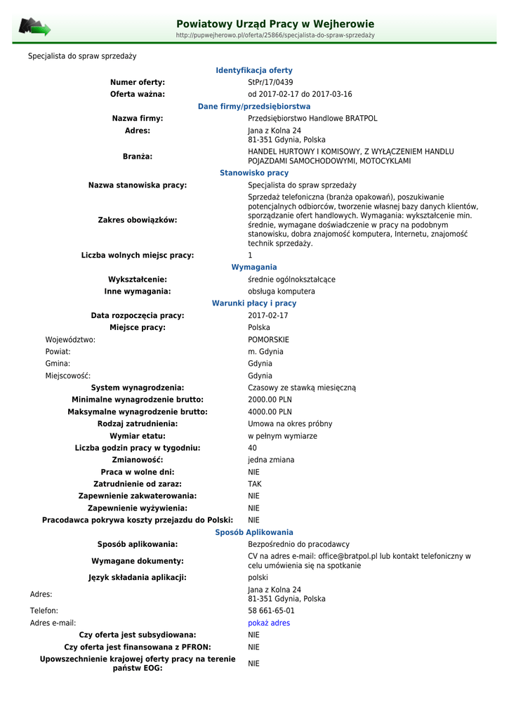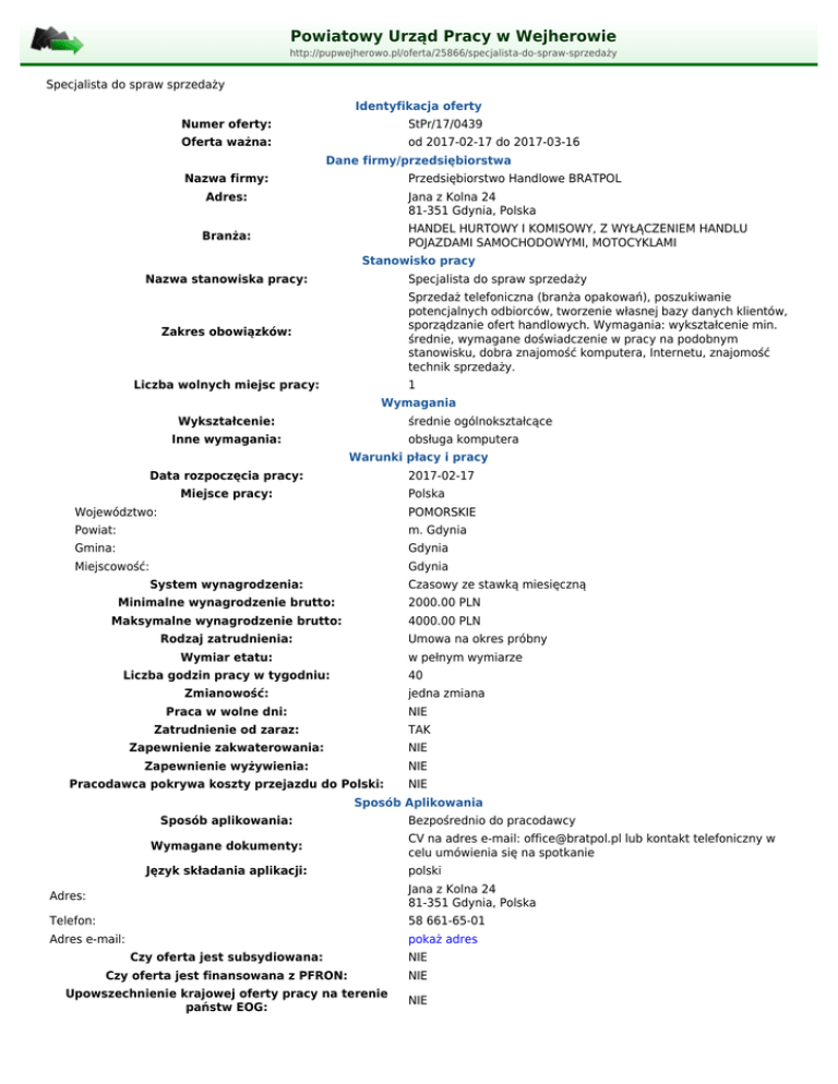 Powiatowy Urząd Pracy w Wejherowie http://pupwejherowo.pl/oferta/25866/specjalista-do-spraw-sprzedaży Specjalista do spraw sprzedaży Identyfikacja oferty Numer oferty: StPr/17/0439 Oferta ważna: od 2017-02-17 do 2017-03-16 Dane firmy/przedsiębiorstwa Nazwa firmy: Przedsiębiorstwo Handlowe BRATPOL Adres: Jana z Kolna 24 81-351 Gdynia, Polska HANDEL HURTOWY I KOMISOWY, Z WYŁĄCZENIEM HANDLU POJAZDAMI SAMOCHODOWYMI, MOTOCYKLAMI Branża: Stanowisko pracy Nazwa stanowiska pracy: Specjalista do spraw sprzedaży Sprzedaż telefoniczna (branża opakowań), poszukiwanie potencjalnych odbiorców, tworzenie własnej bazy danych klientów, sporządzanie ofert handlowych. Wymagania: wykształcenie min. średnie, wymagane doświadczenie w pracy na podobnym stanowisku, dobra znajomość komputera, Internetu, znajomość technik sprzedaży. Zakres obowiązków: Liczba wolnych miejsc pracy: 1 Wymagania Wykształcenie: średnie ogólnokształcące Inne wymagania: obsługa komputera Warunki płacy i pracy Data rozpoczęcia pracy: 2017-02-17 Miejsce pracy: Polska Województwo: POMORSKIE Powiat: m. Gdynia Gmina: Gdynia Miejscowość: Gdynia System wynagrodzenia: Czasowy ze stawką miesięczną Minimalne wynagrodzenie brutto: 2000.00 PLN Maksymalne wynagrodzenie brutto: 4000.00 PLN Rodzaj zatrudnienia: Umowa na okres próbny Wymiar etatu: w pełnym wymiarze Liczba godzin pracy w tygodniu: 40 Zmianowość: jedna zmiana Praca w wolne dni: NIE Zatrudnienie od zaraz: TAK Zapewnienie zakwaterowania: NIE Zapewnienie wyżywienia: NIE Pracodawca pokrywa koszty przejazdu do Polski: NIE Sposób Aplikowania Sposób aplikowania: Wymagane dokumenty: Język składania aplikacji: Bezpośrednio do pracodawcy CV na adres e-mail: [email protected] lub kontakt telefoniczny w celu umówienia się na spotkanie polski Adres: Jana z Kolna 24 81-351 Gdynia, Polska Telefon: 58 661-65-01 Adres e-mail: pokaż adres Czy oferta jest subsydiowana: NIE Czy oferta jest finansowana z PFRON: NIE Upowszechnienie krajowej oferty pracy na terenie państw EOG: NIE