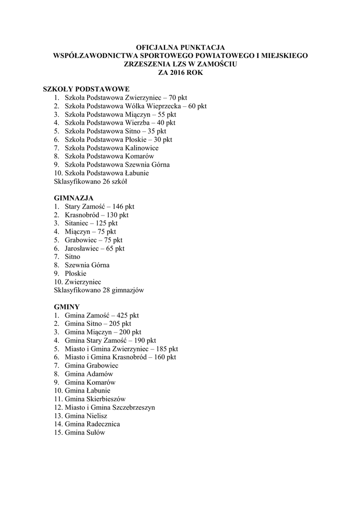 OFICJALNA PUNKTACJA WSPÓŁZAWODNICTWA SPORTOWEGO POWIATOWEGO I MIEJSKIEGO ZRZESZENIA LZS W ZAMOŚCIU ZA 2016 ROK SZKOŁY PODSTAWOWE 1. Szkoła Podstawowa Zwierzyniec – 70 pkt 2. Szkoła Podstawowa Wólka Wieprzecka – 60 pkt 3. Szkoła Podstawowa Miączyn – 55 pkt 4. Szkoła Podstawowa Wierzba – 40 pkt 5. Szkoła Podstawowa Sitno – 35 pkt 6. Szkoła Podstawowa Płoskie – 30 pkt 7. Szkoła Podstawowa Kalinowice 8. Szkoła Podstawowa Komarów 9. Szkoła Podstawowa Szewnia Górna 10. Szkoła Podstawowa Łabunie Sklasyfikowano 26 szkół GIMNAZJA 1. Stary Zamość – 146 pkt 2. Krasnobród – 130 pkt 3. Sitaniec – 125 pkt 4. Miączyn – 75 pkt 5. Grabowiec – 75 pkt 6. Jarosławiec – 65 pkt 7. Sitno 8. Szewnia Górna 9. Płoskie 10. Zwierzyniec Sklasyfikowano 28 gimnazjów GMINY 1. Gmina Zamość – 425 pkt 2. Gmina Sitno – 205 pkt 3. Gmina Miączyn – 200 pkt 4. Gmina Stary Zamość – 190 pkt 5. Miasto i Gmina Zwierzyniec – 185 pkt 6. Miasto i Gmina Krasnobród – 160 pkt 7. Gmina Grabowiec 8. Gmina Adamów 9. Gmina Komarów 10. Gmina Łabunie 11. Gmina Skierbieszów 12. Miasto i Gmina Szczebrzeszyn 13. Gmina Nielisz 14. Gmina Radecznica 15. Gmina Sułów