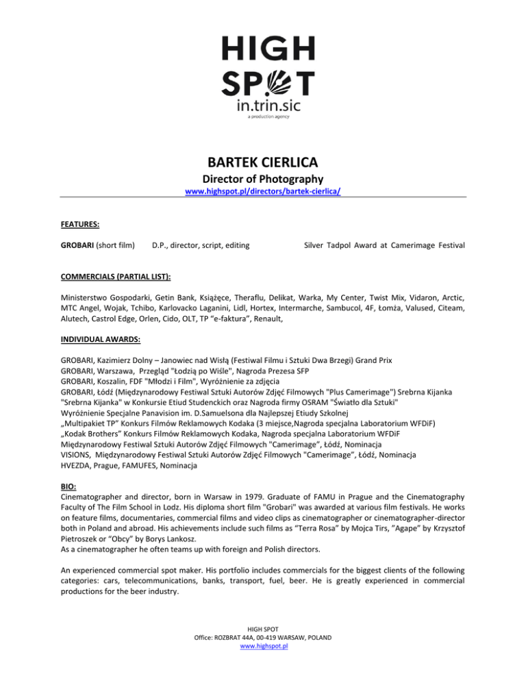 BARTEK CIERLICA Director of Photography www.highspot.pl/directors/bartek-cierlica/ FEATURES: GROBARI (short film) D.P., director, script, editing Silver Tadpol Award at Camerimage Festival COMMERCIALS (PARTIAL LIST): Ministerstwo Gospodarki, Getin Bank, Książęce, Theraflu, Delikat, Warka, My Center, Twist Mix, Vidaron, Arctic, MTC Angel, Wojak, Tchibo, Karlovacko Laganini, Lidl, Hortex, Intermarche, Sambucol, 4F, Łomża, Valused, Citeam, Alutech, Castrol Edge, Orlen, Cido, OLT, TP “e-faktura”, Renault, INDIVIDUAL AWARDS: GROBARI, Kazimierz Dolny – Janowiec nad Wisłą (Festiwal Filmu i Sztuki Dwa Brzegi) Grand Prix GROBARI, Warszawa, Przegląd "Łodzią po Wiśle", Nagroda Prezesa SFP GROBARI, Koszalin, FDF "Młodzi i Film", Wyróżnienie za zdjęcia GROBARI, Łódź (Międzynarodowy Festiwal Sztuki Autorów Zdjęd Filmowych "Plus Camerimage") Srebrna Kijanka "Srebrna Kijanka" w Konkursie Etiud Studenckich oraz Nagroda firmy OSRAM "Światło dla Sztuki" Wyróżnienie Specjalne Panavision im. D.Samuelsona dla Najlepszej Etiudy Szkolnej „Multipakiet TP” Konkurs Filmów Reklamowych Kodaka (3 miejsce,Nagroda specjalna Laboratorium WFDiF) „Kodak Brothers” Konkurs Filmów Reklamowych Kodaka, Nagroda specjalna Laboratorium WFDiF Międzynarodowy Festiwal Sztuki Autorów Zdjęd Filmowych "Camerimage”, Łódź, Nominacja VISIONS, Międzynarodowy Festiwal Sztuki Autorów Zdjęd Filmowych "Camerimage”, Łódź, Nominacja HVEZDA, Prague, FAMUFES, Nominacja BIO: Cinematographer and director, born in Warsaw in 1979. Graduate of FAMU in Prague and the Cinematography Faculty of The Film School in Lodz. His diploma short film "Grobari" was awarded at various film festivals. He works on feature films, documentaries, commercial films and video clips as cinematographer or cinematographer-director both in Poland and abroad. His achievements include such films as “Terra Rosa” by Mojca Tirs, ”Agape” by Krzysztof Pietroszek or “Obcy” by Borys Lankosz. As a cinematographer he often teams up with foreign and Polish directors. An experienced commercial spot maker. His portfolio includes commercials for the biggest clients of the following categories: cars, telecommunications, banks, transport, fuel, beer. He is greatly experienced in commercial productions for the beer industry. HIGH SPOT Office: ROZBRAT 44A, 00-419 WARSAW, POLAND www.highspot.pl