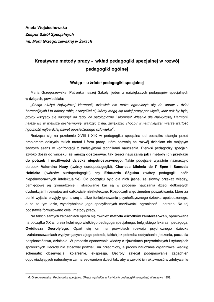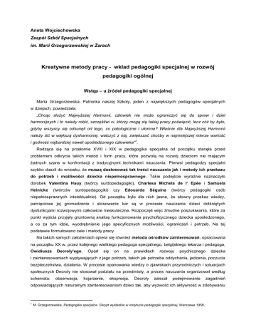 Aneta Wojciechowska Zespół Szkół Specjalnych im. Marii Grzegorzewskiej w Żarach Kreatywne metody pracy - wkład pedagogiki specjalnej w rozwój pedagogiki ogólnej Wstęp – u źródeł pedagogiki specjalnej Maria Grzegorzewska, Patronka naszej Szkoły, jeden z największych pedagogów specjalnych w dziejach, powiedziała: „Chcąc służyć Najwyższej Harmonii, człowiek nie może ograniczyć się do spraw i dzieł harmonijnych i to należy robić, szczęśliwi ci, którzy mogą się takiej pracy poświęcić, lecz cóż by było, gdyby wszyscy się odsunęli od tego, co patologiczne i ułomne? Właśnie dla Najwyższej Harmonii należy iść w większą dysharmonię, walczyć z nią, zwiększać choćby w najmniejszej mierze wartość 1 i godność najbardziej nawet upośledzonego człowieka" . Rodząca się na przełomie XVIII i XIX w pedagogika specjalna od początku stanęła przed problemem odkrycia takich metod i form pracy, które pozwolą na rozwój dzieciom nie mającym żadnych szans w konfrontacji z tradycyjnymi technikami nauczania. Pierwsi pedagodzy specjalni szybko doszli do wniosku, że muszą dostosować tak treści nauczania jak i metody ich przekazu do potrzeb i możliwości dziecka niepełnosprawnego. Takie podejście wyraźnie naznaczyło dorobek Valentina Hauy (twórcy surdopedagogiki), Charlesa Michela de l’ Epée i Samuela Heinicke (twórców surdopedagogiki) czy Edouarda Séguina (twórcy pedagogiki osób niepełnosprawnych intelektualnie). Od początku było dla nich jasne, że słowny przekaz wiedzy, pamięciowe jej gromadzenie i stosowanie kar są w procesie nauczania dzieci dotkniętych dysfunkcjami rozwojowymi całkowicie nieskuteczne. Rozpoczęli więc żmudne poszukiwania, które za punkt wyjścia przyjęły gruntowną analizę funkcjonowania psychofizycznego dziecka upośledzonego, a co za tym idzie, wyodrębnienie jego specyficznych możliwości, ograniczeń i potrzeb. Na tej podstawie formułowano cele i metody pracy. Na takich samych założeniach opiera się również metoda ośrodków zainteresowań, opracowana na początku XX w. przez kolejnego wielkiego pedagoga specjalnego, belgijskiego lekarza i pedagoga, Owidiusza Decroly’ego. Oparł się on na prawidłach rozwoju psychicznego dziecka i zainteresowaniach wypływających z jego potrzeb, takich jak potrzeba oddychania, jedzenia, poczucia bezpieczeństwa, działania. W procesie opanowania wiedzy o zjawiskach przyrodniczych i sytuacjach społecznych Decroly nie stosował podziału na przedmioty, a proces nauczania organizował według schematu: obserwacja, kojarzenie, ekspresja. Decroly zalecał podejmowanie zagadnień odpowiadających naturalnym zainteresowaniom dzieci tak, aby wyzwolić ich aktywność w zdobywaniu 1 M. Grzegorzewska, Pedagogika specjalna. Skrypt wykładów w instytucie pedagogiki specjalnej, Warszawa 1959. wiedzy. Chodziło o to, aby przygotować dzieci do życia przez samo życie, bowiem przeznaczeniem każdej istoty jest przede wszystkim żyć i żyć godnie. Jedną z najbliższych współpracownic Owidiusza Decroly’ego była Józefa Joteyko – psycholog, doktor paryskiej Sorbony. Bardzo szybko stała się ona orędowniczką działań zmierzających do zreformowania szkolnictwa, w tym również szkolnictwa specjalnego. Biorąc wzór z wielkiego Belga prezentowała koncepcję szkoły, w której wszystkim dzieciom należy zapewnić równy start i prawo do nauki. Domagała się, aby w ramach szkoły powszechnej tworzone były oddziały specjalne dla dzieci upośledzonych umysłowo czy sprawiających trudności wychowawcze. Uważała, że w pracy dydaktycznej należy rezygnować z nauczania jedynie werbalnego i oprzeć ją przede wszystkim na aktywizacji i zainteresowaniach dziecka. Potrzeba tworzenia, radość zaangażowania, intensywność wspólnoty możliwe są tylko dzięki rozwojowi zainteresowań i wyobraźni. Szkoła musi pobudzać do działania i myślenia. Optymalny kierunek oddziaływań na dziecko to pobudzanie percepcji i procesów poznawczych poprzez świadomą obserwację, myślenie, odczuwanie, wyobrażanie, rozwiązywanie problemów, kształtowanie ekspresji twórczej. Uczennicą, a potem przyjaciółką Józefy Joteyko była Maria Grzegorzewska. Józefa Joteyko szybko wprowadziła ją w krąg wielkiej światowej nauki. To pod jej wpływem Grzegorzewska poznała osobiście Owidiusza Decroly’ego i zapoznała się dokładnie z jego koncepcjami pedagogicznymi. Pod wpływem Józefy Joteyko Grzegorzewska poświęciła się pracy z dziećmi upośledzonymi i w ten sposób stała się twórczynią polskiej pedagogiki specjalnej. Zasady edukacji specjalnej w ujęciu Marii Grzegorzewskiej Maria Grzegorzewska sformułowała, dla potrzeb rodzącej się na początku trzeciej dekady XX w. polskiej pedagogiki specjalnej, jasne cele i zadania, które przed nią stanęły. Wyróżniła wśród nich: cel humanitarny, polegający na udzielaniu jednostce upośledzonej pomocy w realizacji jej zadań życiowych a także na ukazaniu społeczeństwu prawa każdej jednostki upośledzonej do uczestnictwa w życiu społecznym w ramach posiadanych sił i możliwości, cel funkcjonalny, którym jest optymalny rozwój jednostki, wzmocnienie jej sił fizycznych i psychicznych oraz kompensowanie braków, cel społeczny, polegający na włączeniu jednostek do społeczeństwa i przezwyciężaniu izolacji, cel ekonomiczny, tzn. przygotowanie upośledzonych do pracy zawodowej; w tym celu Grzegorzewska dostosowała metodę ośrodków zainteresowań Decroly’ego do potrzeb szkolnictwa w Polsce - jako metoda ośrodków pracy jest ona do dziś stosowana w pracy z dziećmi specjalnej troski. Grzegorzewska podkreślała, że jeśli chcemy, aby praca w szkole specjalnej przebiegała prawidłowo, należy: w doborze materiału dostosować się do poziomu dziecka i jego zainteresowań, opierać się na rzeczach znanych, obserwować cechy zasadnicze bez wchodzenia w szczegóły, cechy charakt