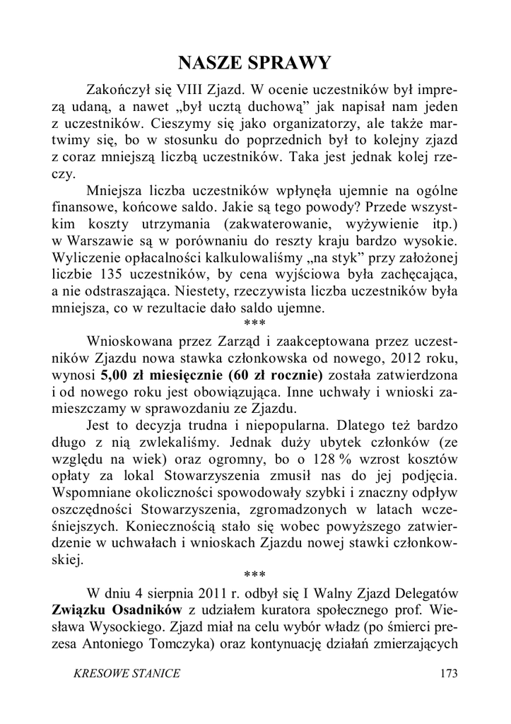 NASZE SPRAWY Zakończył się VIII Zjazd. W ocenie uczestników był imprezą udaną, a nawet „był ucztą duchową” jak napisał nam jeden z uczestników. Cieszymy się jako organizatorzy, ale także martwimy się, bo w stosunku do poprzednich był to kolejny zjazd z coraz mniejszą liczbą uczestników. Taka jest jednak kolej rzeczy. Mniejsza liczba uczestników wpłynęła ujemnie na ogólne finansowe, końcowe saldo. Jakie są tego powody? Przede wszystkim koszty utrzymania (zakwaterowanie, wyżywienie itp.) w Warszawie są w porównaniu do reszty kraju bardzo wysokie. Wyliczenie opłacalności kalkulowaliśmy „na styk” przy założonej liczbie 135 uczestników, by cena wyjściowa była zachęcająca, a nie odstraszająca. Niestety, rzeczywista liczba uczestników była mniejsza, co w rezultacie dało saldo ujemne. *** Wnioskowana przez Zarząd i zaakceptowana przez uczestników Zjazdu nowa stawka członkowska od nowego, 2012 roku, wynosi 5,00 zł miesięcznie (60 zł rocznie) została zatwierdzona i od nowego roku jest obowiązująca. Inne uchwały i wnioski zamieszczamy w sprawozdaniu ze Zjazdu. Jest to decyzja trudna i niepopularna. Dlatego też bardzo długo z nią zwlekaliśmy. Jednak duży ubytek członków (ze względu na wiek) oraz ogromny, bo o 128 % wzrost kosztów opłaty za lokal Stowarzyszenia zmusił nas do jej podjęcia. Wspomniane okoliczności spowodowały szybki i znaczny odpływ oszczędności Stowarzyszenia, zgromadzonych w latach wcześniejszych. Koniecznością stało się wobec powyższego zatwierdzenie w uchwałach i wnioskach Zjazdu nowej stawki członkowskiej. *** W dniu 4 sierpnia 2011 r. odbył się I Walny Zjazd Delegatów Związku Osadników z udziałem kuratora społecznego prof. Wiesława Wysockiego. Zjazd miał na celu wybór władz (po śmierci prezesa Antoniego Tomczyka) oraz kontynuację działań zmierzających KRESOWE STANICE 173 do zarejestrowania w sądzie Związku Osadników na prawach statutu z 1936 r. Dopiero po takim zarejestrowaniu Związku Osadników zostanie podjęta decyzja o rozwiązaniu Stowarzyszenia Rodzin Osadników Wojskowych i Cywilnych Kresów Wschodnich. Działania Zarządu Stowarzyszenia, które są prowadzone od II Zjazdu, a więc od 1999 roku i które będą kontynuowane przez Związek Osadników mają na celu odzyskanie Domu Związku Osadników przy ul. Myśliwieckiej w Warszawie. Działania w tej sprawie są podejmowane (i zawsze były), za aprobatą i poparciem naszych członków. Dla przypomnienia, w 1999 r. zwróciliśmy się do ówczesnego rektora Akademii Sztuk Pięknych – rektora Adama Myjaka o przydzielenie Stowarzyszeniu pokoi na lokal Stowarzyszenia. Odpowiedź była negatywna. Wszystkie osoby obecnie prowadzące tę sprawę to potomkowie osadników, osoby kompetentne i uprawnione do takich roszczeń. *** Odznaczeni medalem Dziedzictwo Kresów Wschodnich W czasie VIII Zjazdu, Kapituła Medalu Dziedzictwo Kresów Wschodnich odznaczyła niżej wymienione osoby: Jan Stanisław Ciechanowski – Kierownik Urzędu do spraw Kombatantów i Osób Represjonowanych, Andrzej Krzysztof Kunert – Sekretarz Rady Ochrony Pamięci Walk i Męczeństwa, Jerzy Baluch – syn osadnika z osady Maczkowce na Wołyniu. Aktywny członek naszego Stowarzyszenia, autor książki „Życie na stos rzucone”, Klara Rogalska – Sybiraczka od trzeciego pokolenia. Aktywny działacz społeczny na terenie Białegostoku, działająca i niosąca pomoc Polakom mieszkającym na Białorusi, Józef Gawlak – syn osadnika z osady Skomorucha na Polesiu, Sybirak, żołnierz, uczestnik bitwy pod Monte Cassino, Władysław Szwender – Kresowiak, Sybirak, Kombatant, uczestnik bitwy pod Monte Cassino, 174 KRESOWE STANICE Helena Klajn – córka osadnika, Sybiraczka, Kombatant II wojny światowej, Tadeusz Kołudzki-Stobbe – Wiceprezes Stowarzyszenia Przyjaciół Ziemi Drohobyckiej, Zofia Teliga-Martens – córka osadnika z osady Wola Rycerska pow. Krzemieniec, inicjatorka i wykonawczyni sprowadzenia do Polski 63 rodzin Polaków z Kazachstanu, uzyskała dla nich wszystkich mieszkania, Łucja Grabowska – Prezes Stowarzyszenia Grodnian im. Elizy Orzeszkowej, Aneta Hoffmann – Dyrektor na Polskę Fundacji Kresy-Syberia, Zofia Rosińska – córka osadnika z osady Kościuszków na Wołyniu, Kierownik zespołu artystycznego „Ad Rem”, który tak udanie prezentował się nam podczas ostatnich naszych Zjazdów, Anna Szlenkier – córka osadnika z osady Krechowieckiej na Wołyniu, aktywny członek naszego Stowarzyszenia, Zygmunt Zarębski – syn osadnika z osady Lerypol, pow. Grodno, aktywny członek Stowarzyszenia. *** Czytaliśmy, polecamy... Informujemy naszych Członków i Czytelników, że ukazała się i jest do nabycia poprzez nasze Stowarzyszenie kolejna książka Felicji Konarskiej Wołyń – moja tęsknota i inne miniaturki. Autorka jest członkiem naszego Stowarzyszenia. Dotychczas ukazały się dwie książki autorstwa pani Felicji – Liście na wietrze i Kolory w szarości. Stały się one dużym sukcesem. Szczególnie ta pierwsza, która wydawana była trzykrotnie, raz także w języku angielskim. W prezentowanej książce autorka niejako sięga do korzeni, do KRESOWE STANICE 175 czasu krótkiego dzieciństwa na Wołyniu, osadnictwa i przeżyć z tym związanych. Książkę bardzo polecamy. Cena książki wraz z kosztami przesyłki to 30 zł. *** 21 września br. uczestniczyliśmy w uroczystości nadania Bibliotece Publicznej (Warszawa Praga Południe przy ul. Meissnera) imienia Zygmunta Jana Rumla Uroczysta sesja naukowa, poczty sztandarowe oraz jej uczestnicy stworzyli uroczystość niespotykaną. A wszystko to poprzedzone zostało mszą świętą, której przewodniczył i wygłosił homilię Ordynariusz Diecezji Warszawsko-Praskiej abp Henryk Hoser. W sesji naukowej uczestniczyli przedstawiciele nauki i kultury: prof. Wiesław Wysocki, dr Janusz Gmitruk, Bożena Gorska, Ewa Kaniewska, Ksenia Bagniewska, dr Tadeusz Samborski. W