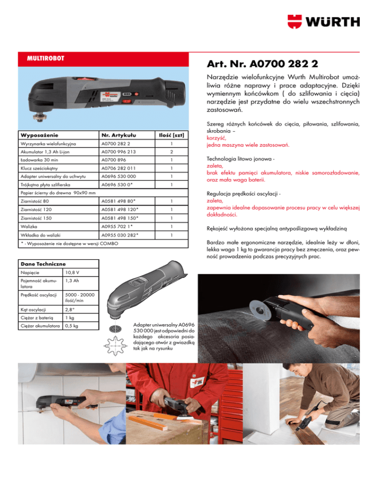 Multirobot Art. Nr. A0700 282 2 Narzędzie wielofunkcyjne Wurth Multirobot umożliwia różne naprawy i prace adaptacyjne. Dzięki wymiennym końcówkom ( do szlifowania i cięcia) narzędzie jest przydatne do wielu wszechstronnych zastosowań. Wyposażenie Nr. Artykułu Wyrzynarka wielofunkcyjna A0700 282 2 1 Akumulator 1,3 Ah Li-jon A0700 996 213 2 Ładowarka 30 min A0700 896 1 Klucz sześciokątny A0706 282 011 1 Adapter uniwersalny do uchwytu A0696 530 000 1 Trójkątna płyta szlifierska A0696 530 0* 1 Ziarnistość 80 A0581 498 80* 1 Ziarnistość 120 A0581 498 120* 1 Ziarnistość 150 A0581 498 150* 1 Walizka A0955 702 1* 1 Wkładka do walizki A0955 030 282* 1 Papier ścierny do drewna 90x90 mm Paca płaska Ilość [szt] Szereg różnych końcówek do cięcia, piłowania, szlifowania, skrobania – korzyść, jedna maszyna wiele zastosowań. Technologia litowo jonowa zaleta, brak efektu pamięci akumulatora, niskie samorozładowanie, oraz mała waga baterii. Regulacja prędkości oscylacji zaleta, zapewnia idealne dopasowanie procesu pracy w celu większej dokładności. Rękojeść wyłożona specjalną antypoślizgową wykładziną Bardzo małe ergonomiczne narzędzie, idealnie leży w dłoni, lekka waga 1 kg to gwarancja pracy bez zmęczenia, oraz pewność prowadzenia podczas precyzyjnych prac. * - Wyposażenie nie dostępne w wersji COMBO Dane Techniczne Napięcie 10,8 V Pojemność akumulatora 1,3 Ah Prędkość oscylacji 5000 - 20000 ilość/min Kąt oscylacji 2,8° Ciężar z baterią 1 kg Ciężar akumulatora 0,5 kg Adapter uniwersalny A0696 530 000 jest odpowiedni do każdego akcesoria posiadającego otwór z gwiazdką tak jak na rysunku Wyrzynarka STP 135 S Zalecany osprzęt do Multirobota Opis Wymiary Zastosowanie Nr. Art. Opak. Nr. zdjęcia Brzeszczot uniwersalny L=50mm, Sz= 35mm Cięcie dokładne drewna A0696 530 1 3 7 Brzeszczot uniwersalny L=50mm, Sz= 65mm Cięcie dokładne drewna A0696 530 2 3 7 Brzeszczot uniwersalny L=50mm, Sz= 35mm Cięcie standartowe drewna A0696 530 3 3 8 Brzeszczot uniwersalny L=50mm, Sz= 65mm Cięcie standartowe drewna A0696 530 4 3 8 Brzeszczot uniwersalny ( bimetal ) L=60mm, Sz= 28mm Cięcie gwoździ, rur miedzianych, aluminuim, A0696 531 1 blachy stalowej, drewna, płyty gips-karton itp. L=60mm, Sz= 44mm A0696 531 2 3 9 3 9 Brzeszczot uniwersalny ( bimetal ) Skrobak palcowy z nasypem korund. - Prace renowacyjne, skrobanie twardych elementów, matowienie powierzchni pod klejenie itp. A0696 500 2 1 6 Tarcza z nasypem korundowym Ø 63 mm Usuwanie starych silikonów, twardych klejów, prace w naroznikach, kantach itp. A0696 532 1 1 4 Tarcza z nasypem diamentowym Ø 63 mm Usuwanie starych twardych klejów, czyszcze- A0696 532 2 nie fug cementowych, najtrudniejsze prace w najtwardszych materiałach. 1 3 Brzeszczot HSS Ø 63 mm Cięcie plastiku, drewna, cienkich blach, metali nieżelaznych A0696 630 2 2 Brzeszczot HSS Ø 80 mm A0696 680 2 2 Skrobak do kleju Sz=50mm Czyszczenie silikonów, klejów, farb, wszelkie prace związane z czyszczeniem powierzchni, usuwaniem szczeliw ( K+D) A0696 532 4 1 5 90 x 90 mm Do szlifowania drewna z papierem ściernym A0696 530 0 1 1 Do montażu osprzętu ( zdjęcia poniżej) A0696 530 000 1 10 Trójkątna płyta szlifierska Adapter uniwersalny Papier ścierny trójkątny 93 x 93 mm Szlifowanie drewna A0583 598 ... - Papier ścierny trójkątny 93 x 93 mm Szlifowanie różnych materiałów A0581 220 ... - Nr. 1 Nr. 2 Nr. 3 Nr. 4 Nr. 5 Nr. 6 Nr. 7 Nr. 8 Nr. 9 Nr. 10