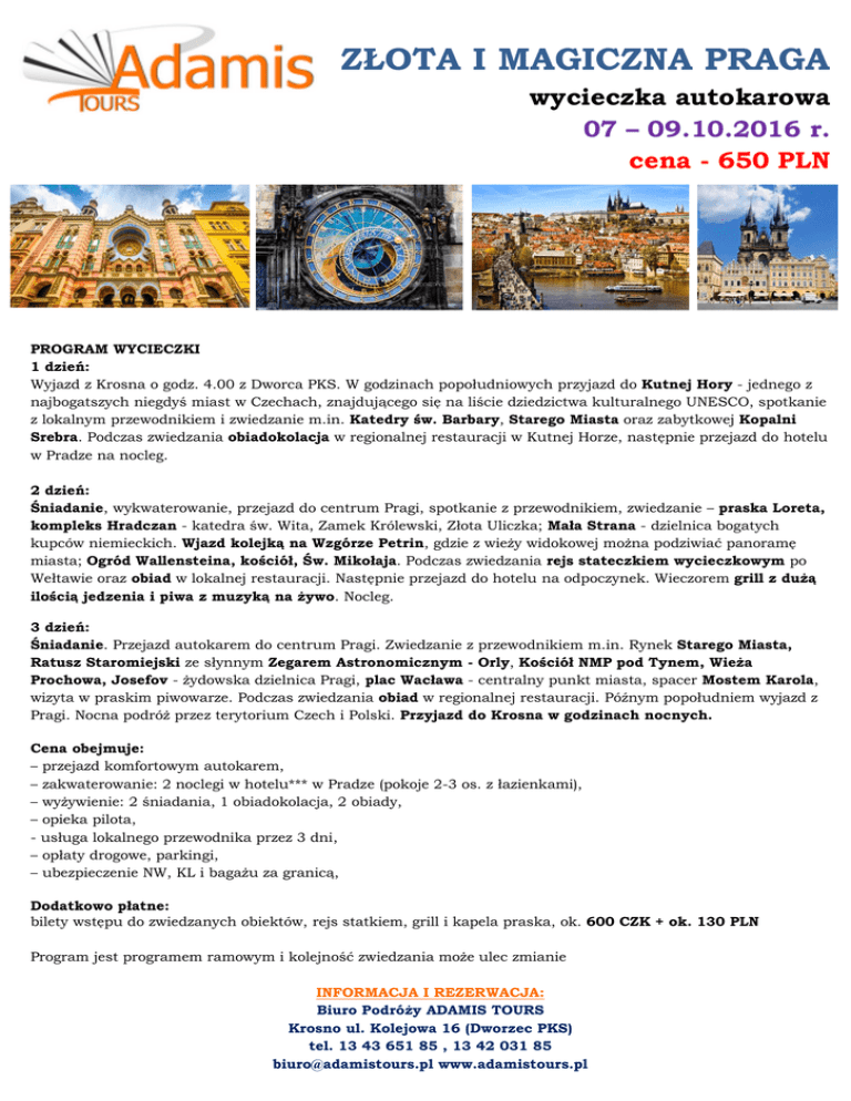 ZŁOTA I MAGICZNA PRAGA wycieczka autokarowa 07 – 09.10.2016 r. cena - 650 PLN PROGRAM WYCIECZKI 1 dzień: Wyjazd z Krosna o godz. 4.00 z Dworca PKS. W godzinach popołudniowych przyjazd do Kutnej Hory - jednego z najbogatszych niegdyś miast w Czechach, znajdującego się na liście dziedzictwa kulturalnego UNESCO, spotkanie z lokalnym przewodnikiem i zwiedzanie m.in. Katedry św. Barbary, Starego Miasta oraz zabytkowej Kopalni Srebra. Podczas zwiedzania obiadokolacja w regionalnej restauracji w Kutnej Horze, następnie przejazd do hotelu w Pradze na nocleg. 2 dzień: Śniadanie, wykwaterowanie, przejazd do centrum Pragi, spotkanie z przewodnikiem, zwiedzanie – praska Loreta, kompleks Hradczan - katedra św. Wita, Zamek Królewski, Złota Uliczka; Mała Strana - dzielnica bogatych kupców niemieckich. Wjazd kolejką na Wzgórze Petrin, gdzie z wieży widokowej można podziwiać panoramę miasta; Ogród Wallensteina, kościół, Św. Mikołaja. Podczas zwiedzania rejs stateczkiem wycieczkowym po Wełtawie oraz obiad w lokalnej restauracji. Następnie przejazd do hotelu na odpoczynek. Wieczorem grill z dużą ilością jedzenia i piwa z muzyką na żywo. Nocleg. 3 dzień: Śniadanie. Przejazd autokarem do centrum Pragi. Zwiedzanie z przewodnikiem m.in. Rynek Starego Miasta, Ratusz Staromiejski ze słynnym Zegarem Astronomicznym - Orly, Kościół NMP pod Tynem, Wieża Prochowa, Josefov - żydowska dzielnica Pragi, plac Wacława - centralny punkt miasta, spacer Mostem Karola, wizyta w praskim piwowarze. Podczas zwiedzania obiad w regionalnej restauracji. Późnym popołudniem wyjazd z Pragi. Nocna podróż przez terytorium Czech i Polski. Przyjazd do Krosna w godzinach nocnych. Cena obejmuje: – przejazd komfortowym autokarem, – zakwaterowanie: 2 noclegi w hotelu*** w Pradze (pokoje 2-3 os. z łazienkami), – wyżywienie: 2 śniadania, 1 obiadokolacja, 2 obiady, – opieka pilota, - usługa lokalnego przewodnika przez 3 dni, – opłaty drogowe, parkingi, – ubezpieczenie NW, KL i bagażu za granicą, Dodatkowo płatne: bilety wstępu do zwiedzanych obiektów, rejs statkiem, grill i kapela praska, ok. 600 CZK + ok. 130 PLN Program jest programem ramowym i kolejność zwiedzania może ulec zmianie INFORMACJA I REZERWACJA: Biuro Podróży ADAMIS TOURS Krosno ul. Kolejowa 16 (Dworzec PKS) tel. 13 43 651 85 , 13 42 031 85 [email protected] www.adamistours.pl