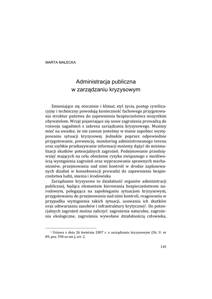 MARTA MAŁECKA Administracja publiczna w zarządzaniu kryzysowym Zmieniające się otoczenie i klimat, styl życia, postęp cywilizacyjny i techniczny powodują konieczność fachowego przygotowania struktur państwa do zapewnienia bezpieczeństwa wszystkim obywatelom. Wciąż pojawiające się nowe zagrożenia prowadzą do rozwoju zagadnień z zakresu zarządzania kryzysowego. Musimy mieć na uwadze, że nie zawsze jesteśmy w stanie zapobiec występowaniu sytuacji kryzysowej. Jednakże poprzez odpowiednie przygotowanie, prewencję, monitoring administrowanego terenu oraz szybkie przekazywanie informacji możemy dążyć do minimalizacji skutków potencjalnych zagrożeń. Podejmowanie przedsięwzięć mających na celu obniżenie ryzyka związanego z możliwością wystąpienia zagrożeń oraz wypracowanie sprawnych mechanizmów, przejmowania nad nimi kontroli w drodze zaplanowanych działań w konsekwencji prowadzi do zapewnienia bezpieczeństwa ludzi, mienia i środowiska Zarządzanie kryzysowe to działalność organów administracji publicznej, będąca elementem kierowania bezpieczeństwem narodowym, polegająca na zapobieganiu sytuacjom kryzysowym, przygotowaniu do przejmowania nad nimi kontroli, reagowaniu w przypadku wystąpienia takich sytuacji, usuwaniu ich skutków oraz odtwarzaniu zasobów i infrastruktury krytycznej1. Do potencjalnych zagrożeń można zaliczyć: zagrożenia naturalne, zagrożenia ekologiczne, zagrożenia wywołane działalnością człowieka, Ustawa z dnia 26 kwietnia 2007 r. o zarządzaniu kryzysowym (Dz. U. nr 89, poz. 590 ze zm.), art. 2. 1 145 Marta Małecka zagrożenia techniczne oraz zagrożenia wynikające z zachowań społecznych2. W polskim systemie zadania ochrony ludności przed różnego rodzaju zagrożeniami i niebezpiecznymi zdarzeniami spoczywają na wielu ośrodkach, strukturach władzy i administracji oraz na samorządach. Obowiązkiem administracji publicznej jest dysponowanie odpowiednimi do każdej sytuacji rozwiązaniami systemowymi, właściwym prawem oraz strukturami umożliwiającymi prawidłowe zarządzanie w sytuacjach kryzysowych3. Tradycyjna rola administracji publicznej sprowadza się między innymi do zarządzania bezpieczeństwem narodowym, czyli tworzenia warunków przetrwania i rozwoju państwa. Różne podmioty wyspecjalizowane w wykonywaniu poszczególnych zadań wykonują je w imieniu państwa na rzecz realizacji celów bezpieczeństwa narodowego. Działania w sytuacjach kryzysowych przebiegają w warunkach napięcia, stresu, znacznego ryzyka oraz ograniczonej informacji, dlatego też bardzo ważne jest posiadanie przez państwo, w tym głównie przez administrację rządową i samorządową odpowiednich do każdej sytuacji rozwiązań systemowych, odpowiedniego prawa, struktur i narzędzi pozwalających na sprawne działanie. Współczesne wymagania stawiane systemowi bezpieczeństwa kładą nacisk na jego spójność i jednolitość w koordynowaniu działań, procedur, planowania, łączności, wymiany informacji oraz szkolenia4. Jednym z podstawowych obowiązków głównych decydentów administracji samorządowej i rządowej jest wypracowanie oraz wdrożenie sprawnych rozwiązań podczas zapobiegania, przygo2 A. Gryguć, Organizacja i zadania Centrum Zarządzania Kryzysowego w powiecie i województwie, sposób tworzenia gminnego zespołu zarządzania kryzysowego oraz powiatowych i wojewódzkich zespołów zarządzania kryzysowego, materiały szkoleniowe, Warszawa 2012, s. 9. 3 J. Rogozińska-Mitrut, Podstawy zarządzania kryzysowego, Warszawa 2010, s. 9. 4 E. Bogacz-Wojtanowska, R. Dorczak, P. Florjanowicz-Błachut, P. Mikuli, A. Kurkiewicz, Zarządzanie kryzysowe w samorządzie, Warszawa 2008, s. 9. 146 Administracja publiczna w zarządzaniu kryzysowym towania oraz reagowania w sytuacji wystąpienia różnego rodzaju zagrożeń5. Aby uniknąć lub zminimalizować ewentualność wystąpienia sytuacji kryzysowej należy nauczyć się z nią postępować. Dlatego tak ważne w tym procesie jest podejście zgodne z czterema fazami – zapobiegania, przygotowania, reagowania i odbudowy. Faza zapobiegania – realizowana jest przed wystąpieniem zagrożenia i sytuacji kryzysowej. Ma na celu wyeliminowanie oraz redukowanie prawdopodobieństwa wystąpienia zagrożenia. Faza przygotowania – realizowana jest przed wystąpieniem sytuacji kryzysowej. To zbiór zaplanowanych przedsięwzięć mających na celu skuteczne przeciwdziałanie zagrożeniom poprzez przygotowanie organów zarządzających i elementów wykonawczych do sprawnego działania podczas wystąpienia kryzysu. Faza reagowania – w tej fazie podejmowane są działania w celu ograniczenia zniszczeń i strat oraz jak najszybszego przejęcia kontroli nad zaistniałą sytuacją kryzysową poprzez zorganizowane działania. Faza odbudowy – to ostatnia faza zarządzania kryzysowego. Polega na przywróceniu warunków sprzed wystąpienia sytuacji kryzysowej. Fazy te powiązane są ze sobą zależnością, gdzie każda z nich przechodzi w kolejną. Gdy zdarza się katastrofa, faza przygotowania przechodzi w fazę reagowania. Kolejno po katastrofie, faza reagowania przekształca się w fazę odbudowy. Podobnie odbudowa uruchamia zapobieganie, co ma na celu zapobieżenie katastrofie lub ograniczenie prawdopodobieństwa jej wystąpienia w przyszłości6. Cztery wiodące etapy muszą uwzględniać wszystkie rodzaje zagrożeń. Zarządzanie prowadzi do efektywnego zespolenia działań w ramach tych faz. Równocześnie tworzy partnerstwo poprzez motywowanie do działania społeczeństwa i innych stron uczestniczących w tym procesie. 5 6 A. Gryguć, Organizacja..., s. 3. J. Rogozińska-Mitrut, Podstawy..., s. 58. 147 Marta Małecka Powyższe polega na obniżeniu napięć i przeciwdziałaniu sytuacjom trudnym, o charakterze niekonfliktowym oraz przywracaniu stanu normalnego lub utrzymaniu go pomimo wystąpienia sytuacji kryzysowej7. Działania w sferze zarządzania kryzysowego p