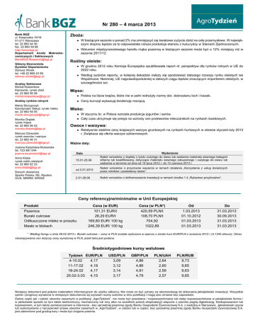 Nr 280 – 4 marca 2013 Bank BGŻ ul. Kasprzaka 10/16 01-211 Warszawa tel. 22 860 44 00 fax. 22 860 58 68 http://www.bgz.pl Departament Analiz Makroekonomicznych i Sektorowych [email protected] Główny Ekonomista Dyrektor Departamentu Dariusz Winek tel. +48 22 860 43 56 [email protected] Analizy Sektorowe Michał Koleśnikow Kierownik, rynek zbóż tel. 22 860 50 58 [email protected] Zboża: • W bieżacym ˛ sezonie o ponad 2% ma zmniejszyć sie˛ światowe zużycie zbóż na cele przemysłowe. W najwiek˛ szym stopniu bedzie ˛ za to odpowiadała niższa produkcja etanolu z kukurydzy w Stanach Zjednoczonych. • Wolumen miedzynarodowego ˛ handlu maka ˛ pszenna˛ w bieżacym ˛ sezonie może być o 12% mniejszy niż w sezonie 2011/12. Rośliny oleiste: • W grudniu 2012 roku Komisja Europejska opublikowała raport nt. perspektyw dla rynków rolnych w UE do 2022 roku. • Według autorów raportu, w kolejnej dekadzie należy sie˛ spodziewać dalszego rozwoju rynku oleistych we Wspólnocie. Niemniej, UE najprawdopodobniej w dalszym ciagu ˛ bedzie ˛ znaczacym ˛ importerem oleistych, w szczególności soi. Mieso: ˛ • Polska na liście krajów, które nie w pełni wdrożyły normy dot. dobrostanu loch i loszek. • Ceny kurczat ˛ wykazuja˛ tendencje˛ rosnac ˛ a. ˛ Analizy rynków rolnych Marta Skrzypczyk Koordynator Sekcji; rynek mleka tel. 22 860 59 55 [email protected] Monika Drażek ˛ rynek miesa ˛ tel. 22 860 56 53 [email protected] Mariusz Dziwulski rynek owoców i warzyw tel. 22 860 46 31 [email protected] Joanna Karpińska-Klukowska tel. 723 981 044 [email protected] Anna Kitala rynek roślin oleistych tel. 22 860 52 23 [email protected] Danych dostarcza: Sparks Polska, KE, Reuters GUS, MRiRW, IERiGŻ Mleko: • W styczniu br. w Polsce wzrosła produkcja jogurtów i serów. • Cały czas utrzymuje sie˛ presja na wzrosty cen przetworów mleczarskich na rynkach światowych. Owoce i warzywa: • Relatywnie stabilne ceny krajowych warzyw gruntowych na rynkach hurtowych w okresie styczeń-luty 2013 r. Zwieksza ˛ sie˛ oferta warzyw szklarniowych. Ważne daty: Wydarzenie Nabór wniosków o dopłaty z tytułu zużytego do siewu lub sadzenia materiału siewnego kategorii elitarny lub kwalifikowany, dotyczace ˛ materiału siewnego zakupionego i zużytego do siewu lub sadzenia w terminie od dnia od 15 lipca 2012 r. do 15 czerwca 2013 r. Data 15.01-25.06 od 2.01.2013 Nabór wniosków o przyznanie wsparcia w ramach działania „Korzystanie z usług doradczych przez rolników i posiadaczy lasów“. 2.01-28.06 Nabór wniosków o dofinansowanie inwestycji w ramach środka 1.4 „Rybactwo przybrzeżne“. Ceny referencyjne/minimalne w Unii Europejskiej Produkt Pszenica Buraki cukrowe Odtłuszczone mleko w proszku Masło w blokach ∗ Cena (w EUR) 101,31 EUR/t 26,29 EUR/t 169,80 EUR/ 100 kg 246,39 EUR/ 100 kg Cena (w PLN*) 420,59 PLN/t 108,70 PLN/t 704,92 1022,89 Od 1.03.2013 01.10.2012 01.03.2013 01.03.2013 Do 31.03.2013 30.09.2013 31.03.2013 31.03.2013 Według fixingu z dnia 28.02.2013 r. Buraki cukrowe – cena w PLN została wyliczona w oparciu o średni kurs EUR/PLN z września 2012 r (4,1345 zł/euro). Okres obowiazywania ˛ cen dotyczy ceny wyrażonej w PLN, jeżeli taka jest podana. Średniotygodniowe kursy walutowe Tydzień EUR/PLN 4-10.02 4,17 11-17.02 4,18 18-24.02 4,17 25.02-3.03 4,15 USD/PLN 3,09 3,12 3,14 3,17 GBP/PLN 4,86 4,86 4,81 4,79 PLN/UAH 2,64 2,60 2,59 2,57 PLN/RUB 9,73 9,65 9,63 9,65 Niniejszy dokument jest jedynie materiałem informacyjnym do użytku odbiorcy. Nie może on być uznany za rekomendacje˛ do dokonania jakiejkolwiek inwestycji. Wszystkie opinie i prognozy wyrażone w niniejszym dokumencie sa˛ wyrazem oceny autorów w dniu publikacji i moga˛ ulec zmianie bez zapowiedzi. Żadna cz˛eść jak i całość utworów zawartych w publikacji „AgroTydzień”, nie może być powielana i rozpowszechniania lub dalej rozpowszechniana w jakiejkolwiek formie i w jakikolwiek sposób (w tym także elektroniczny, mechaniczny lub inny albo na wszelkich polach eksploatacji) włacznie ˛ z szeroko pojet ˛ a˛ digitalizacja, ˛ fotokopiowaniem lub kopiowaniem, w tym także zamieszczaniem w Internecie - bez uprzedniej pisemnej zgody Banku Gospodarki Żywnościowej S.A. z siedziba˛ w Warszawie. Jakiekolwiek użycie lub wykorzystanie z naruszeniem prawa utworów zawartych w „AgroTydzień”, w całości lub w cz˛eści, bez uprzedniej pisemnej zgody Banku Gospodarki Żywnościowej S.A. jest zabronione pod groźba˛ kary i może być ścigane prawnie. Nr 280 – 4 marca 2013 Zboża Rynek światowy Zużycie przemysłowe zbóż na świecie W bieżacym ˛ sezonie o ponad 2% ma zmniejszyć sie˛ światowe zużycie zbóż na cele przemysłowe. W najwiekszym ˛ stopniu bedzie ˛ za to odpowiadała niższa produkcja etanolu z kukurydzy w Stanach Zjednoczonych. Według Miedzynarodowej ˛ Rady Zbożowej w sezonie 2012/13 zużycie zbóż na cele przemysłowe na świecie wyniesie blisko 299 mln t, w porównaniu z 306 mln t w sezonie poprzednim, co oznacza spadek o 2,3%. Wśród zastosowań przemysłowych prym wiedzie produkcja etanolu dodawanego do biopaliw. Na ten cel w sezonie 2012/13 zużyte ma zostać 137 mln t zbóż. Niemniej jednak, jest to i tak o 7% mniej niż w sezonie poprzednim. Najwiekszym ˛ producentem biopaliw ze zbóż sa˛ Stany Zjednoczone. W bieżacym ˛ sezonie tamtejszy przemysł ma na ten cel zużyć aż 114 mln t kukurydzy. Jednakże ilość ta i tak ma być aż o 13 mln t (10%) niższa niż w sezonie 2011/12. Od połowy 2012 r. rentowność produkcji etanolu jest pod silna˛ presja. ˛ Z jednej strony po katastrofalnej suszy bardzo wysokie sa˛ ceny kukurydzy, z drugiej zaś słaby jest popyt na benzyne, ˛ co jest wyrazem niewystarczajaco ˛ dobrej sytuacji amerykańskiej gospodarki. Inne regiony świata odgrywaja˛ znacznie mniejsza˛ role˛ w produkcji biopaliw ze zbóż, natomiast notuja˛ jej wzrost. W UE zużycie zbóż ma w bieżacym ˛ 