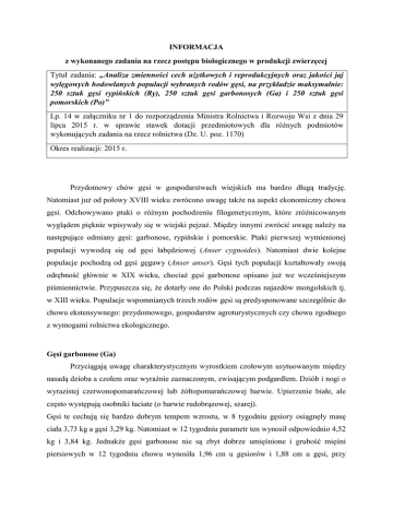 INFORMACJA z wykonanego zadania na rzecz postępu biologicznego w produkcji zwierzęcej Tytuł zadania: „Analiza zmienności cech użytkowych i reprodukcyjnych oraz jakości jaj wylęgowych hodowlanych populacji wybranych rodów gęsi, na przykładzie maksymalnie: 250 sztuk gęsi rypińskich (Ry), 250 sztuk gęsi garbonosych (Ga) i 250 sztuk gęsi pomorskich (Po)” Lp. 14 w załączniku nr 1 do rozporządzenia Ministra Rolnictwa i Rozwoju Wsi z dnia 29 lipca 2015 r. w sprawie stawek dotacji przedmiotowych dla różnych podmiotów wykonujących zadania na rzecz rolnictwa (Dz. U. poz. 1170) Okres realizacji: 2015 r. Przydomowy chów gęsi w gospodarstwach wiejskich ma bardzo długą tradycję. Natomiast już od połowy XVIII wieku zwrócono uwagę także na aspekt ekonomiczny chowu gęsi. Odchowywano ptaki o różnym pochodzeniu filogenetycznym, które zróżnicowanym wyglądem pięknie wpisywały się w wiejski pejzaż. Między innymi zwrócić uwagę należy na następujące odmiany gęsi: garbonose, rypińskie i pomorskie. Ptaki pierwszej wymienionej populacji wywodzą się od gęsi łabędziowej (Anser cygnoides). Natomiast dwie kolejne populacje pochodzą od gęsi gęgawy (Anser anser). Gęsi tych populacji kształtowały swoją odrębność głównie w XIX wieku, chociaż gęsi garbonose opisano już we wcześniejszym piśmiennictwie. Przypuszcza się, że dotarły one do Polski podczas najazdów mongolskich tj. w XIII wieku. Populacje wspomnianych trzech rodów gęsi są predysponowane szczególnie do chowu ekstensywnego: przydomowego, gospodarstw agroturystycznych czy chowu zgodnego z wymogami rolnictwa ekologicznego. Gęsi garbonose (Ga) Przyciągają uwagę charakterystycznym wyrostkiem czołowym usytuowanym między nasadą dzioba a czołem oraz wyraźnie zaznaczonym, zwisającym podgardlem. Dziób i nogi o wyrazistej czerwonopomarańczowej lub żółtopomarańczowej barwie. Upierzenie białe, ale często występują osobniki łaciate (o barwie rudobrązowej, szarej). Gęsi te cechują się bardzo dobrym tempem wzrostu, w 8 tygodniu gęsiory osiągnęły masę ciała 3,73 kg a gęsi 3,29 kg. Natomiast w 12 tygodniu parametr ten wynosił odpowiednio 4,52 kg i 3,84 kg. Jednakże gęsi garbonose nie są zbyt dobrze umięśnione i grubość mięśni piersiowych w 12 tygodniu chowu wynosiła 1,96 cm u gęsiorów i 1,88 cm u gęsi, przy długości grzebienia mostka wynoszącej odpowiednio16,33 cm i 15,36 cm. Nie zaleca się tych ptaków do prowadzenia tuczu owsianego. Produkcji nieśna tych ptaków trwała 20 tygodni i w tym okresie zniosły blisko 50 jaj (49,65) o średniej masie 167 g. Przy zestawieniu stadka w proporcji 1 gęsior na 4 gęsi, zapłodnienie było bardzo dobre i wyniosło 95,50% a wskaźnik wylęgowości z jaj nałożonych 77,09%. Gęsiory cechowały się lepszą przeżywalnością, wynoszącą w okresach wychowu 97,30 % i reprodukcji 98,25 %. Wskaźnik ten dla samic był gorszy odpowiednio o 0,68 p.p. i 1,4 p.p. Fot. E. Gornowicz i R. Zwierzyński Fot. 1. Gęsi garbonose (Ga) – w 2015 roku zdobyły złoty medal w grupie gęsi ras rodzimych oraz złoty medal i tytuł czempiona w kategorii gęsi (XXVII Krajowa Wystawa Zwierząt Hodowlanych i Wystawa Ras Rodzimych – Poznań) Gęsi pomorskie (Po) Ptaki te charakteryzują się walcowatoowalnym tułowiem, o pełnej piersi i brzuchu, z podbrzuszem zaznaczonym jedną fałdą tłuszczową. Dziób i nogi są dobrze wykształcone oraz silne, w kolorze pomarańczowoczerwonym. Najczęściej są spotykane osobniki białe (o oczach jasnoniebieskich), rzadziej siodłate (o oczach brązowozłocistych). W 8 tygodniu odchowu masa ciała gęsiorów wyniosła 4,03 kg i gęsi 3,43 kg, a po kolejnych czterech tygodniach wyniosła odpowiednio 4,47 kg i 3,68 kg. Skrzydła i grzebień mostka są stosunkowo długie. W 12 tygodniu odchowu długość przedramienia wyniosła 18,39 cm u gęsiorów i 17,03 cm u gęsi, w związku z czym skrzydła były dość wysoko osadzone, ale dobrze przylegały do tułowia. Natomiast długość grzebienia mostka w 12 tygodniu chowu kształtowała się na poziomie 17,22 cm (samce) i 15,81 cm (samice) przy grubości mięśni piersiowych odpowiednio 2,00 cm i 1,95 cm. Ptaki te bardzo dobrze nadają się do tuczu owsianego. Okres produkcji jaj gęsi Po trwał 21 tygodni, a do 20 tygodnia produkcji gęsi zniosły 46,99 jaj o średniej masie 175 g i przy zapłodnieniu 92,08 %. Gęsi te cechowały się nieznacznie gorszą przeżywalnością w okresie reprodukcji, średnia 95,60%. Fot. E. Gornowicz Fot. 2. Gęsi pomorskie (Po) – cechują się długimi i wysoko osadzonymi skrzydłami Gęsi rypińskie (Ry) Ptaki te określane są jako średniej wielkości i taki jest też ich tułów o zaokrąglonym grzbiecie. Nogi są mocne i szeroko rozstawione o barwie, tak jak i dziób, pomarańczowoczerwonej. Ich upierzenie jest przeważnie białe, ale występują osobniki o pojedynczych szarych piórach i łaciate. W 12 tygodniu odchowu charakteryzowały się najmniejszą różnicą masy ciała między samcami (4,39 kg) a samicami (3,95 kg) oraz zwartą budową tułowia (długość grzebienia mostka 16,02 cm u gęsiorów i 15,07 cm u gęsi). Grubość mięśni piersiowych w 12 tygodniu odchowu wynosząca u samców 2,21 cm a u samic 2,13 cm, świadczy o ich bardzo dobrym uformowaniu. W ciągu 21 tygodni produkcji nieśnej gęsi te zniosły poniżej 40 jaj o masie 163 g, cechujących się jednakże dobrym wskaźnikiem wylęgowości z jaj nałożonych (80,41 %). Przeżywalność gęsi Ry w całym okresie badań zawierała się od 96,15 % do 99,58 %. Populacje gęsi rypińskich (Ry), garbonosych (Ga) i pomorskich (Po) charakteryzują się wysokim wskaźnikiem przeżywalności oraz dobrymi przyrostami masy ciała, co szczególnie predysponuje je do chowu ekstensywnego: przydomowego, gospodarstw agroturystycznych czy chowu zgodnego z wymogami rolnictwa ekologicznego. Fot. E. Gornowicz Fot. 3. Gęsi rypińskie (Ry) – charakteryzu