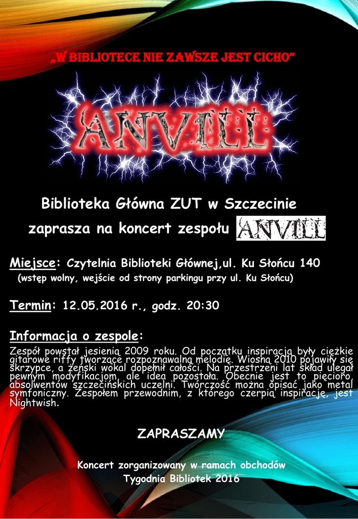 „W bibliotece nie zawsze jest cicho” Biblioteka Główna ZUT w Szczecinie zaprasza na koncert zespołu Miejsce: Czytelnia Biblioteki Głównej,ul. Ku Słońcu 140 (wstęp wolny, wejście od strony parkingu przy ul. Ku Słońcu) Termin: 12.05.2016 r., godz. 20:30 Informacja o zespole: Zespół powstał jesienią 2009 roku. Od początku inspiracją były ciężkie gitarowe riffy tworzące rozpoznawalną melodię. Wiosną 2010 pojawiły się skrzypce, a żeński wokal dopełnił całości. Na przestrzeni lat skład ulegał pewnym modyfikacjom, ale idea pozostała. Obecnie jest to pięcioro, absolwentów szczecińskich uczelni. Twórczość można opisać jako metal symfoniczny. Zespołem przewodnim, z którego czerpią inspirację, jest Nightwish. ZAPRASZAMY Koncert zorganizowany w ramach obchodów Tygodnia Bibliotek 2016